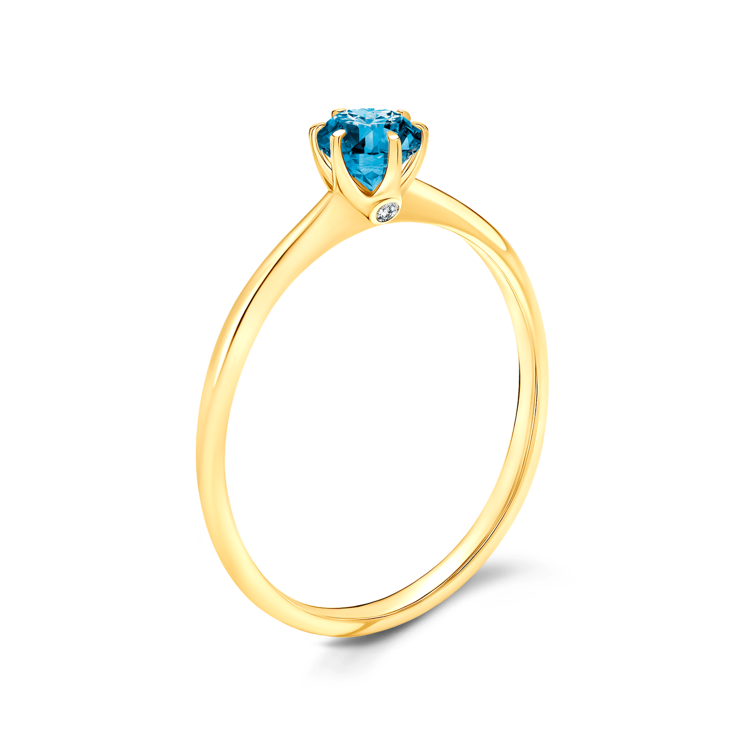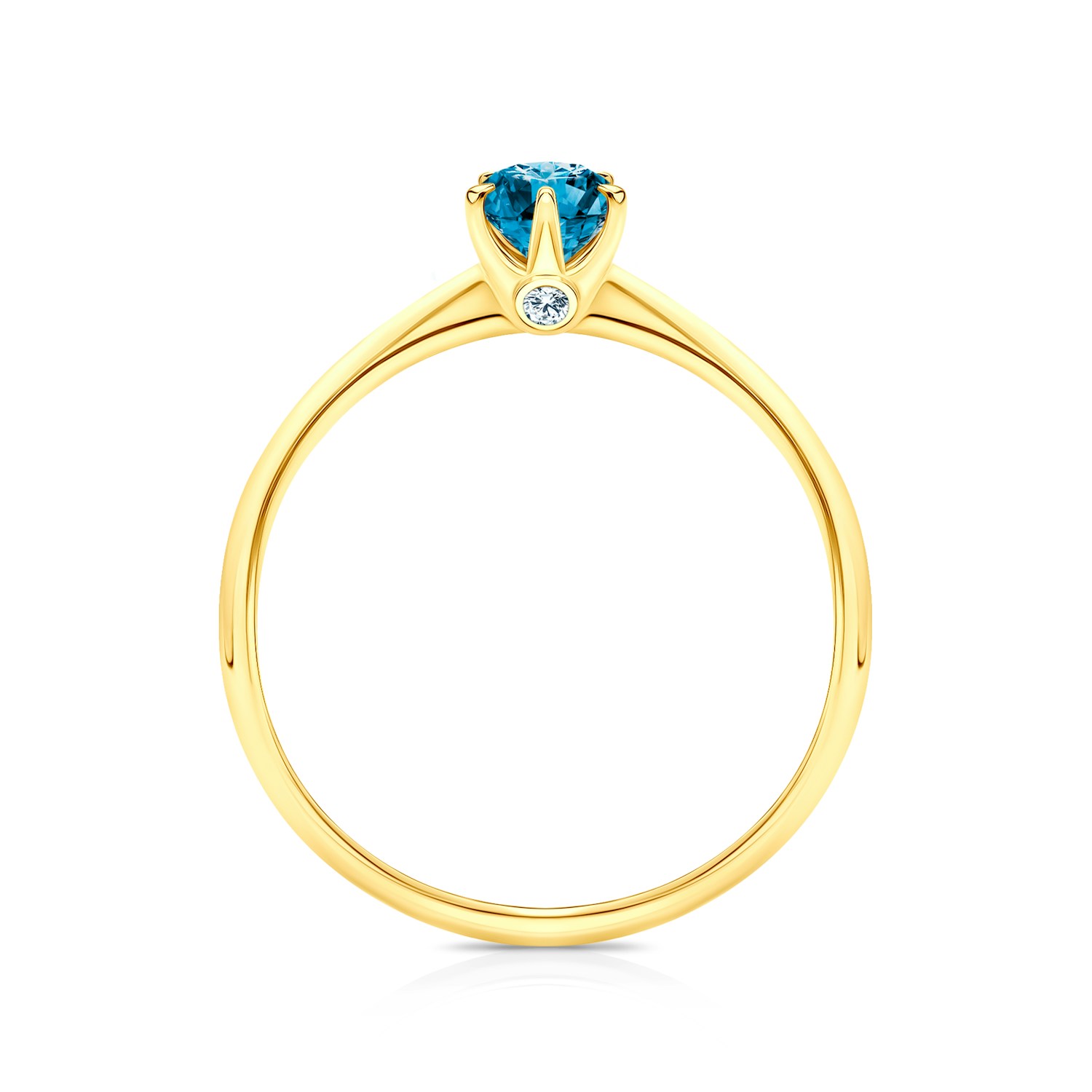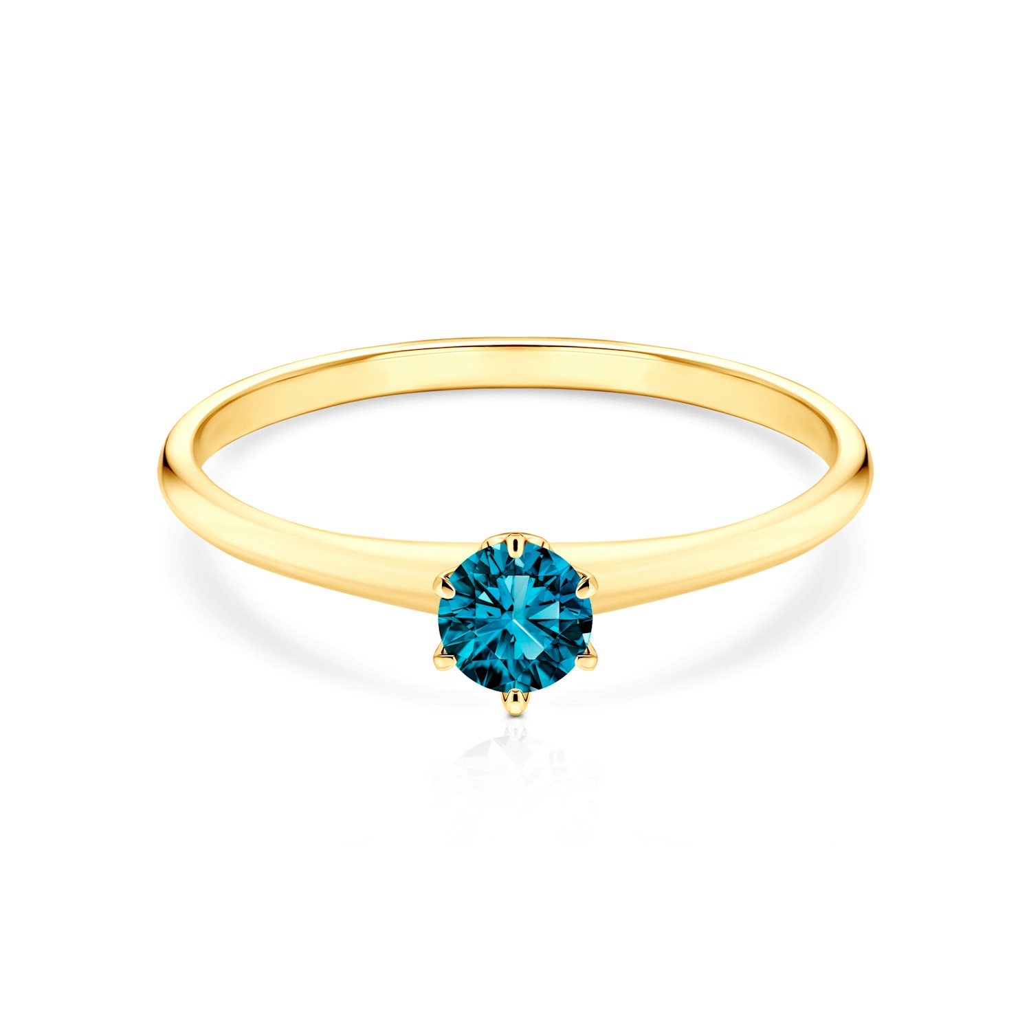 Pierścionek zaręczynowy z centralnie umieszczonym niebieskim diamentem o masie 0,15 ct oraz dwoma diamentami o łącznej masie 0,015 ct, wysokiej czystości SI/H, o szlifie brylantowym. Wykonany z 14-karatowego żółtego złota (próba 0,585).