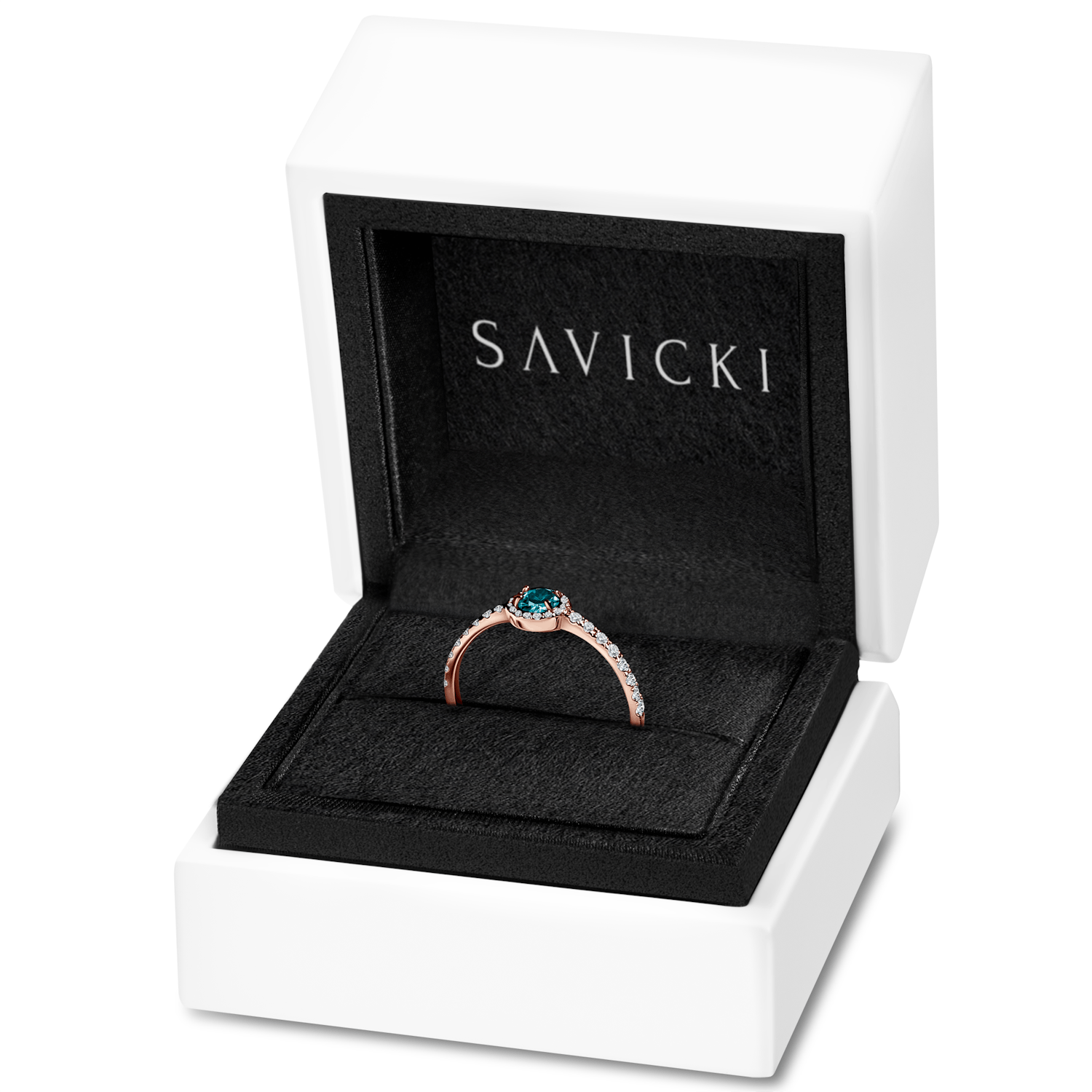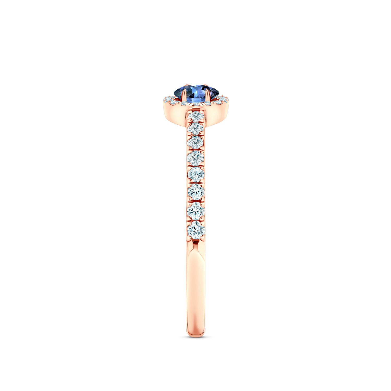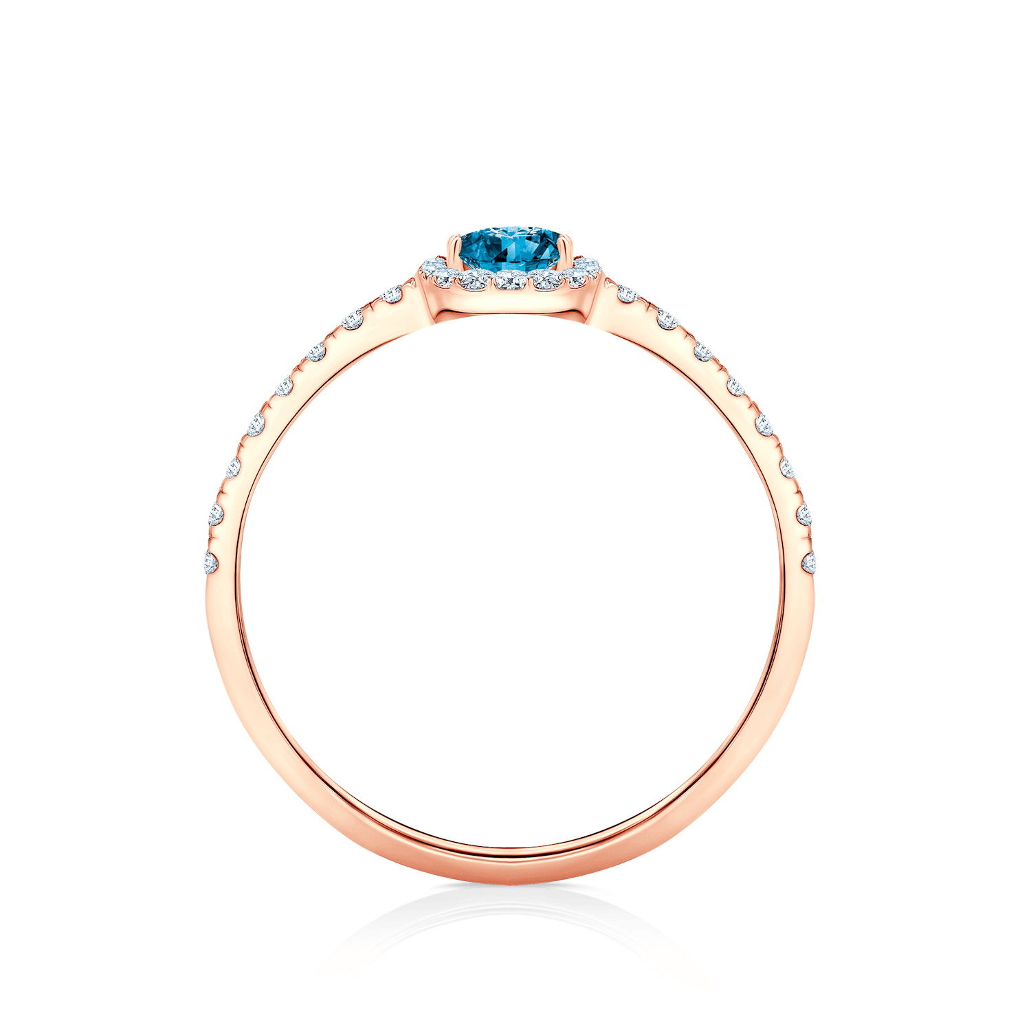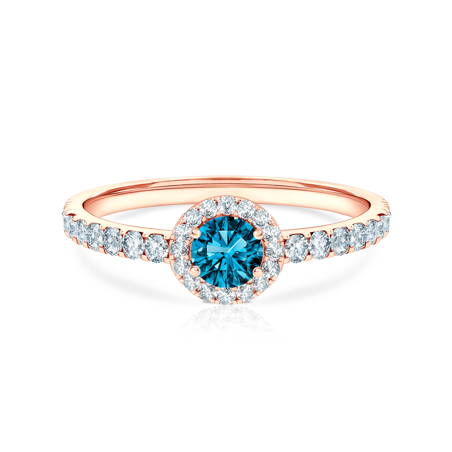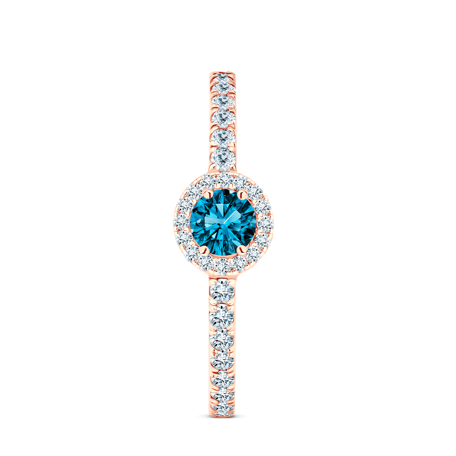 Pierścionek zaręczynowy z centralnym niebieskim diamentem o masie 0,15 ct oraz bocznymi diamentami o łącznej masie 0,19 ct wysokiej czystości SI/H, o szlifie brylantowym. Wykonany z 14-karatowego różowego złota (próba 0,585).
