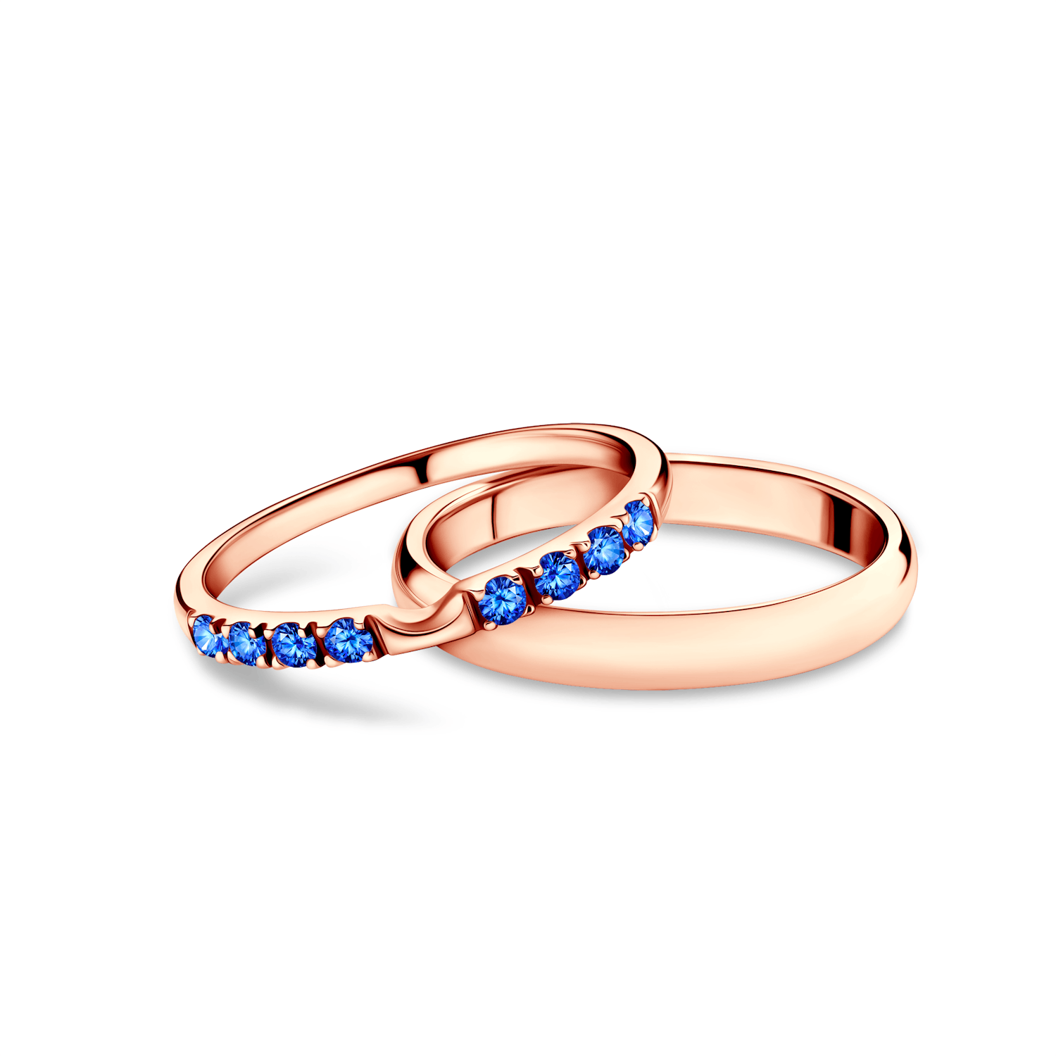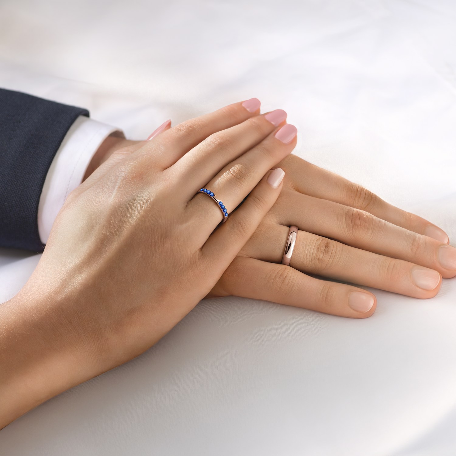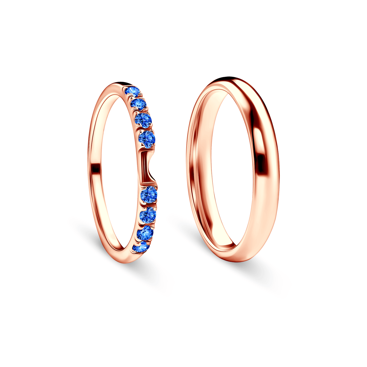Specjalnie wyprofilowana obrączka idealnie wpasowuje się w pierścionek zaręczynowy, tworząc jedyną taką kompozycję biżuterii.