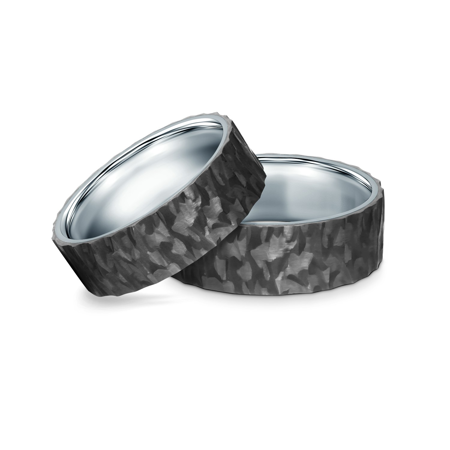 Obrączki ślubne płaskie wykonane z carbonu i tytanu.