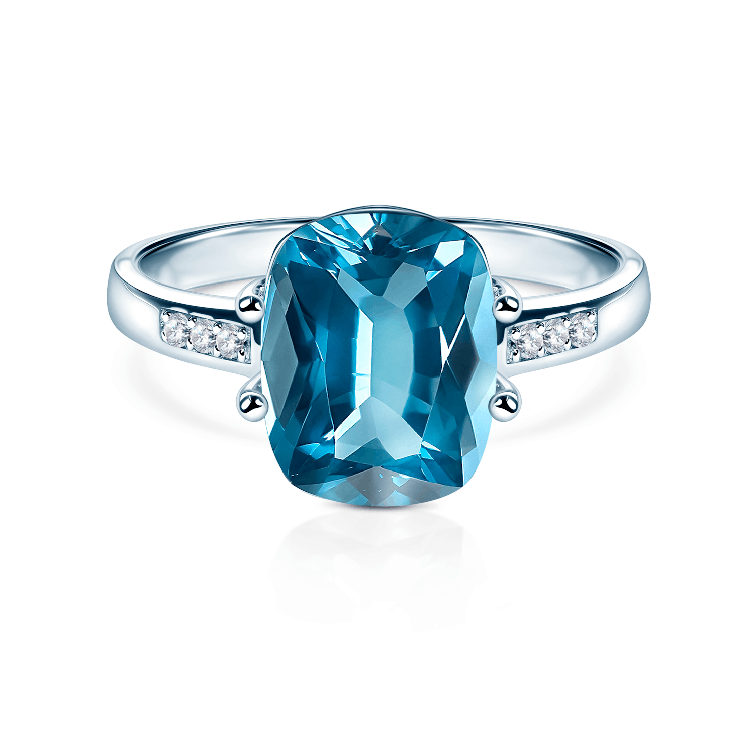 Pierścionek zaręczynowy z topaz 2,4ct w szlifie szmaragdowym i diamentami dodatkowymi o łącznej masie ok. 0,03 w szlifie brylantowym, wykonany z 14-karatowego białego złota (próba 0,585).