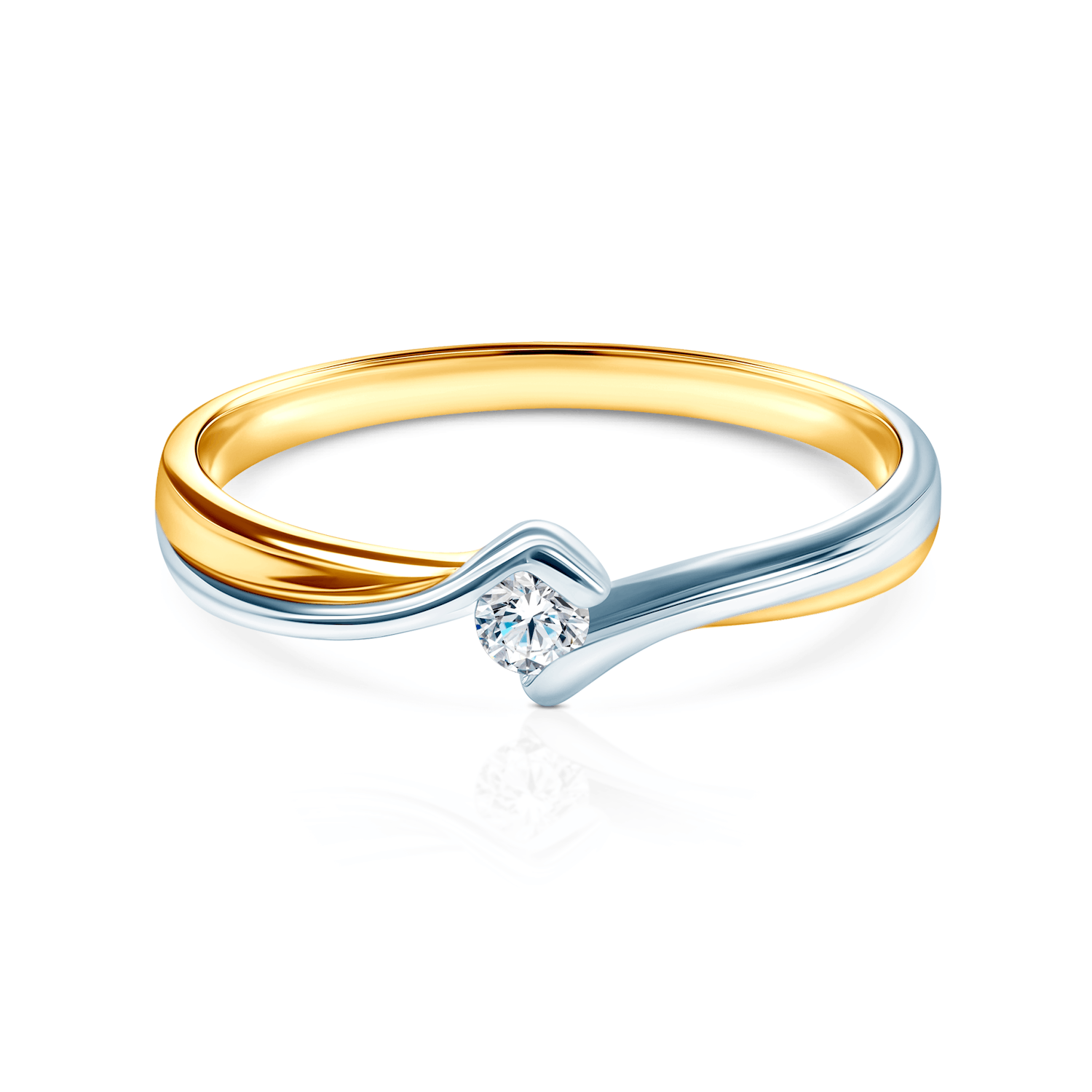Pierścionek zaręczynowy z diamentem głównym o masie 0,04ct w szlifie brylantowym wysokiej czystości SI2/H, wykonany z 14-karatowego żółtego złota (próba 0,585).