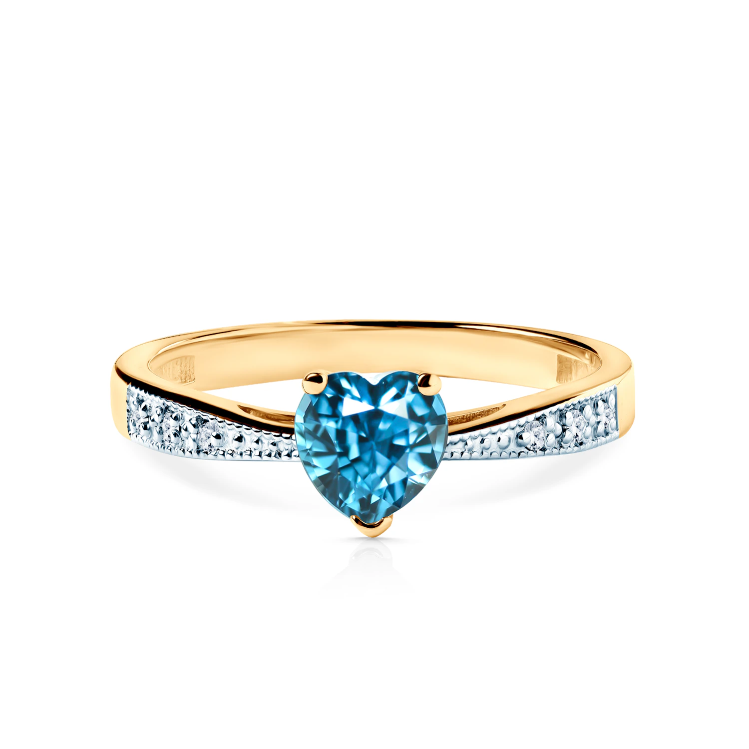 Pierścionek zaręczynowy z topazem o masie 0,5ct w szlifie serce i diamentami bocznymi o łącznej masie 0,03ct w szlifie brylantowym wysokiej czystości SI2/H, wykonany z 14-karatowego żółtego złota (próba 0,585).