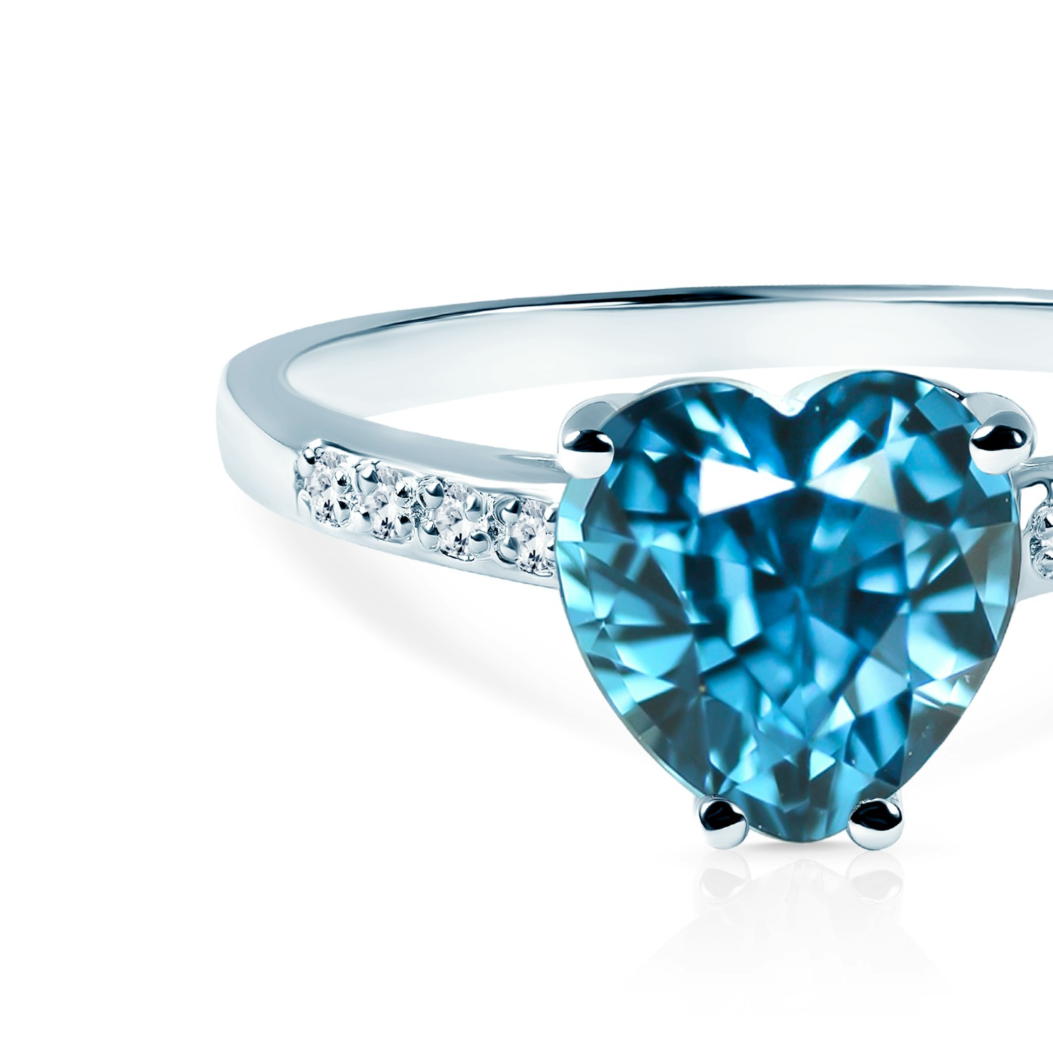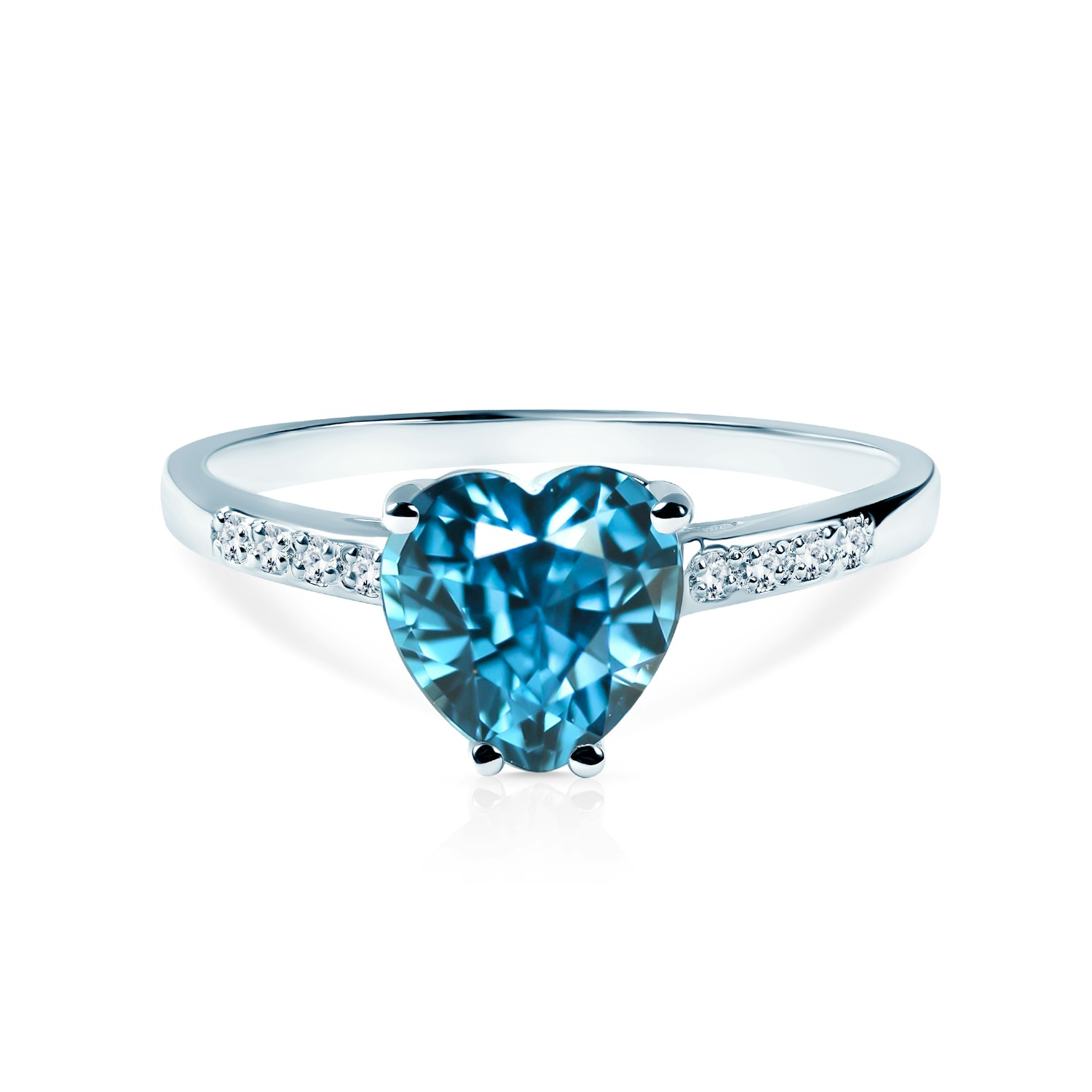 Pierścionek zaręczynowy z topazem o masie 1,2ct w szlifie serce i diamentami bocznymi o łącznej masie 0,04ct w szlifie brylantowym wysokiej czystości SI2/H, wykonany z 14-karatowego białego złota (próba 0,585).
