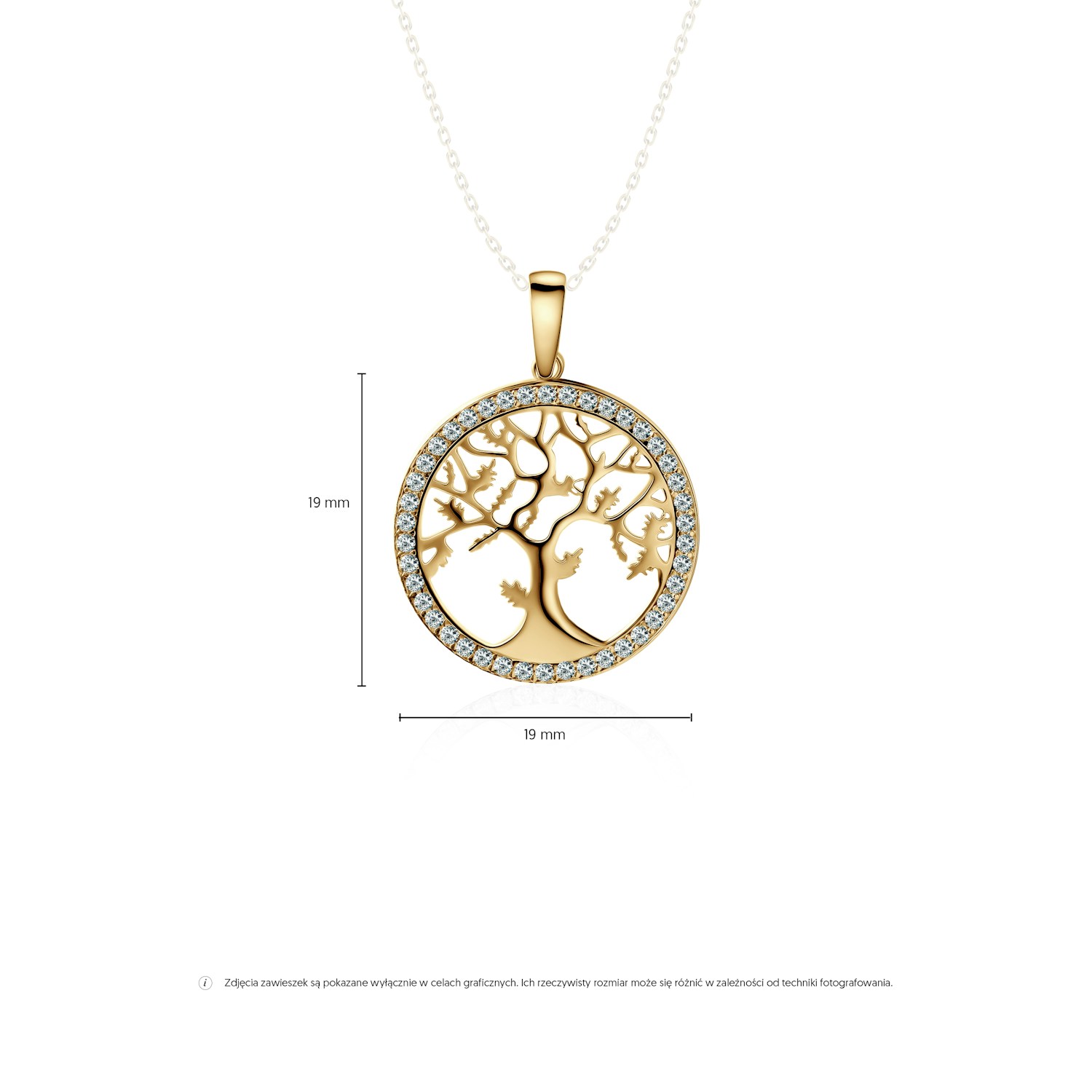 Okrągła forma o średnicy 19 mm otoczona jest 44 cyrkoniami o brylantowym szlifie, które dodają jej subtelnego blasku.