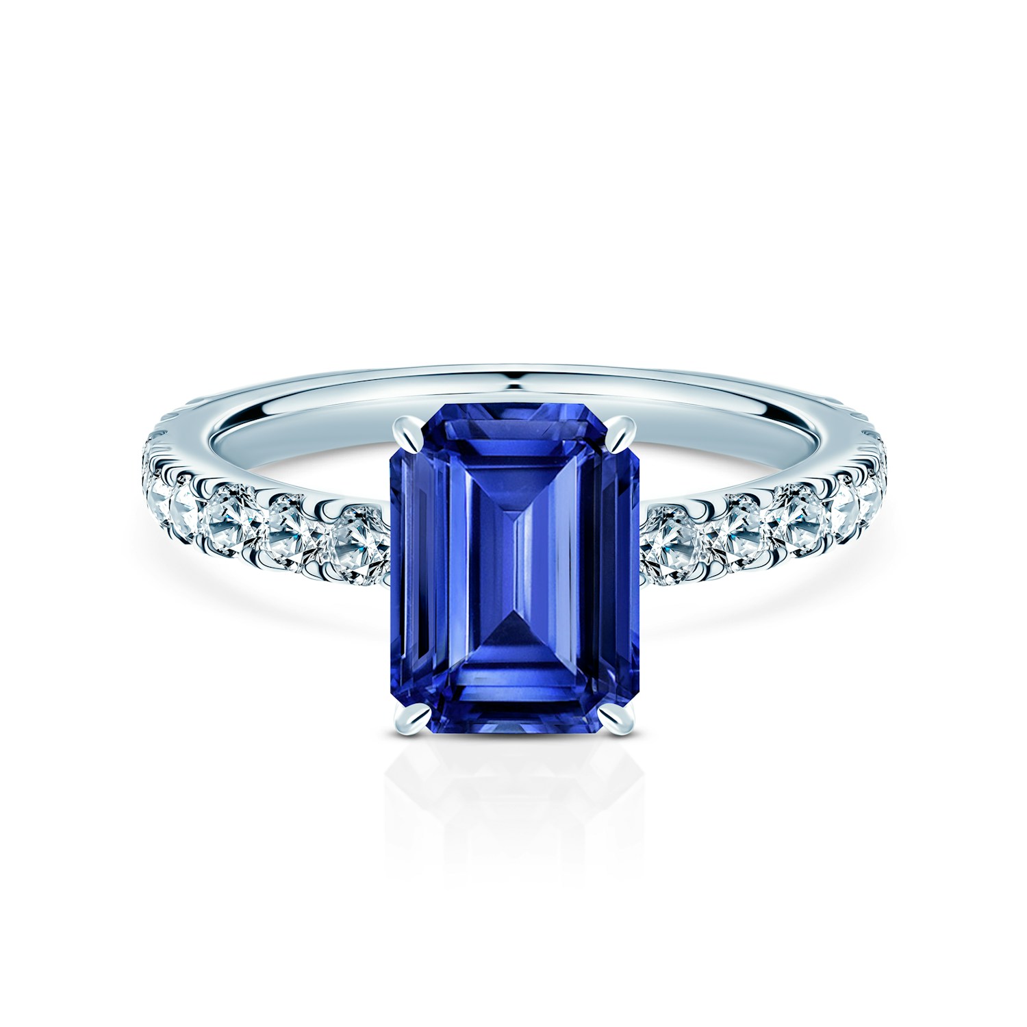 Pierścionek Savicki wykonany z 14-karatowego białego złota (próba 0,585). Centralny niebieski szafir o masie 2,12ct oraz 16 diamentów SI2/H o łącznej masie 0,56ct.