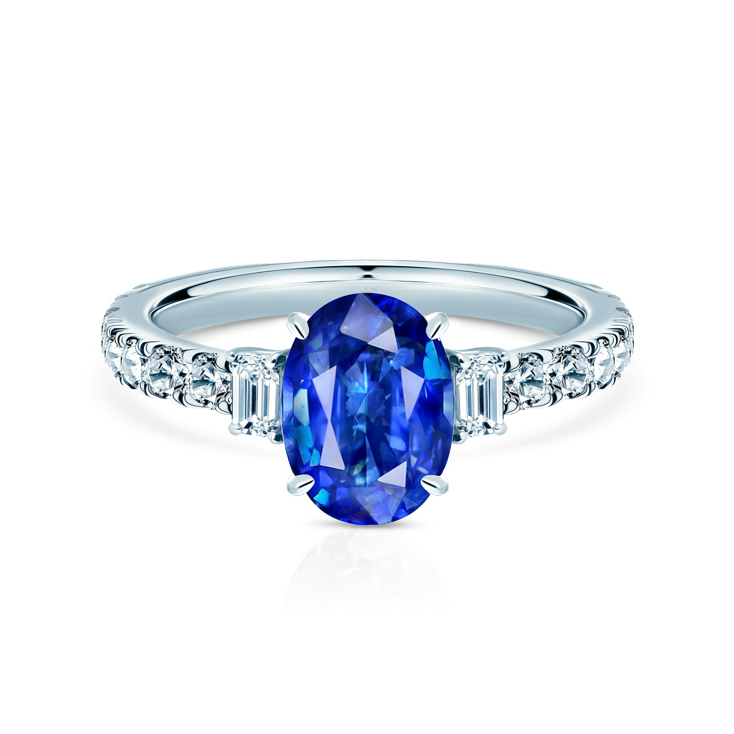 Pierścionek Savicki wykonany z 14-karatowego białego złota (próba 0,585). Centralny niebieski szafir o masie 2,10ct oraz 2 diamenty SI2/H o łącznej masie 0,30ct oraz 14 diamentów SI2/H o łącznej masie 0,28ct.
