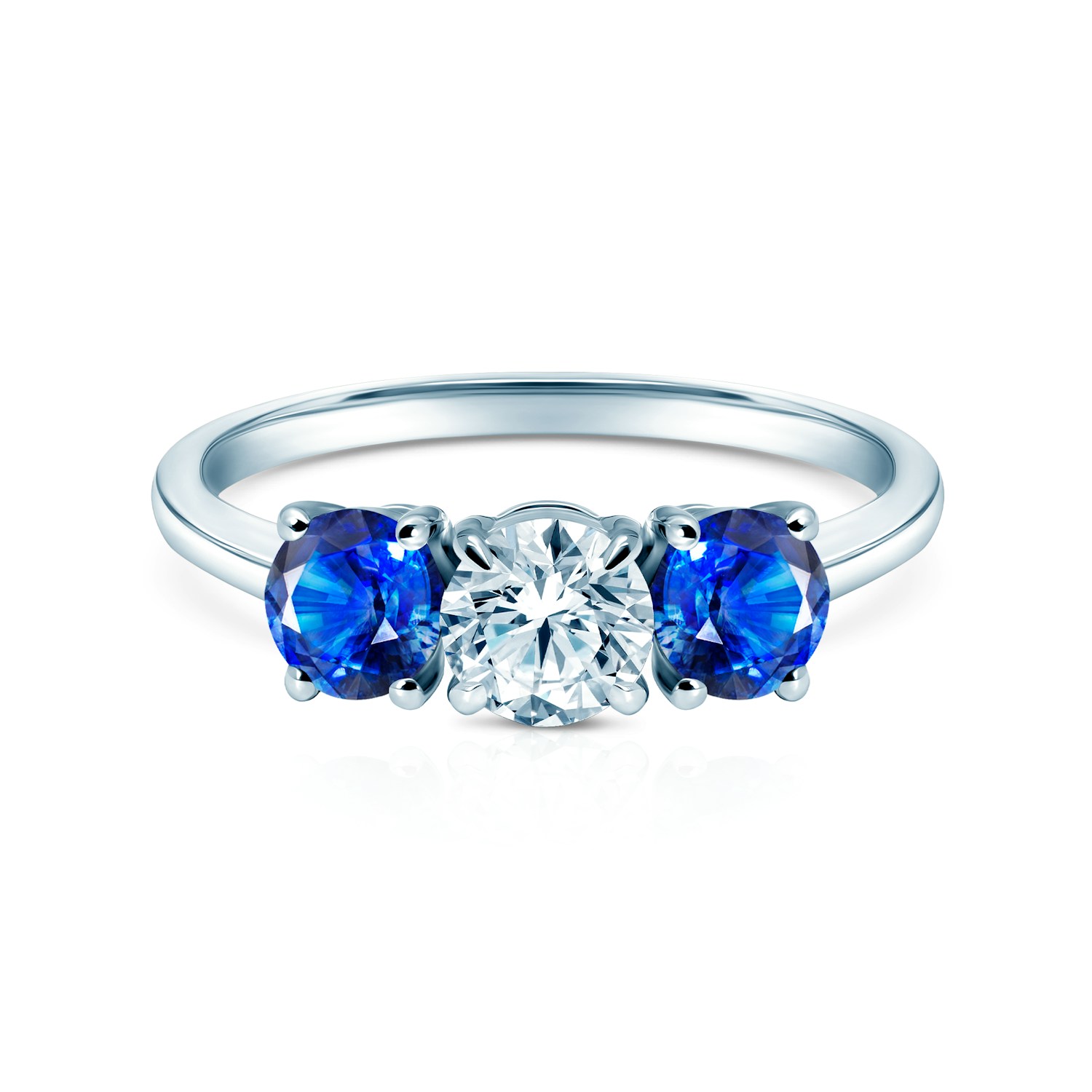 Pierścionek Savicki wykonany z 14-karatowego białego złota (próba 0,585). Centralny diament o masie 0,47ct SI2/H oraz 2 niebieskie szafiry o łącznej masie 0,80ct.