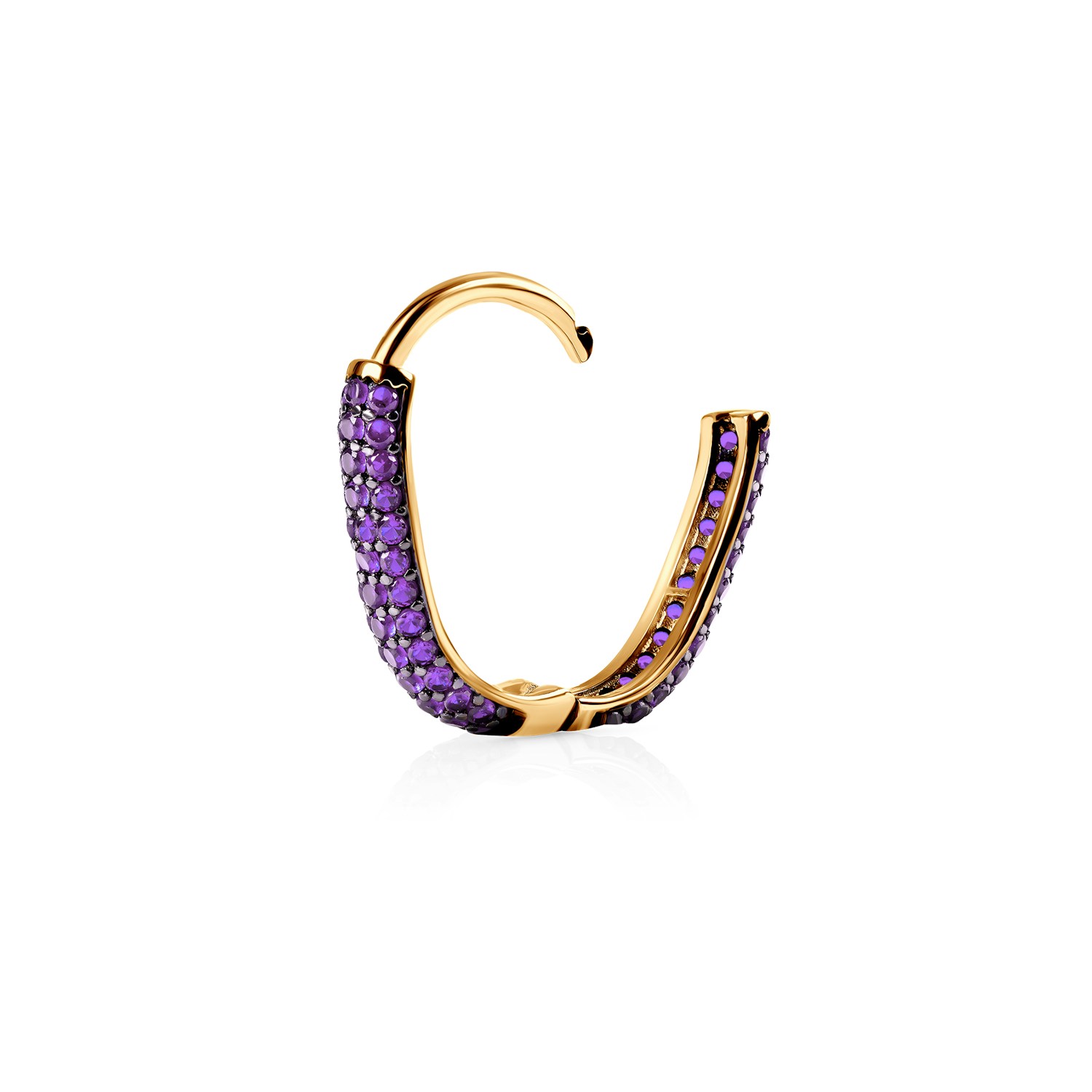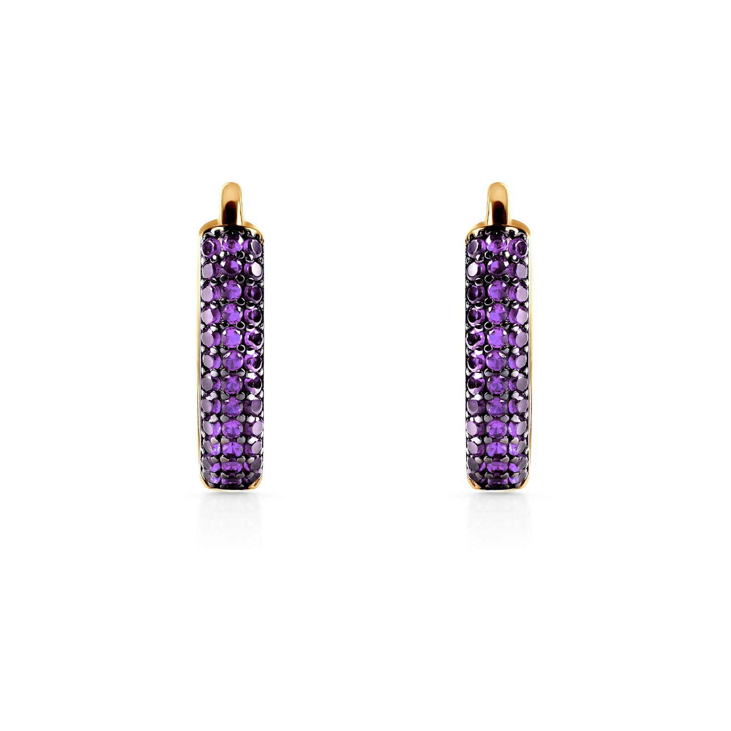 Kolczyki z żółtego złota 585 zdobione fioletowymi cyrkoniami to biżuteria, która przyciąga spojrzenia głębią koloru i dopracowaną formą. Zatrzaskowe zapięcie zapewnia komfort, a symetryczny układ kamieni w geometrycznej oprawie nadaje całości luksusowego wyrazu. Idealne dla kobiet, które cenią odważną elegancję.