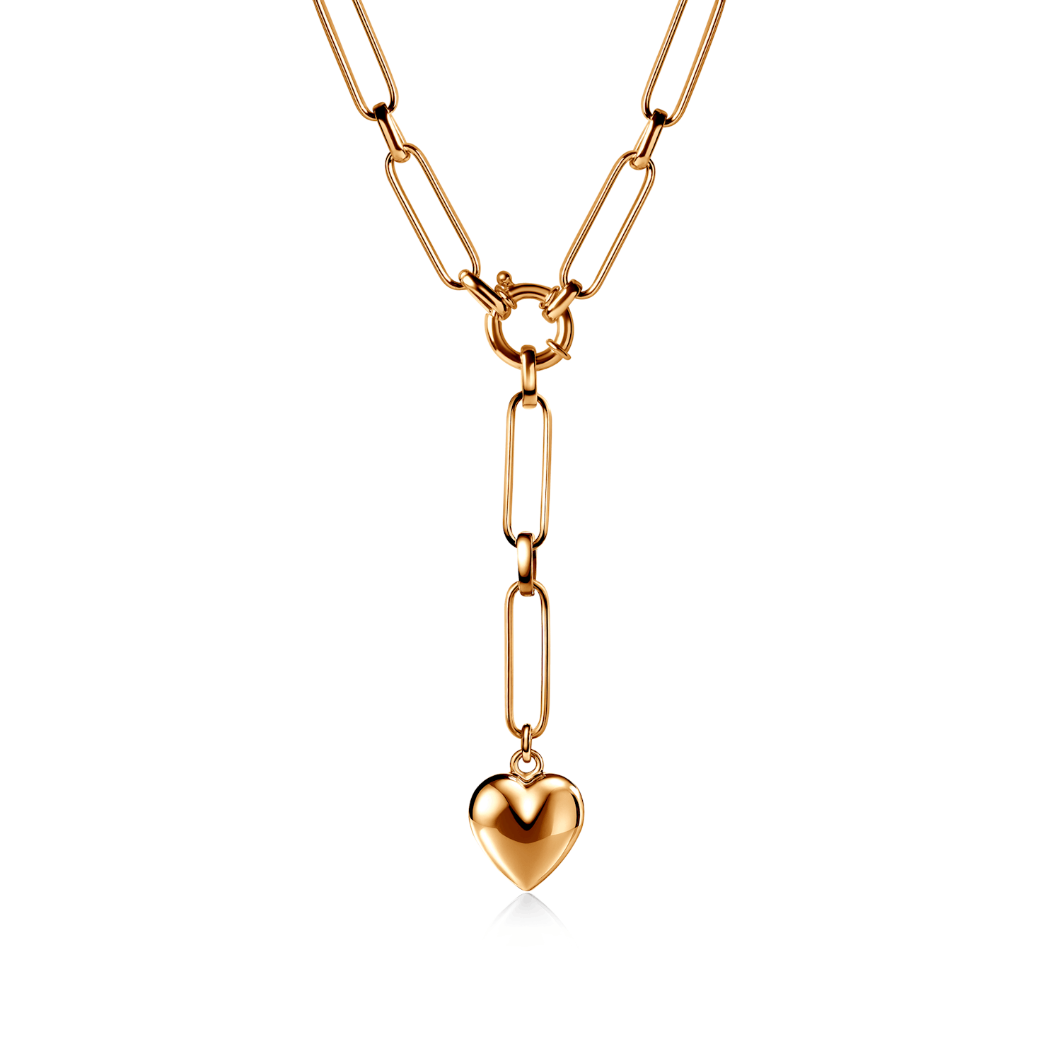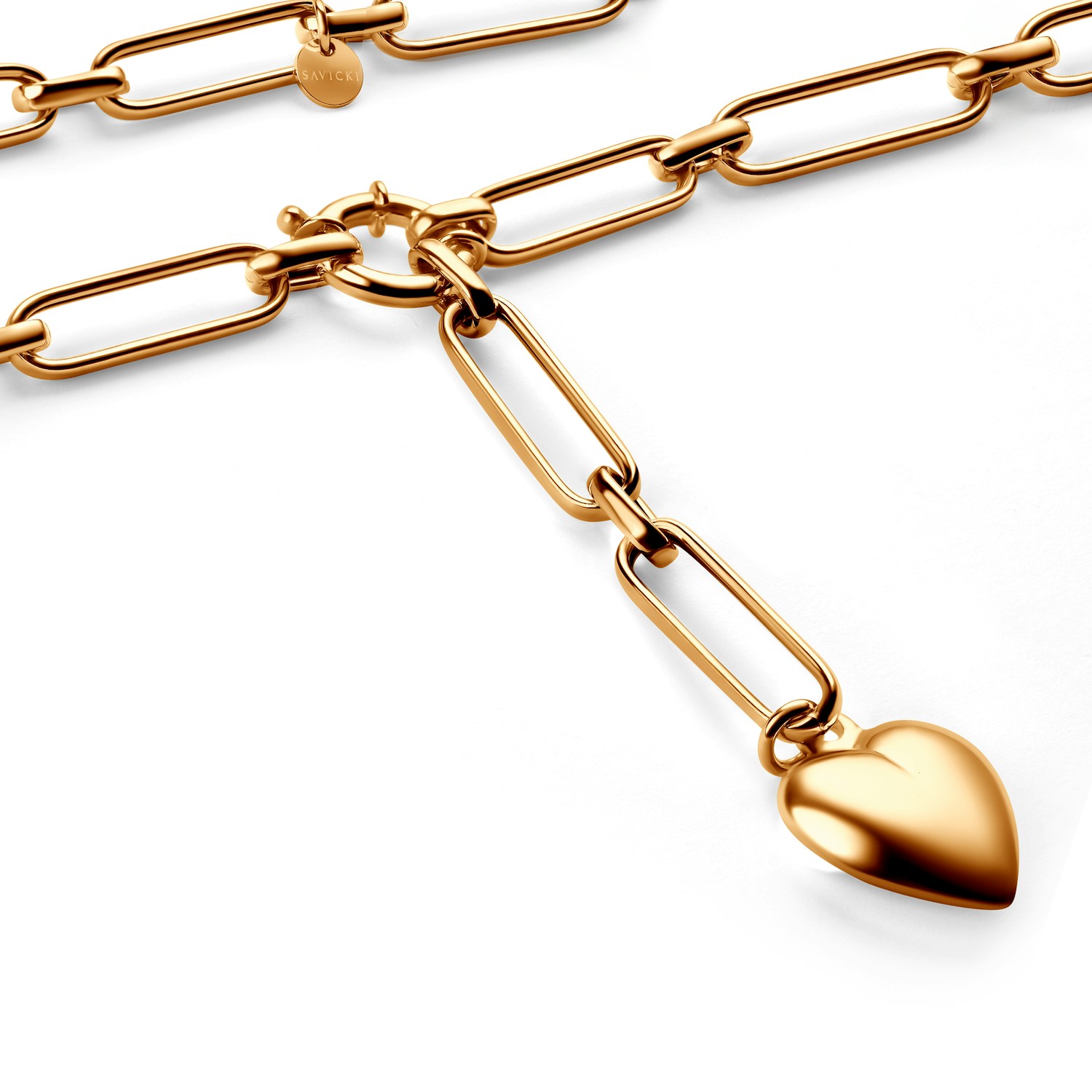 Naszyjnik SAVICKI z pozłacanego srebra próby 925 zachwyca wyważoną formą i subtelną symboliką. Jego centralnym punktem jest połyskujące serce o wymiarach 18 × 16 mm, zawieszone na ozdobnym łańcuszku z podłużnych ogniw.