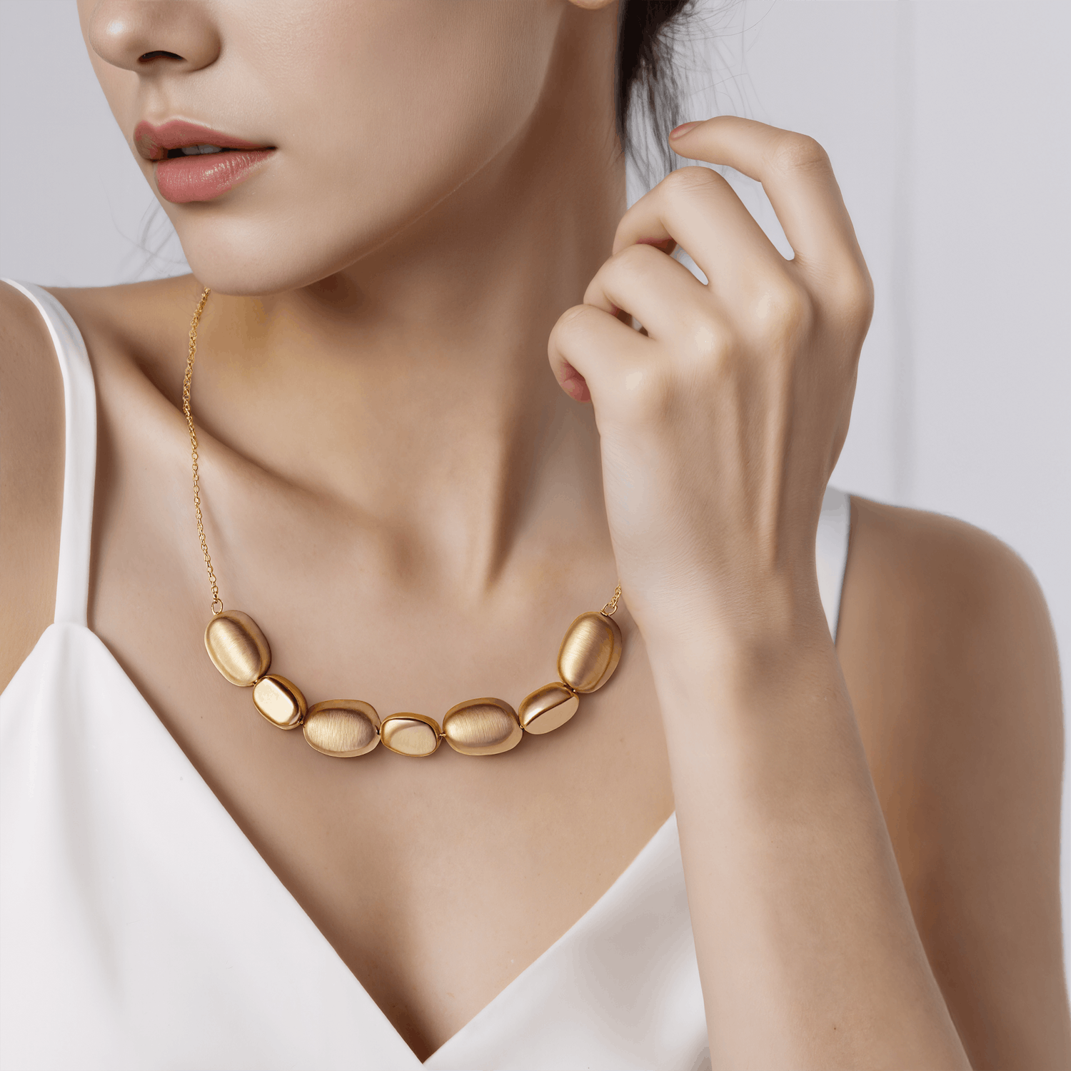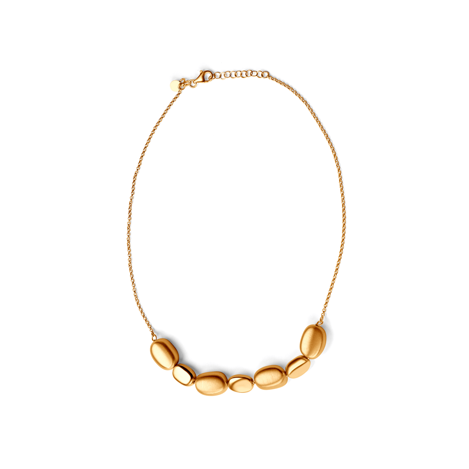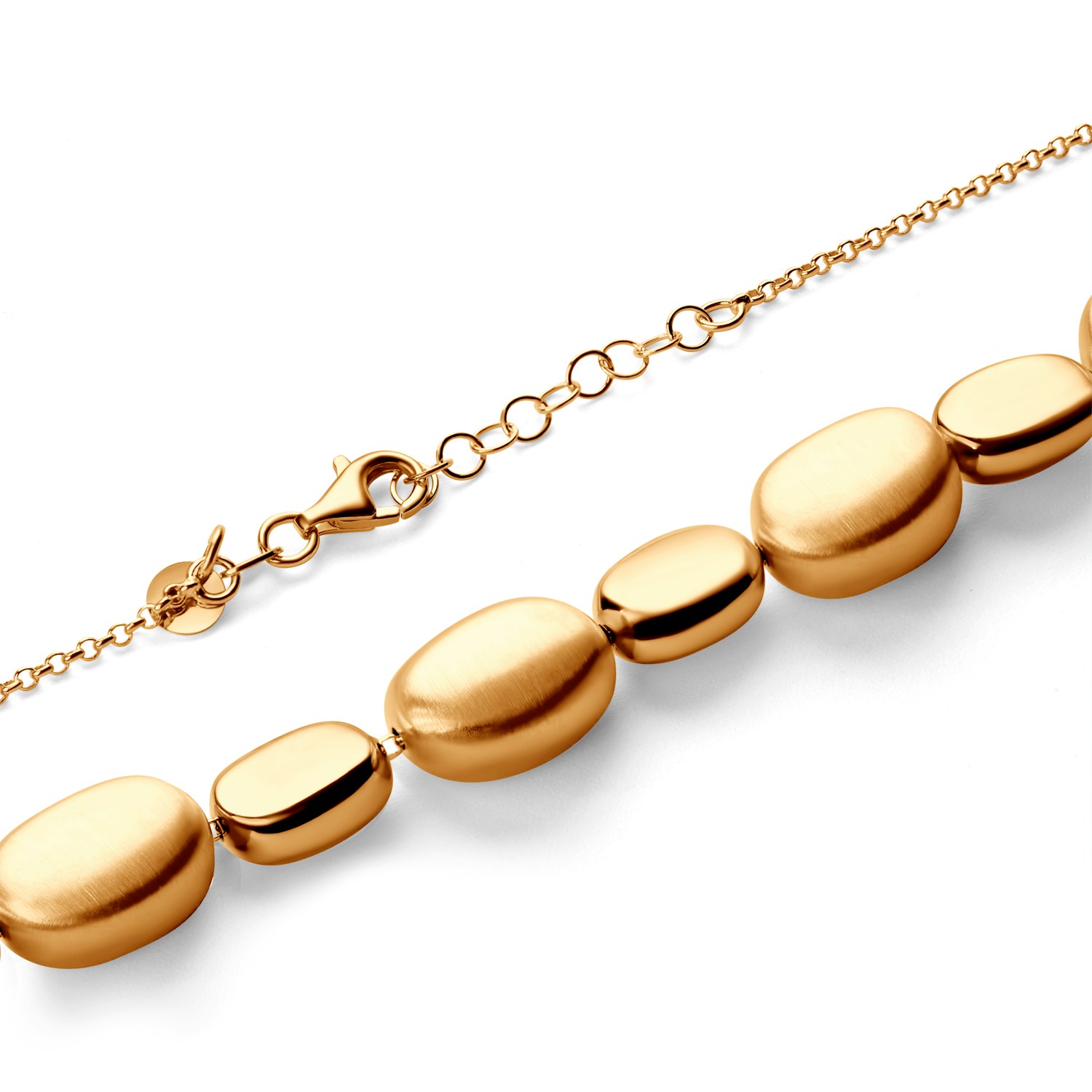 Naszyjnik SAVICKI z pozłacanego srebra próby 925 zachwyca miękką formą i nowoczesną harmonią. Kompozycja większych i mniejszych owalnych ogniw (16 × 12 mm i 12 × 10 mm) tworzy zmysłowy rytm, który przyciąga spojrzenie i subtelnie podkreśla linię dekoltu.