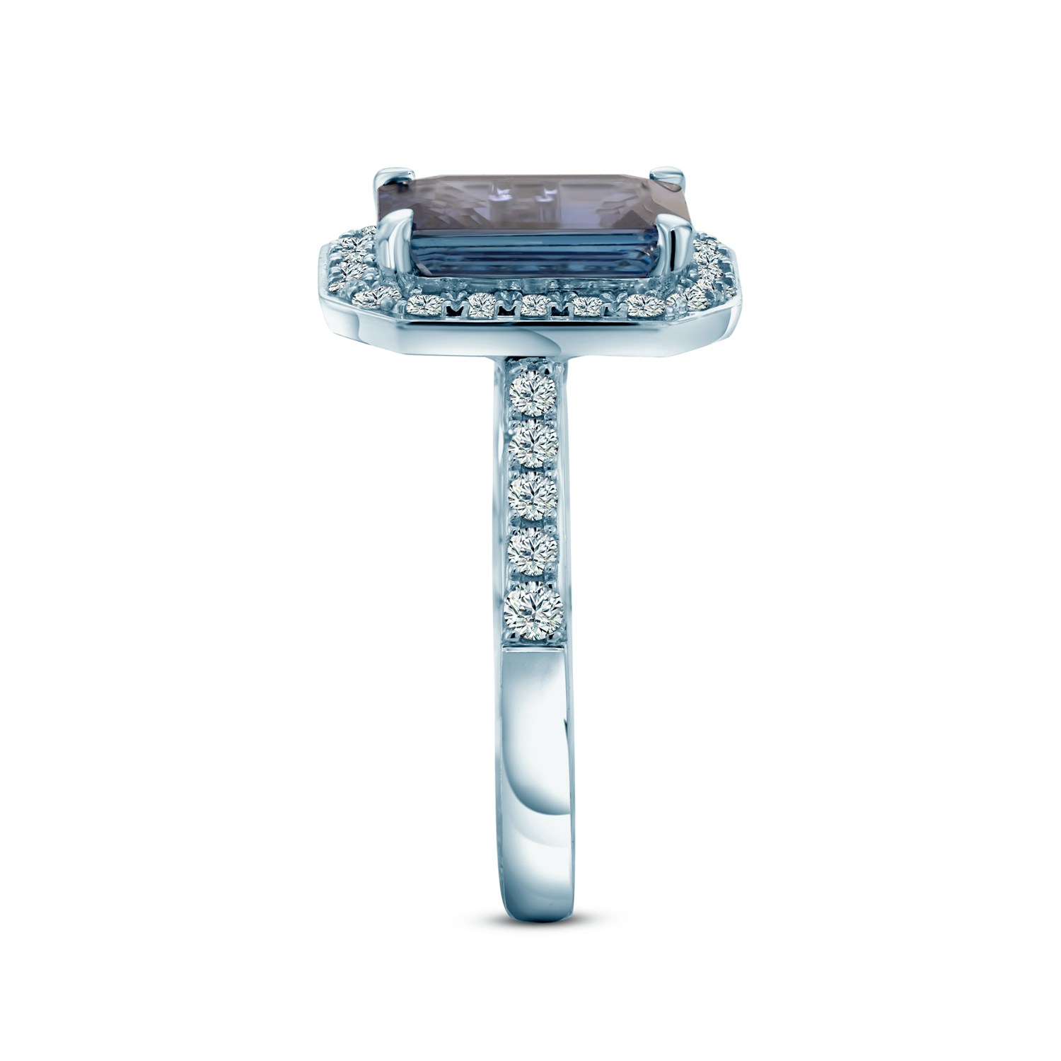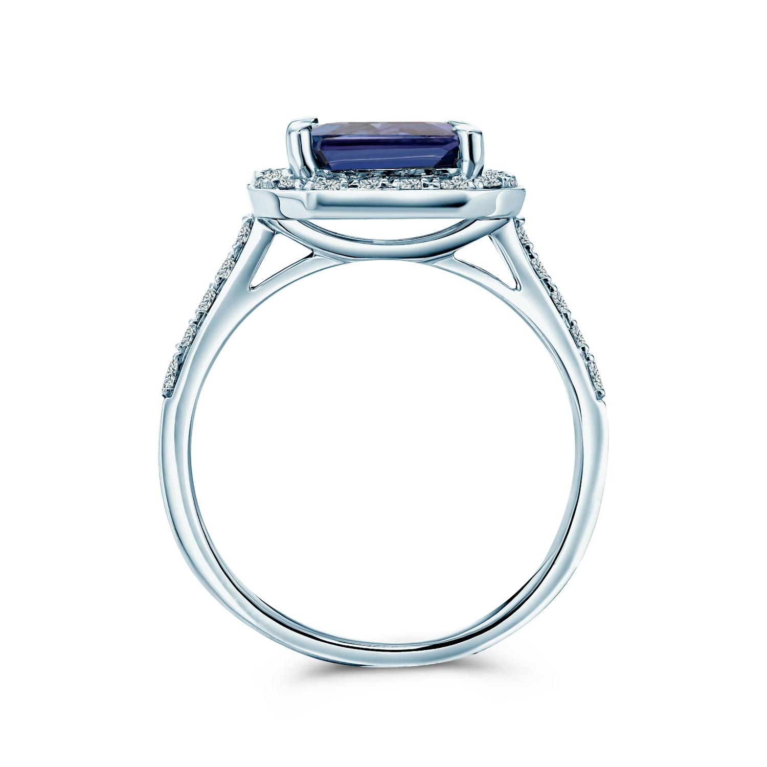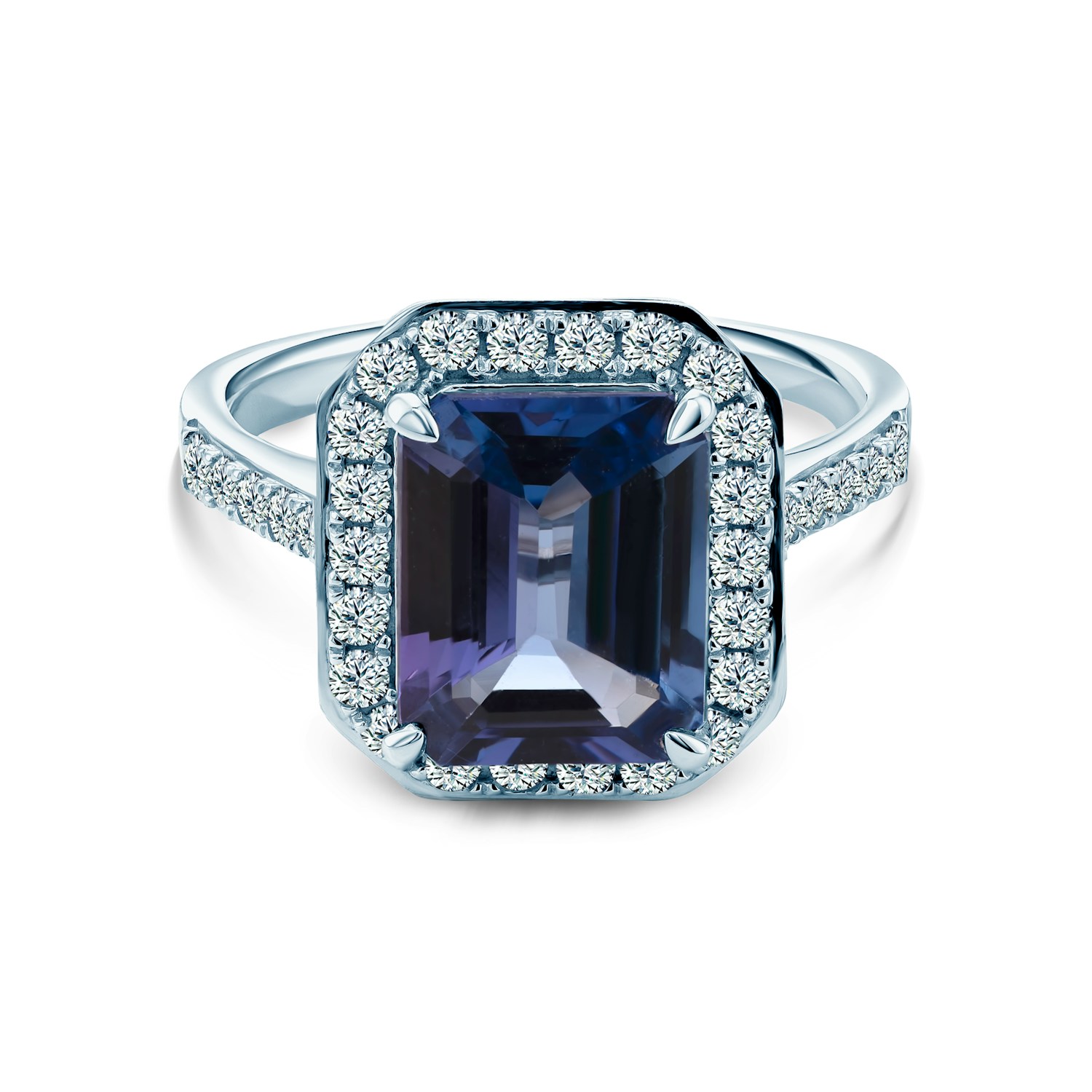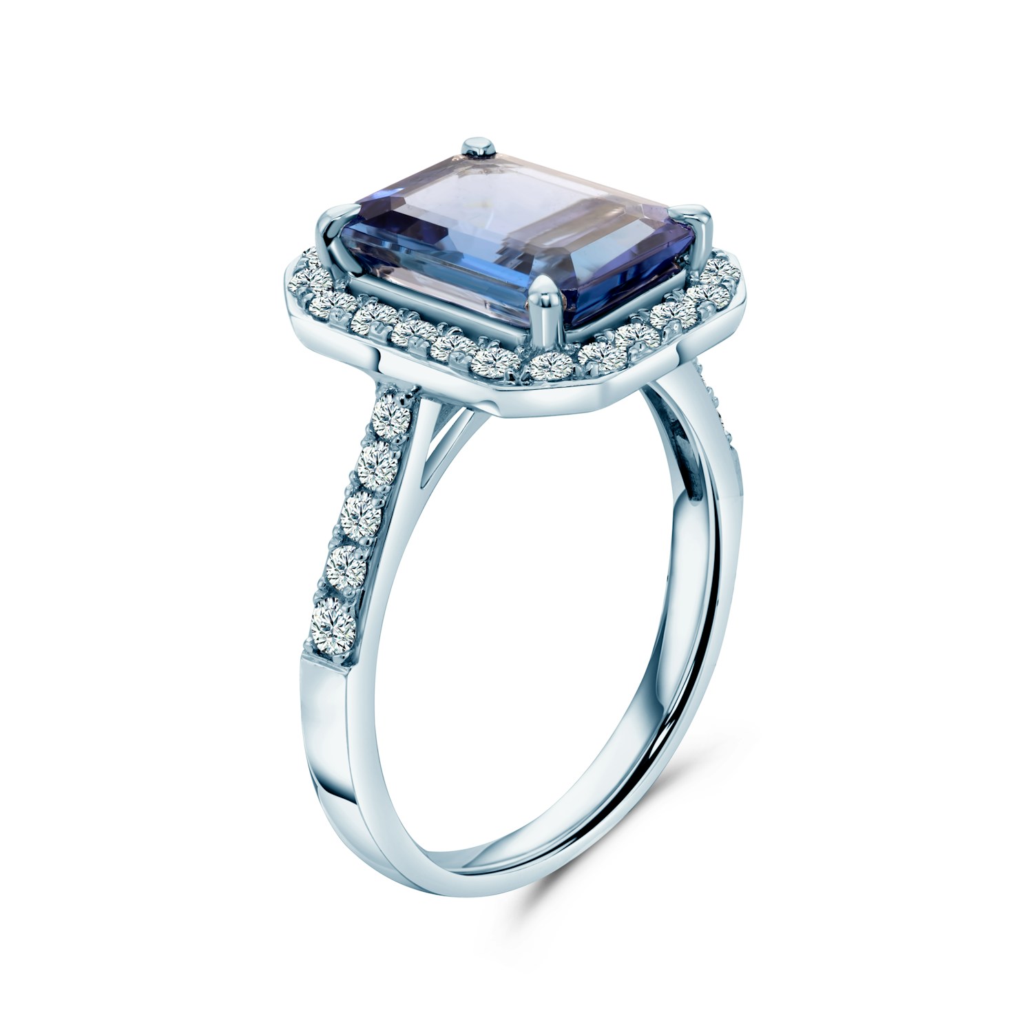Pierścionek zaręczynowy z tanzanitem o masie 3ct w szlifie owalnym i 32 diamentami dodatkowymi o łącznej masie 0,53ct. Wykonany z 14-karatowego białego złota (próba 585).