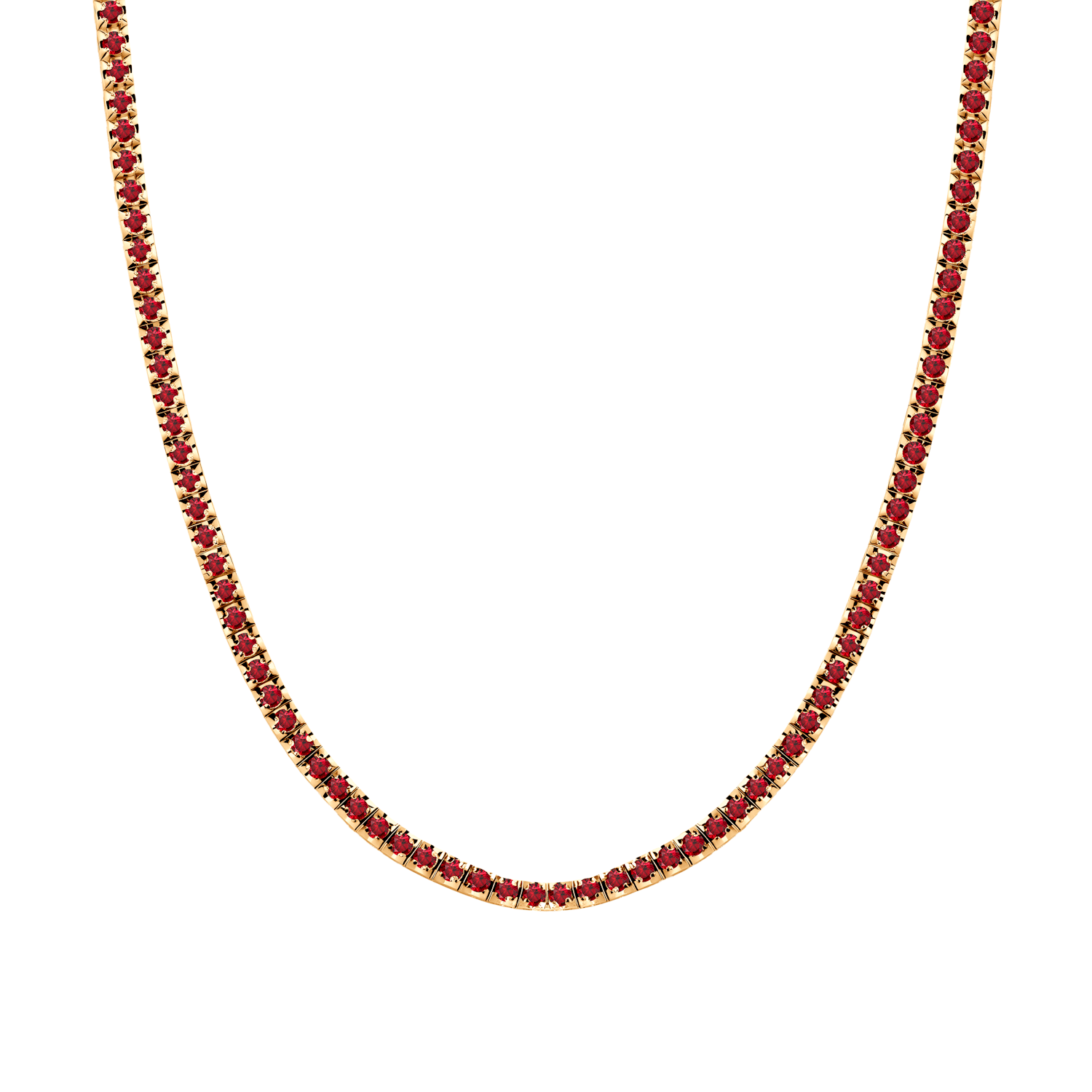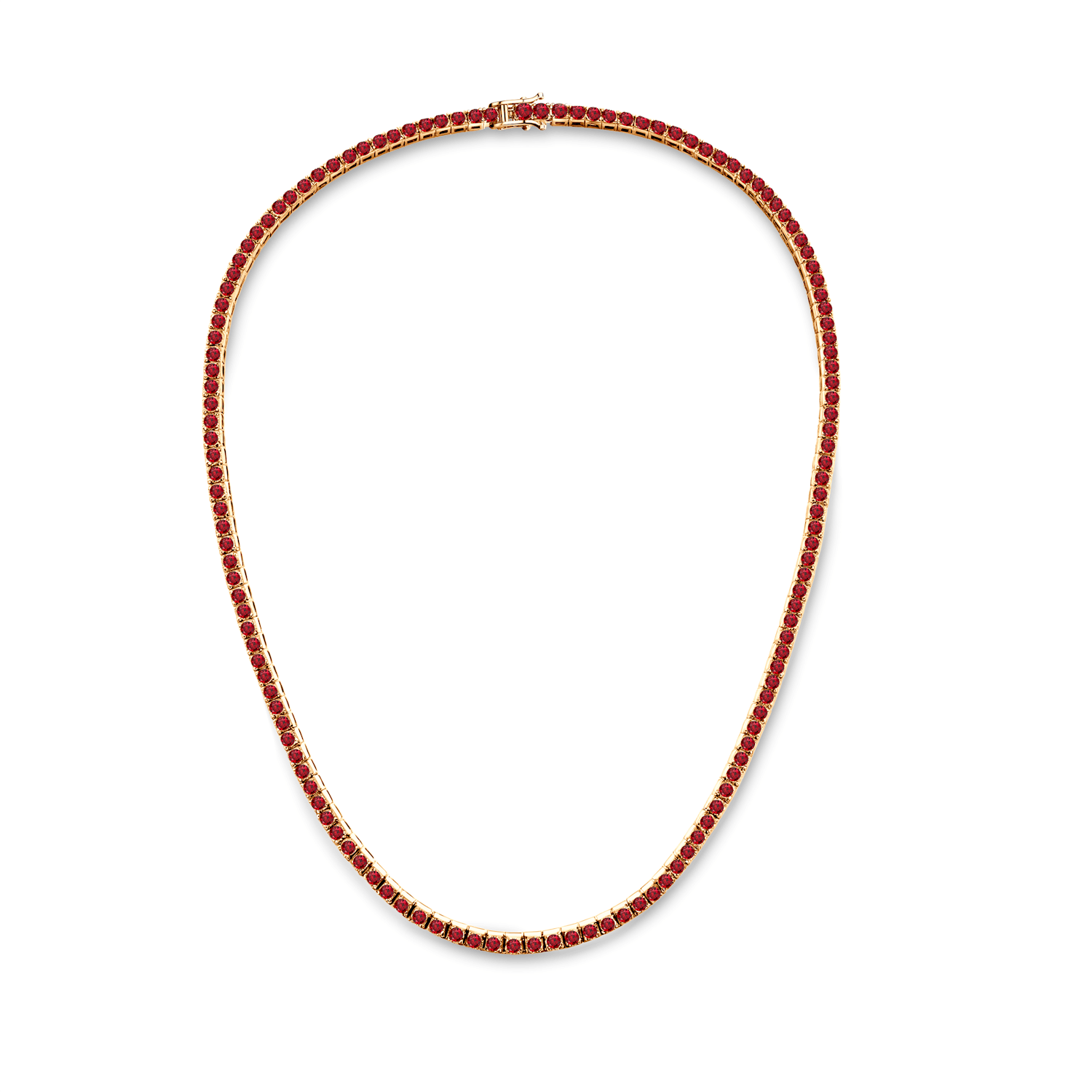 W naszyjniku zostało osadzonych 146 rubinów o łącznej masie 5,84ct w szlifie brylantowym i czystości VS/F. Naszyjnik wykonany z żółtego złota(próba 585).