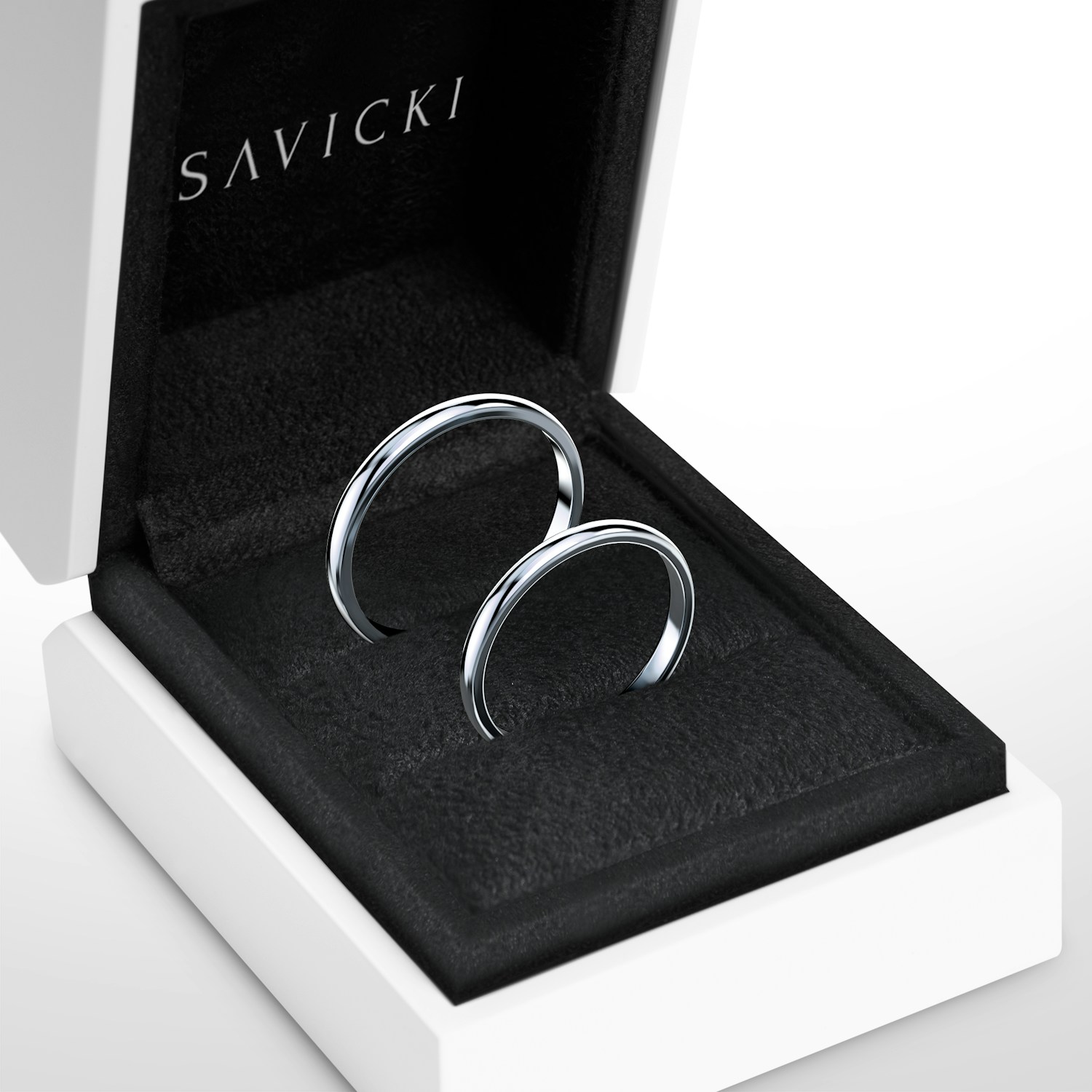 Obrączki ślubne półokrągłe o klasycznym wzorze, wykonane z białego złota (próba 0,333/0,585), o szerokości 2 mm.