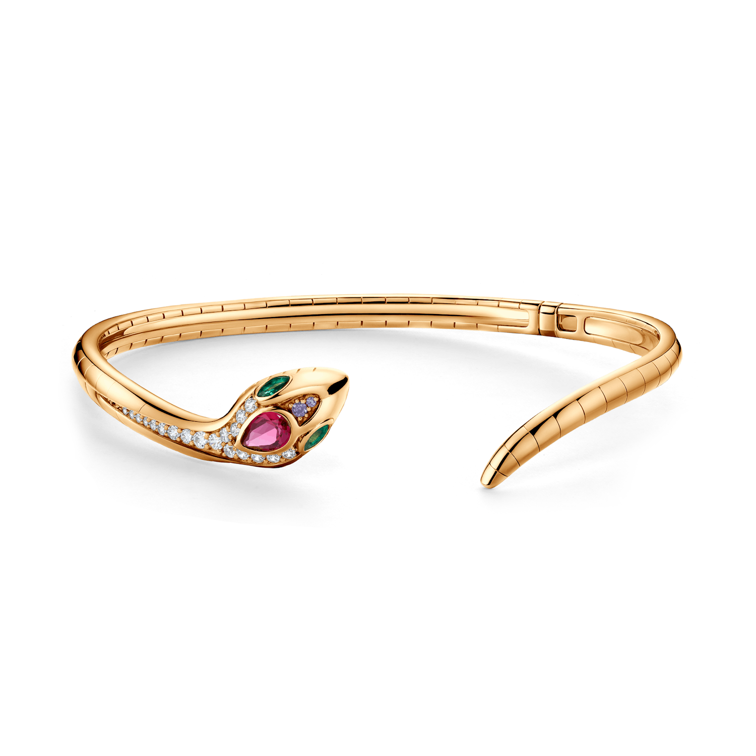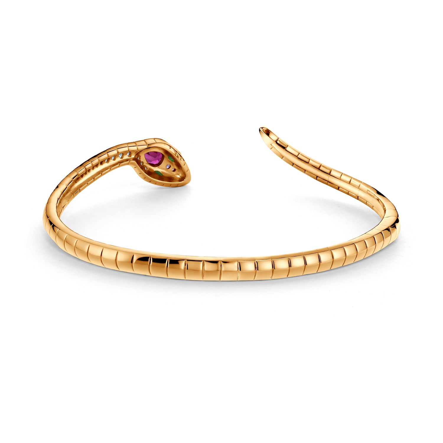 Bransoletka SAVICKI z pozłacanego srebra próby 925 przyciąga wzrok formą inspirowaną sylwetką węża. Smukła linia oplata nadgarstek, a głowa zdobiona barwnymi kamieniami i cyrkoniami nadaje całości zmysłowego charakteru.
