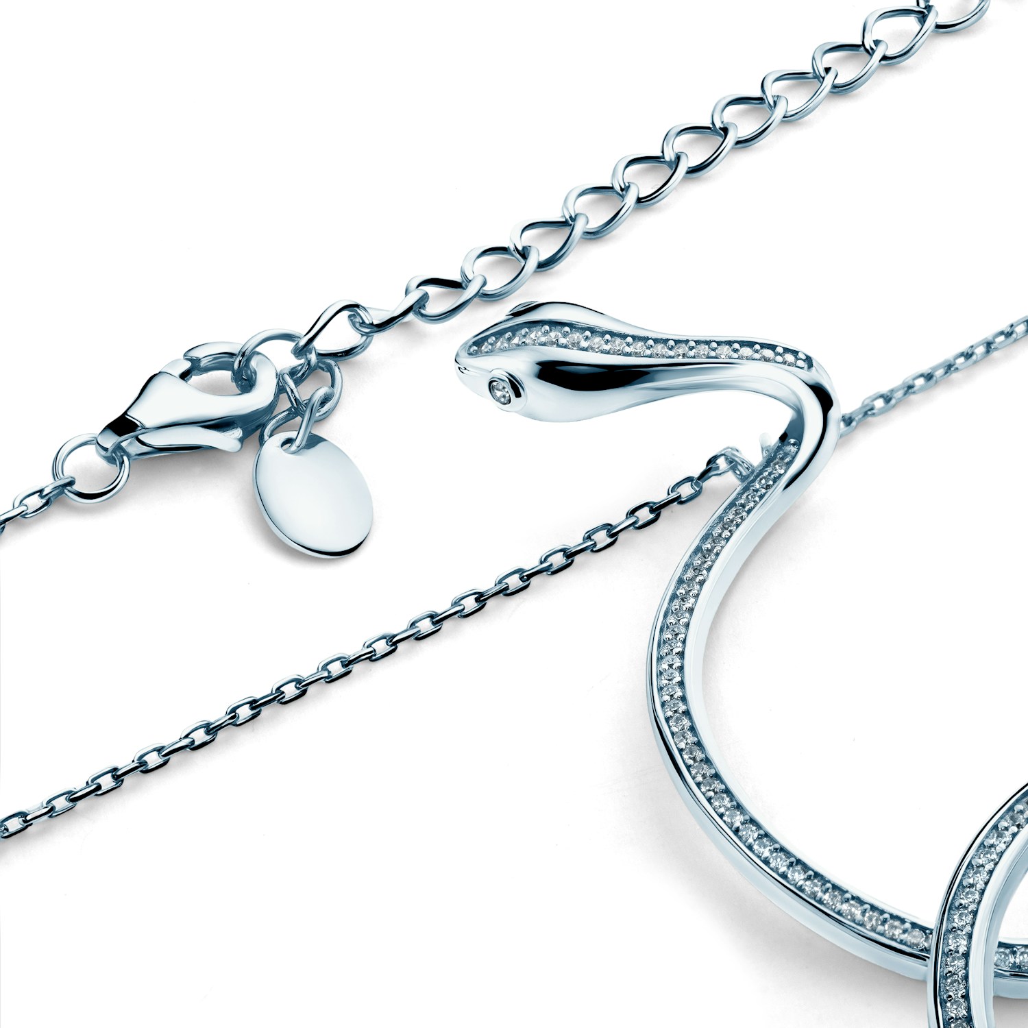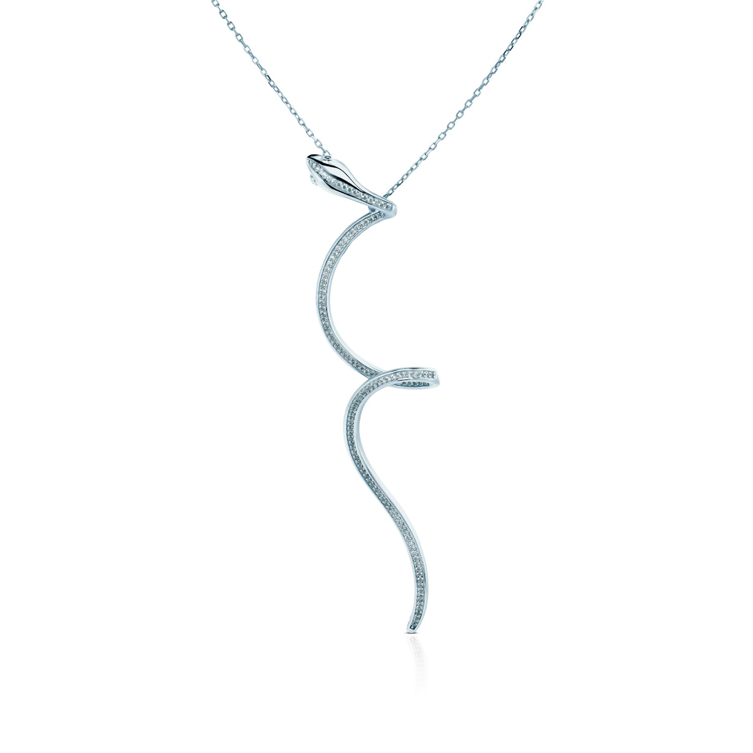 Naszyjnik SAVICKI ze srebra próby 925 urzeka hipnotyzującą formą i płynną linią. Dekoracyjny element o wymiarach 96 × 22 mm układa się w zmysłowy kształt węża, lśniąc chłodnym blaskiem cyrkonii.