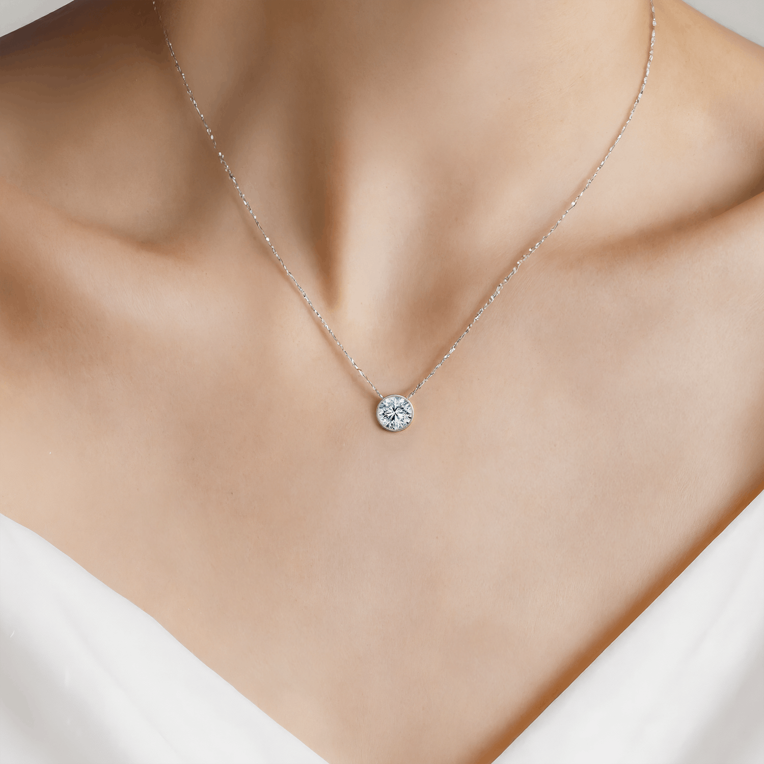 Naszyjnik wykonany z 14-karatowego białego złota (próba 585). W naszyjniku został osadzony diament o masie 0,1 ct i szlifie brylantowym oraz wysokiej czystości SI2/H.