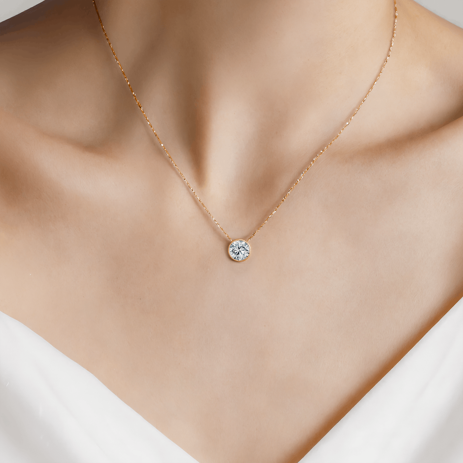 Naszyjnik wykonany z 14-karatowego żółtego złota (próba 585). W naszyjniku został osadzony diament o masie 0,1 ct i szlifie brylantowym oraz wysokiej czystości SI2/H.