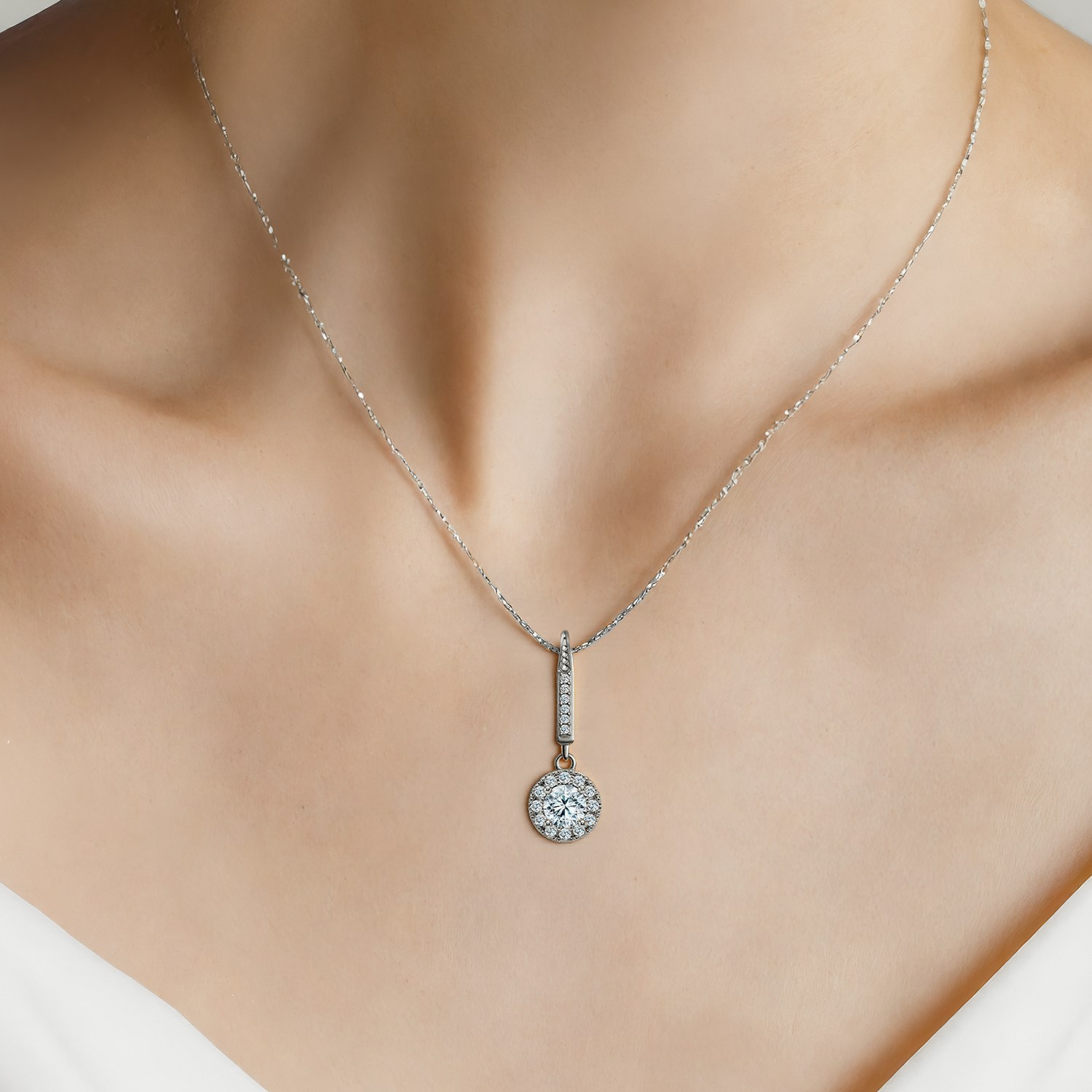 Zawieszka wykonana z 14-karatowego białego złota (próba 585). W zawieszce osadzony został diament o masie 0,14 ct i szlifie brylantowym oraz 18 diamenty wysokiej czystości SI1/H, o łącznej masie 0,09 ct.