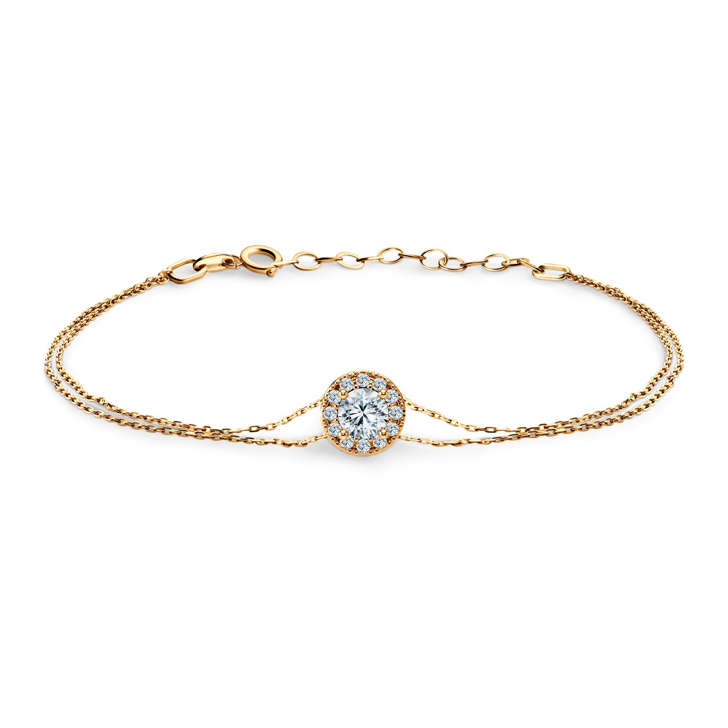 W bransoletce został osadzony diament o szlifie brylantowym i masie 0,14 ct oraz 12 diamentów o szlifie brylantowym i łącznej masie 0,06 ct. Bransoletka wykonana z żółtego złota (próba 585).
