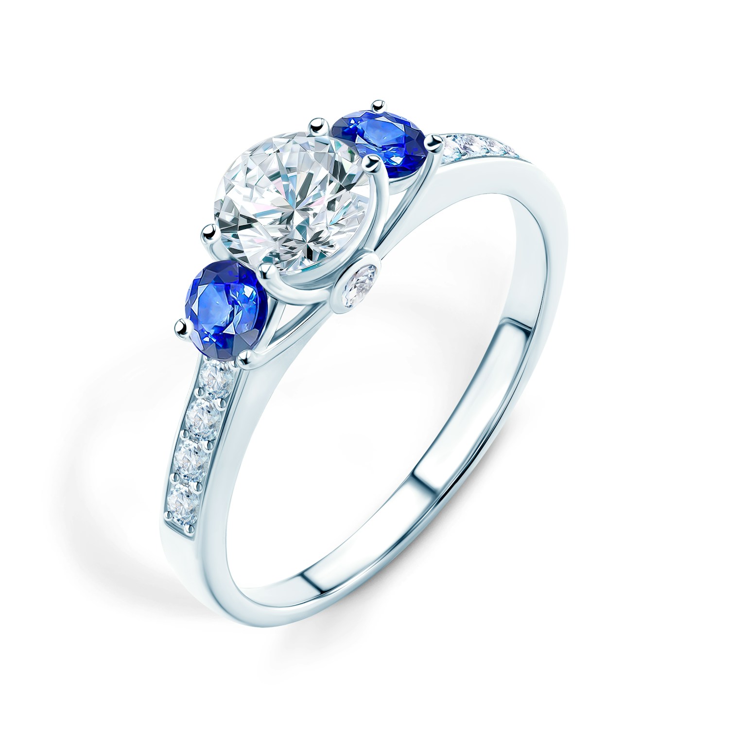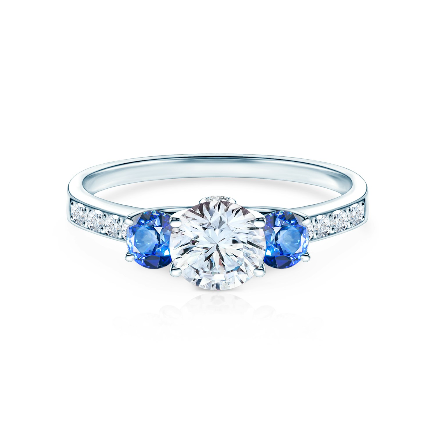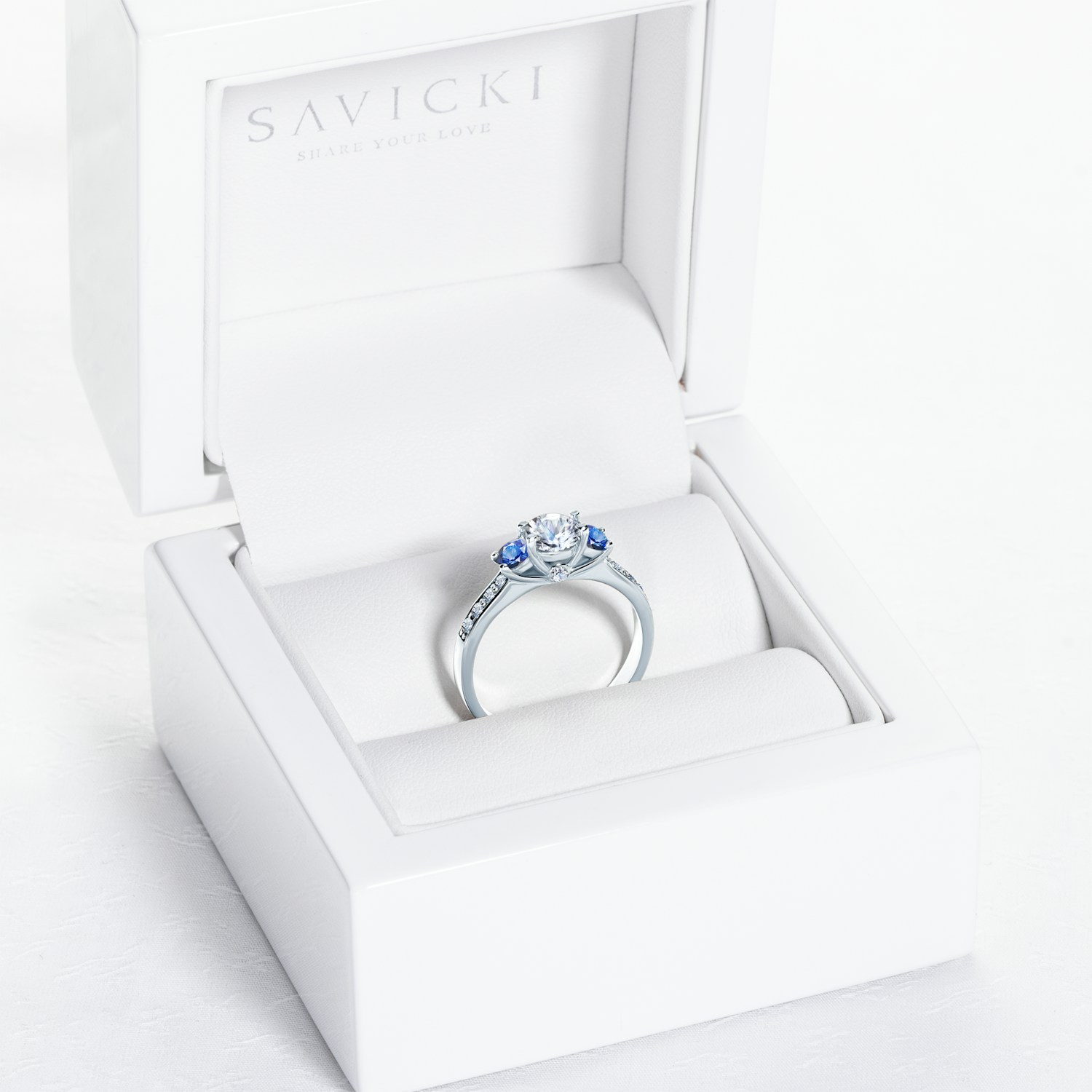 Pierścionek zaręczynowy z centralnie umieszczonym białym szafirem o masie 0,50 ct oraz dwoma niebieskimi szafirami o łącznej masie 0,24 ct. Boczne diamenty posiadają łączną masę 0,15 ct o wysokiej czystości SI/H i szlifie brylantowym. Wykonany z 14-karatowego białego złota (próba 585).