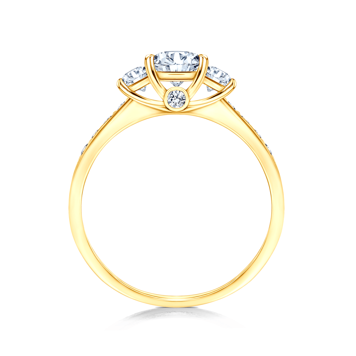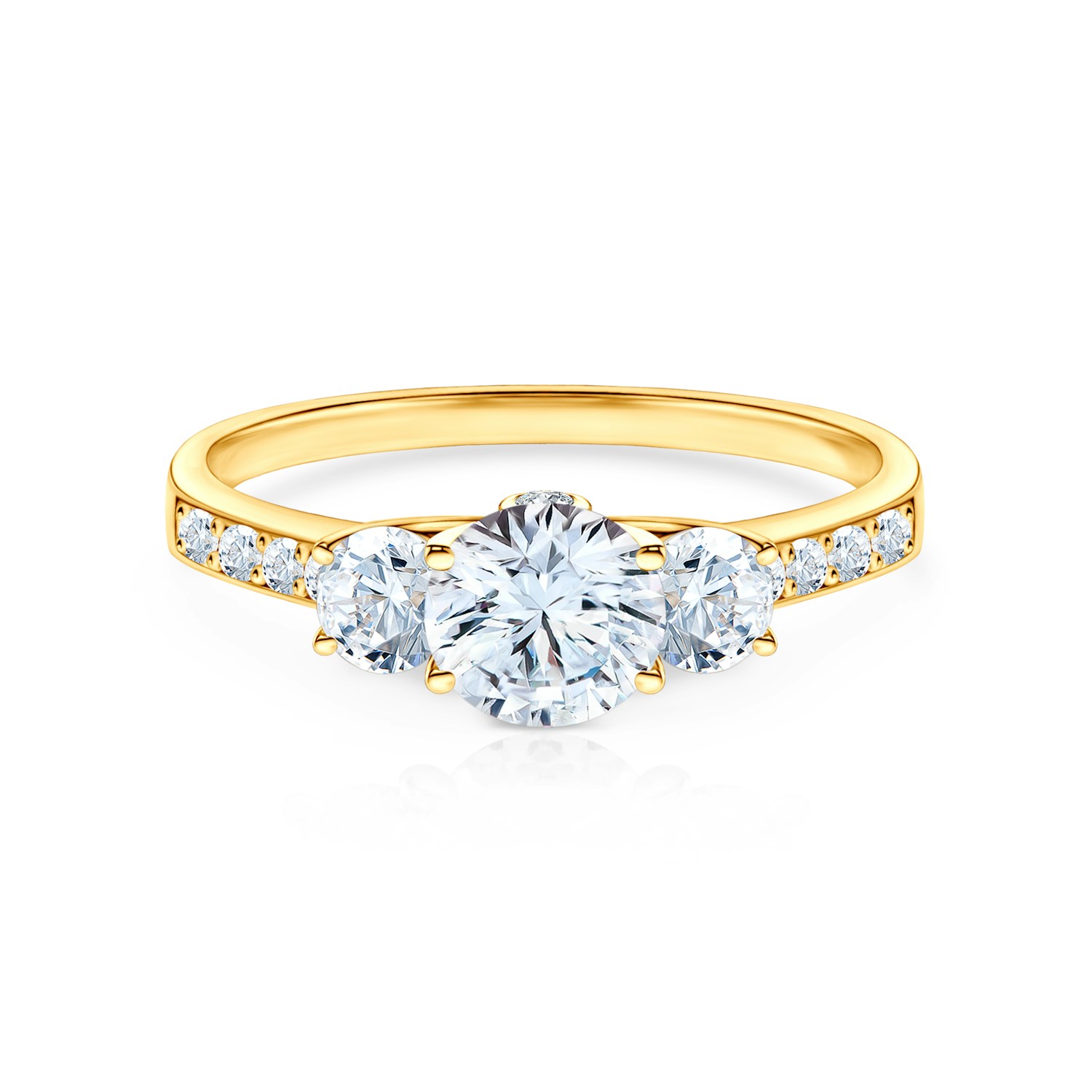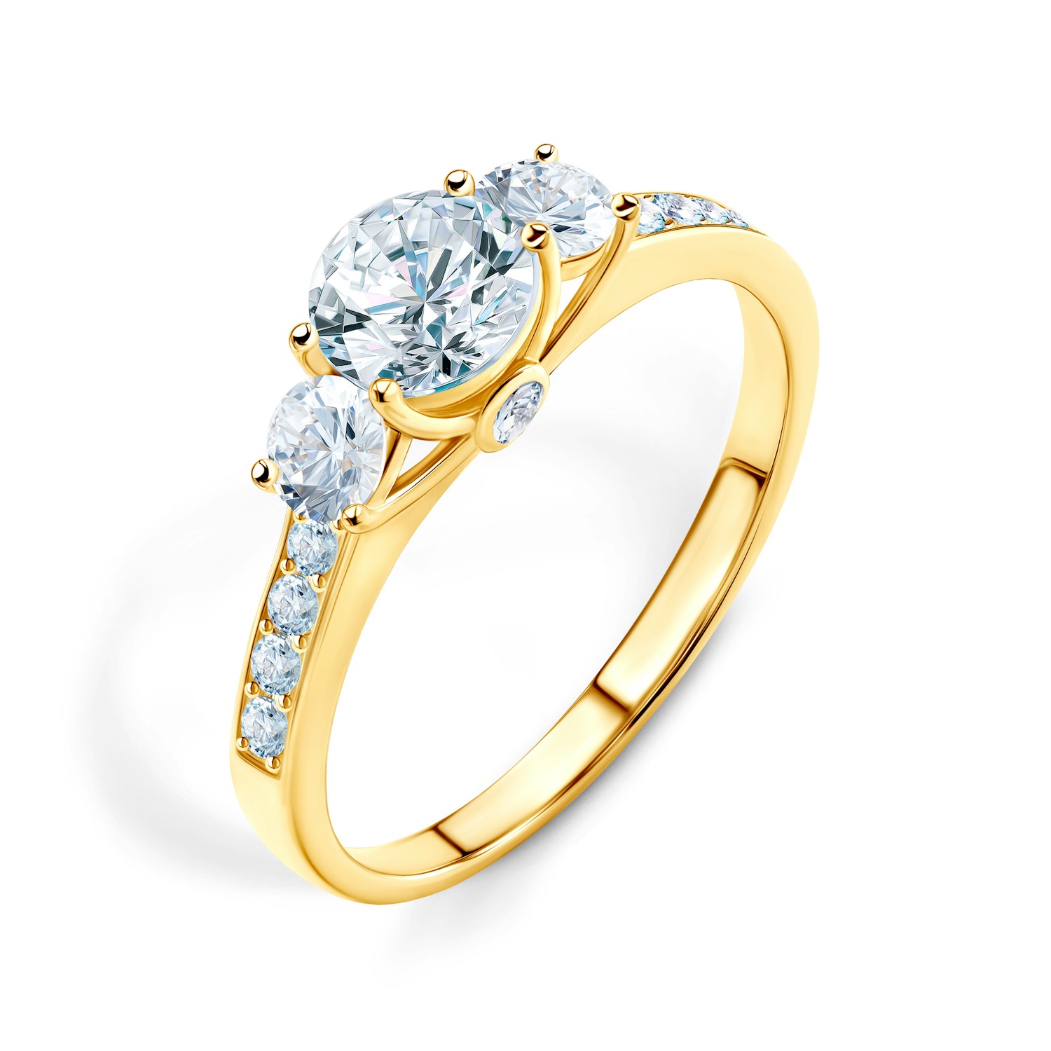 Pierścionek zaręczynowy z centralnie umieszczonym białym szafirem o masie 0,50 ct oraz dwoma białymi szafirami o łącznej masie 0,24 ct. Boczne diamenty posiadają łączną masę 0,15 ct o wysokiej czystości SI/H i szlifie brylantowym. Wykonany z 14-karatowego żółtego złota (próba 585).