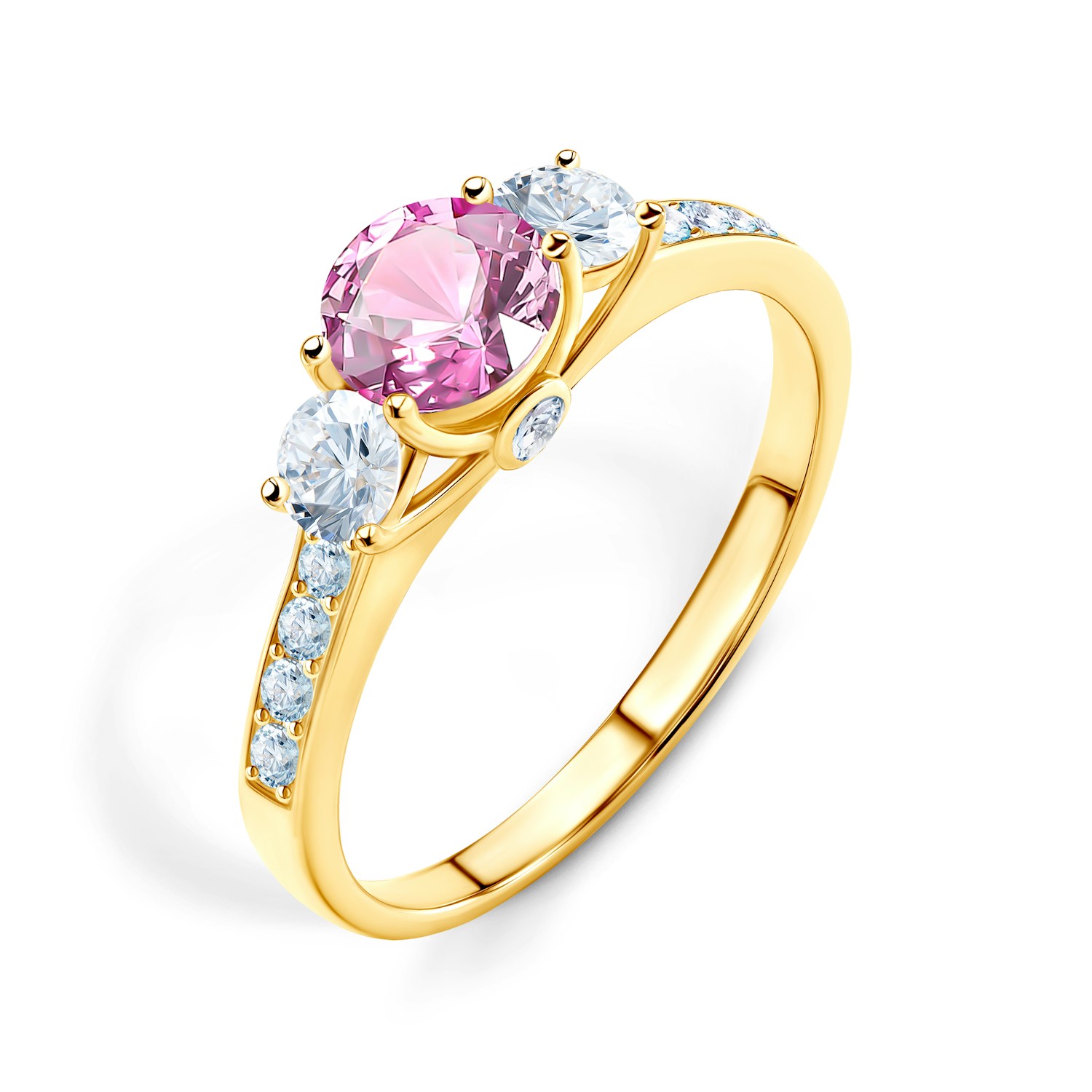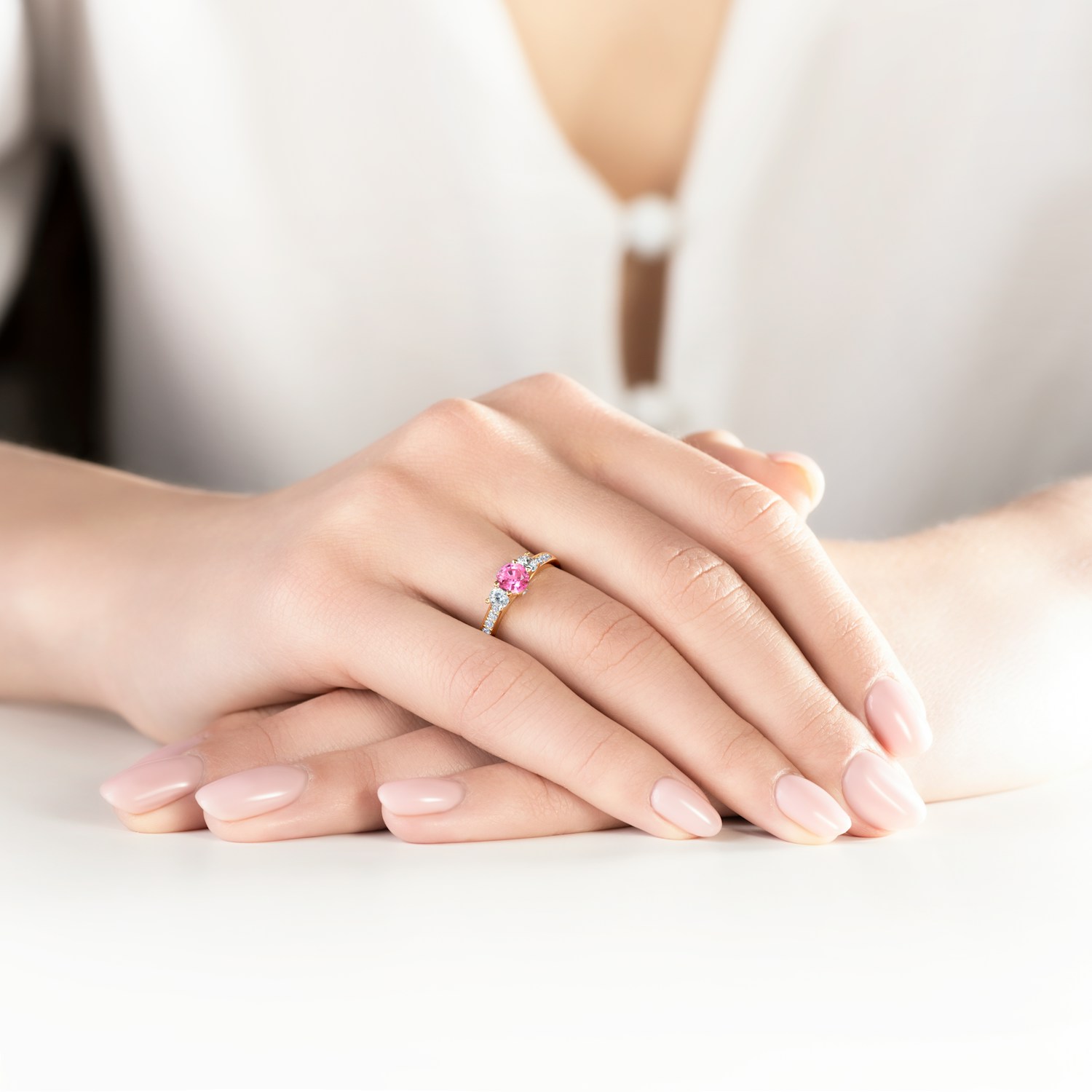 Pierścionek zaręczynowy z centralnie umieszczonym różowym szafirem o masie 0,50 ct oraz dwoma białymi szafirami o łącznej masie 0,24 ct. Boczne diamenty posiadają łączną masę 0,15 ct o wysokiej czystości SI/H i szlifie brylantowym. Wykonany z 14-karatowego żółtego złota (próba 585).