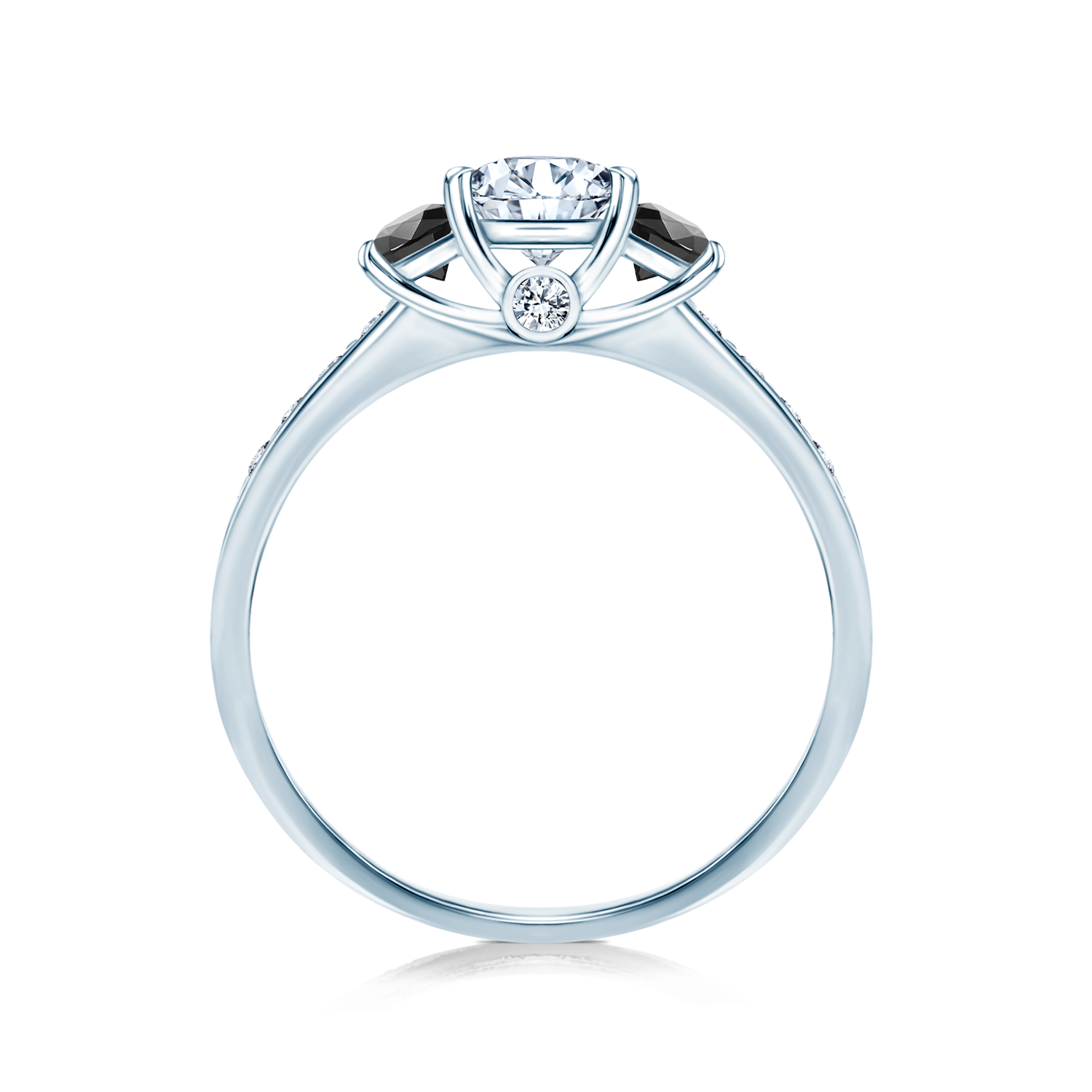 Pierścionek zaręczynowy z centralnie umieszczonym białym szafirem o masie 0,50 ct oraz dwoma czarnymi diamentami o łącznej masie 0,24 ct. Boczne diamenty posiadają łączną masę 0,15 ct o wysokiej czystości SI/H i szlifie brylantowym. Wykonany z 14-karatowego białego złota (próba 585).