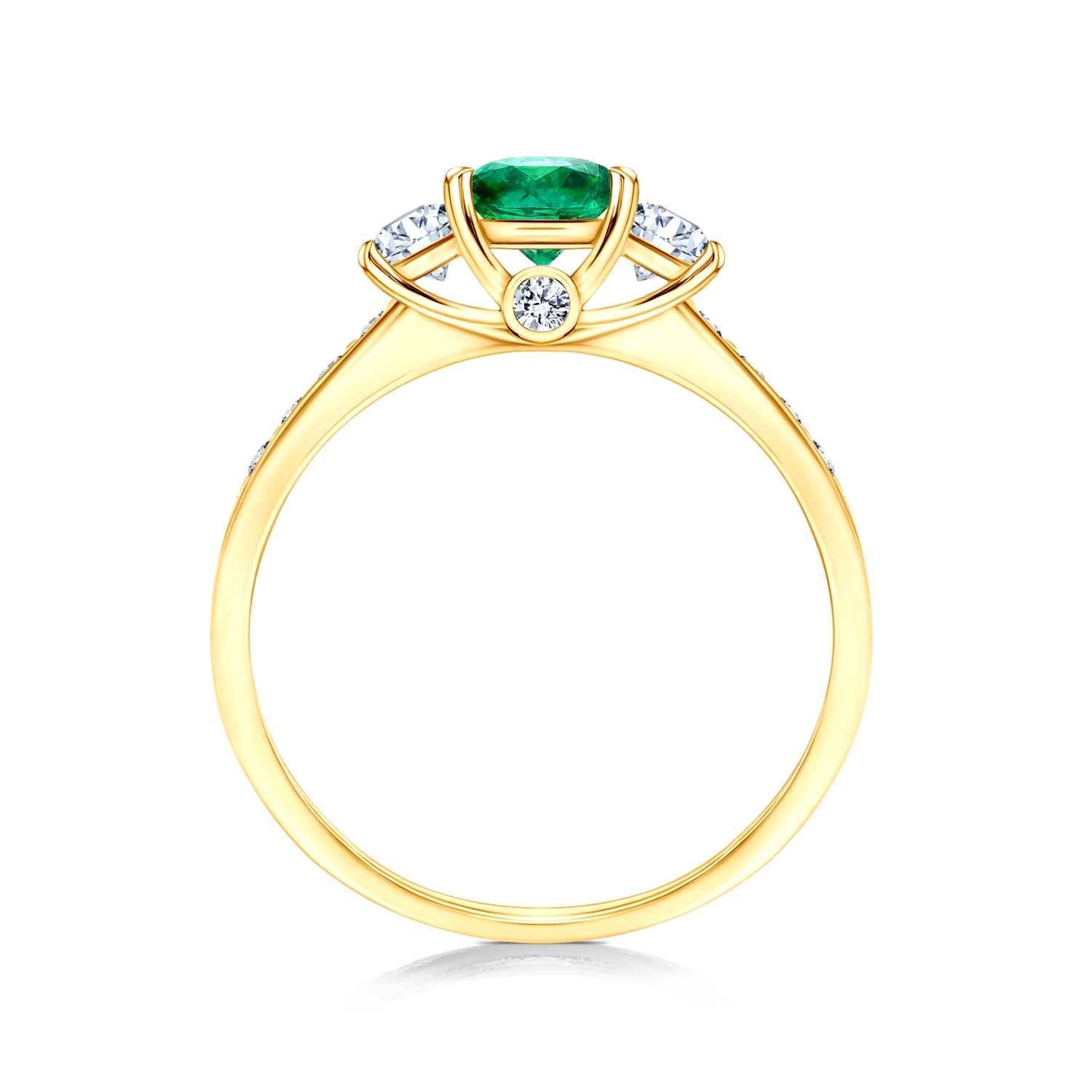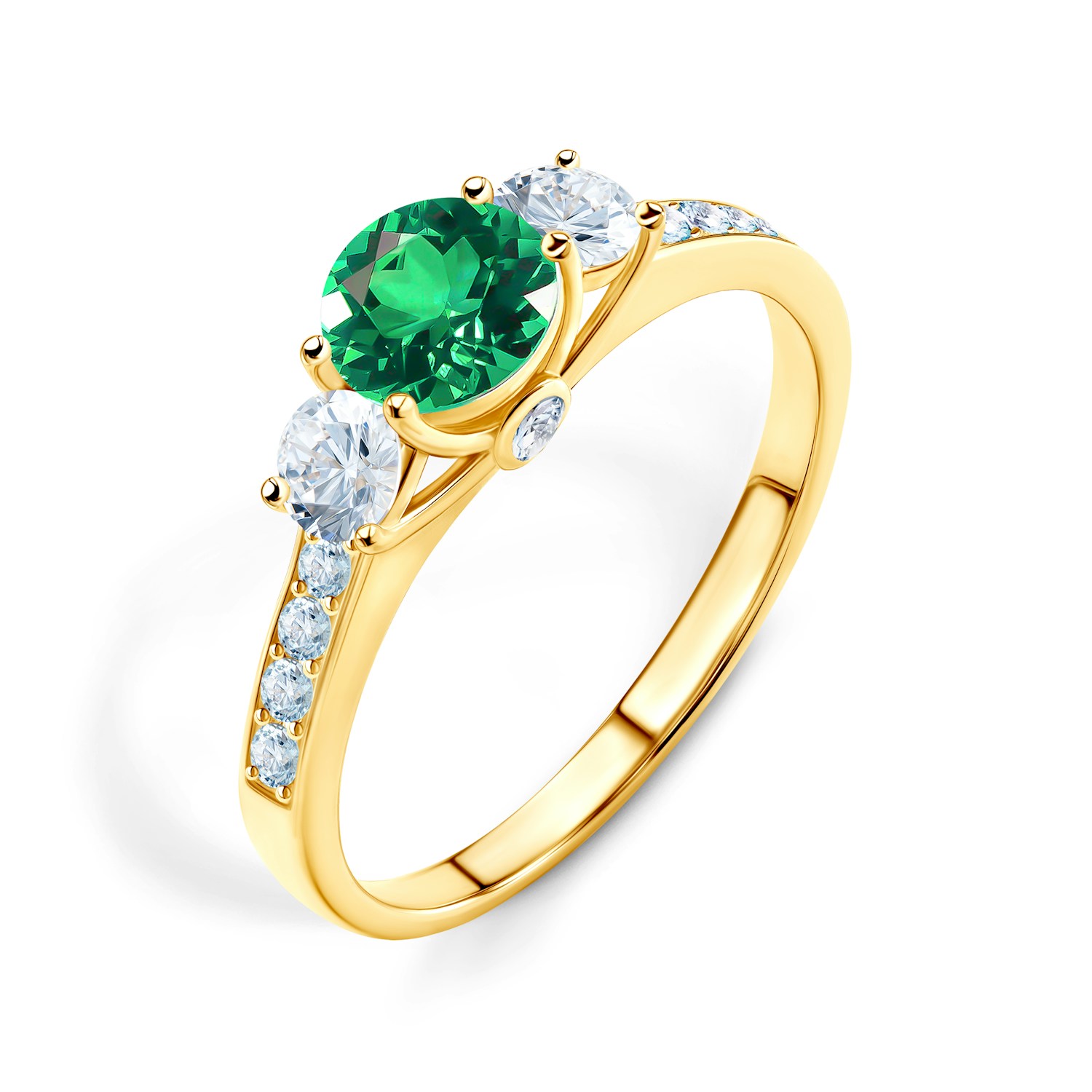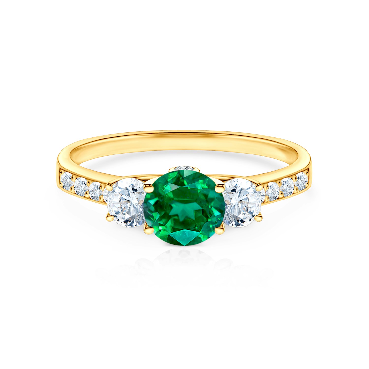 Pierścionek zaręczynowy z centralnie umieszczonym szmaragdem o masie 0,50 ct oraz dwoma białymi szafirami o łącznej masie 0,24 ct. Boczne diamenty posiadają łączną masę 0,15 ct o wysokiej czystości SI/H i szlifie brylantowym. Wykonany z 14-karatowego żółtego złota (próba 585).