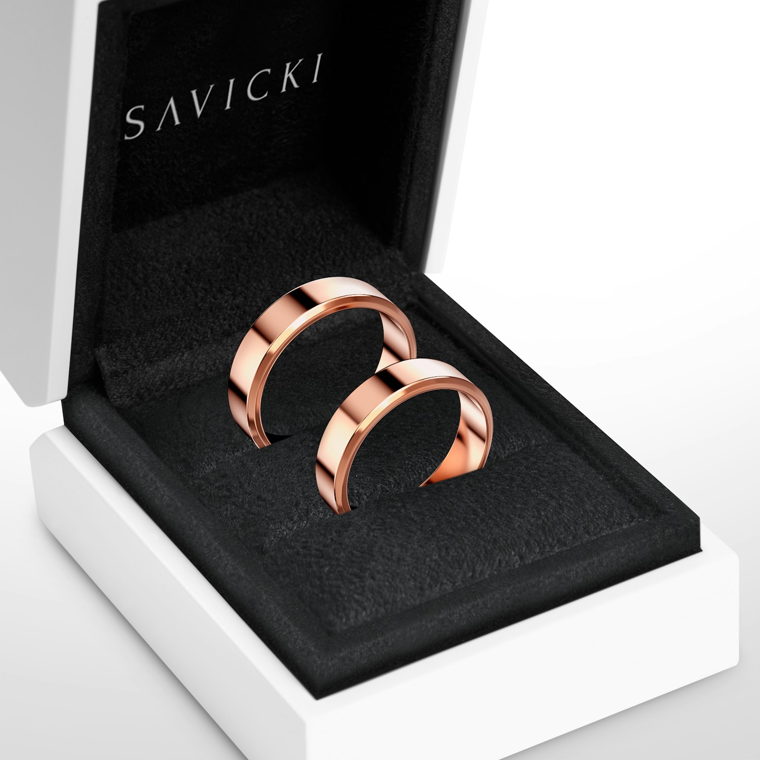 Obrączki ślubne z fazą o klasycznym wzorze, wykonane z różowego złota (próba 0,333/0,585/0,750), o szerokości 5 mm.