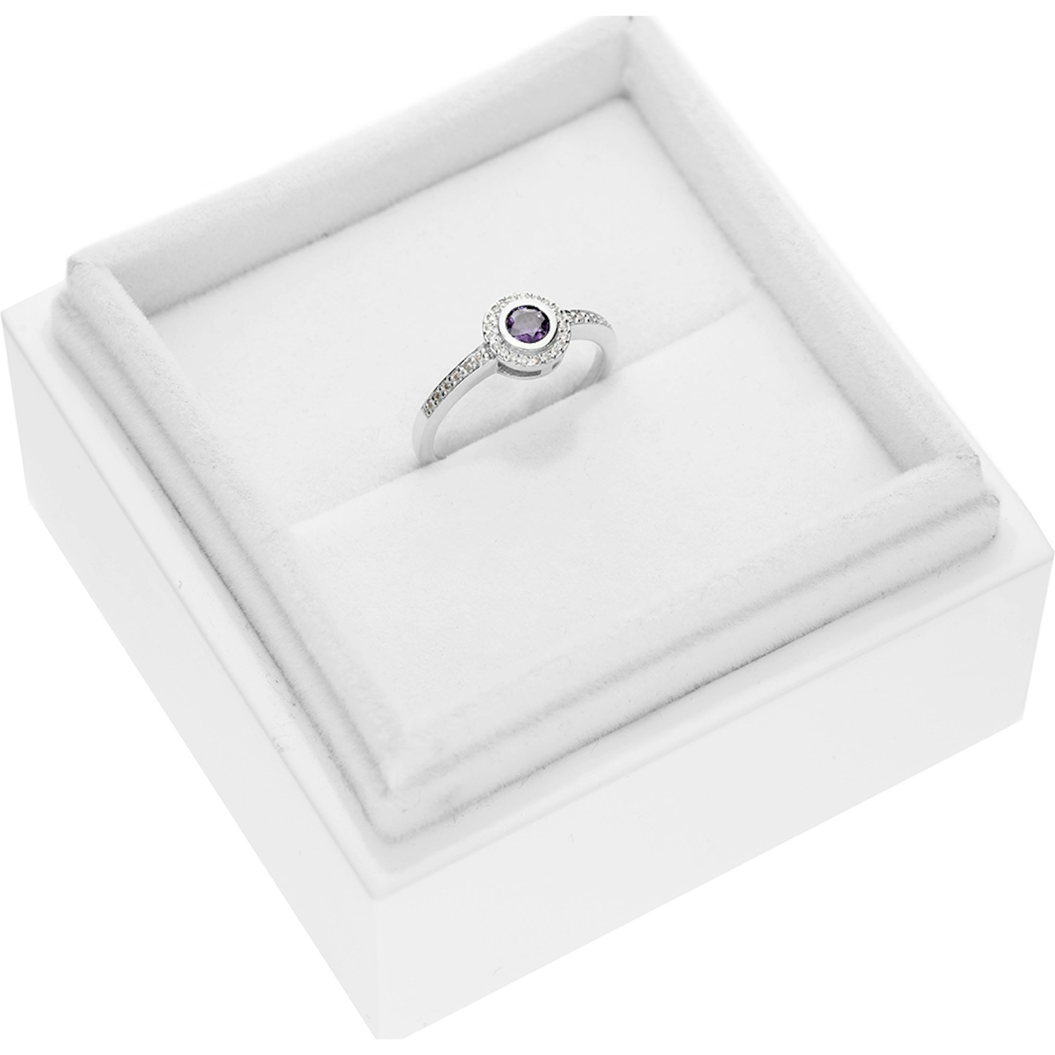 Pierścionek zaręczynowy z centralnie umieszczonym tanzanitem o masie 0,21 ct oraz perfekcyjnym szlifie brylantowym. Boczne diamenty posiadają łączną masę 0,11 ct, nieskazitelną czystość i kolor SI/H z doskonałym szlifem brylantowym. Wykonany z 14-karatowego białego złota (próba 585).