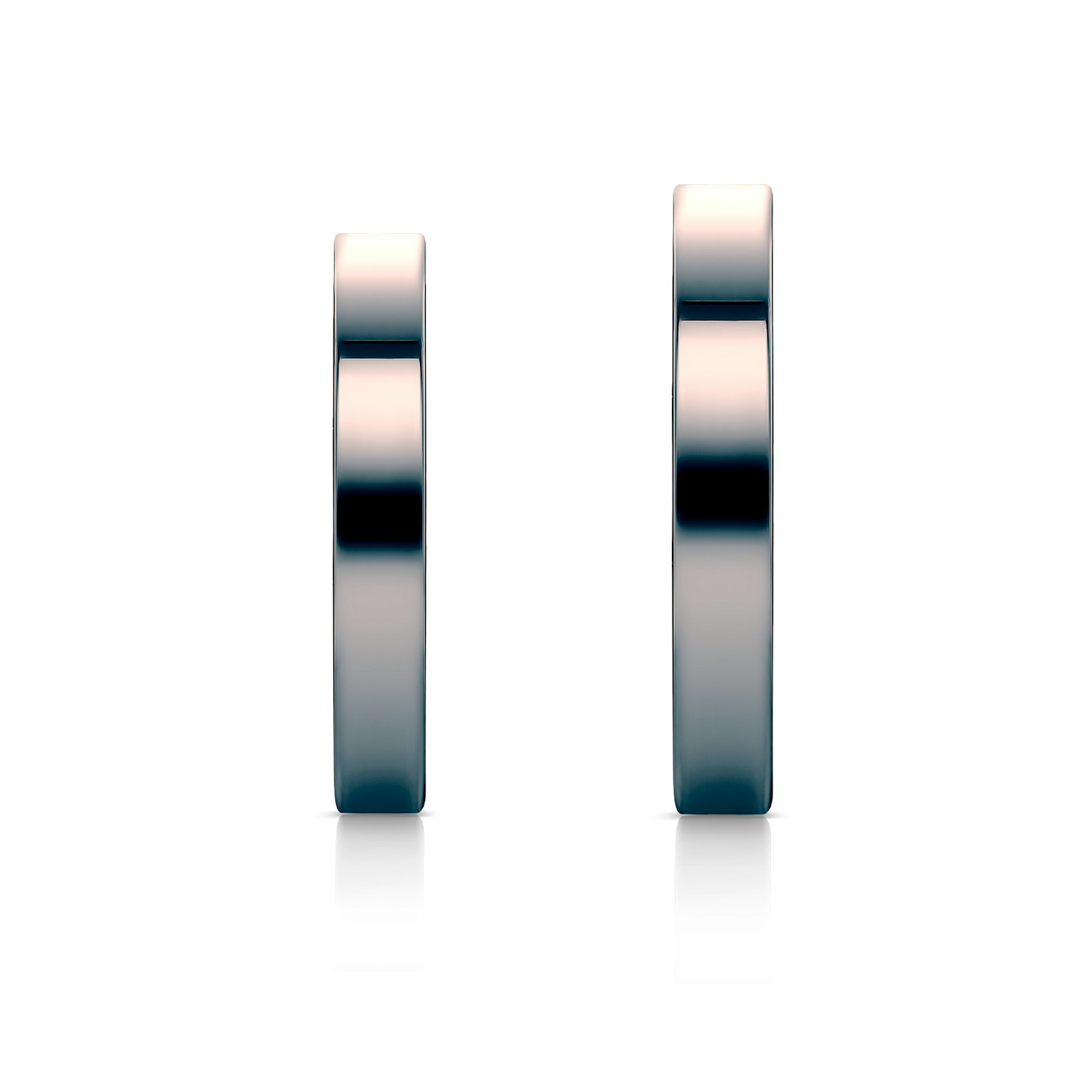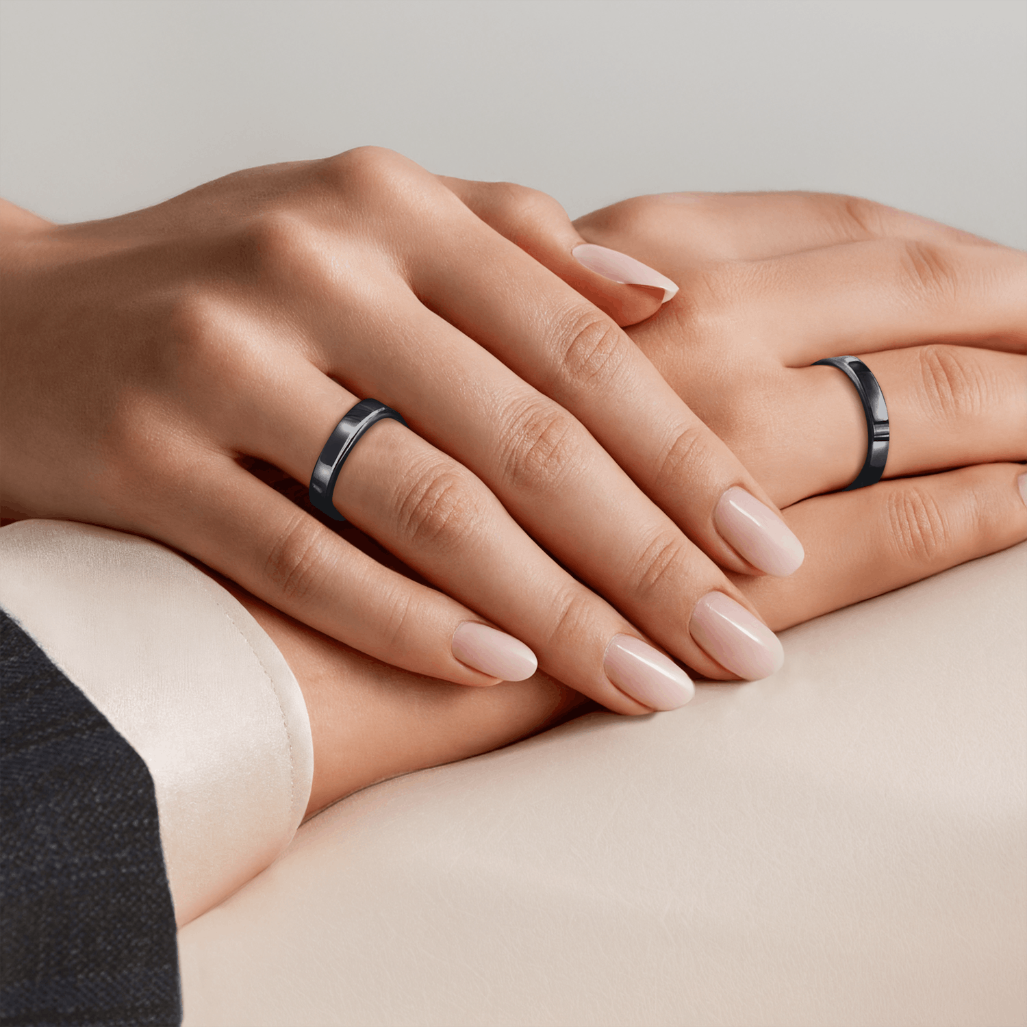 Obrączki ślubne płaskie o klasycznym wzorze, wykonane z czarnego złota (próba 0,333/0,585/0,750), o szerokości 3 mm.