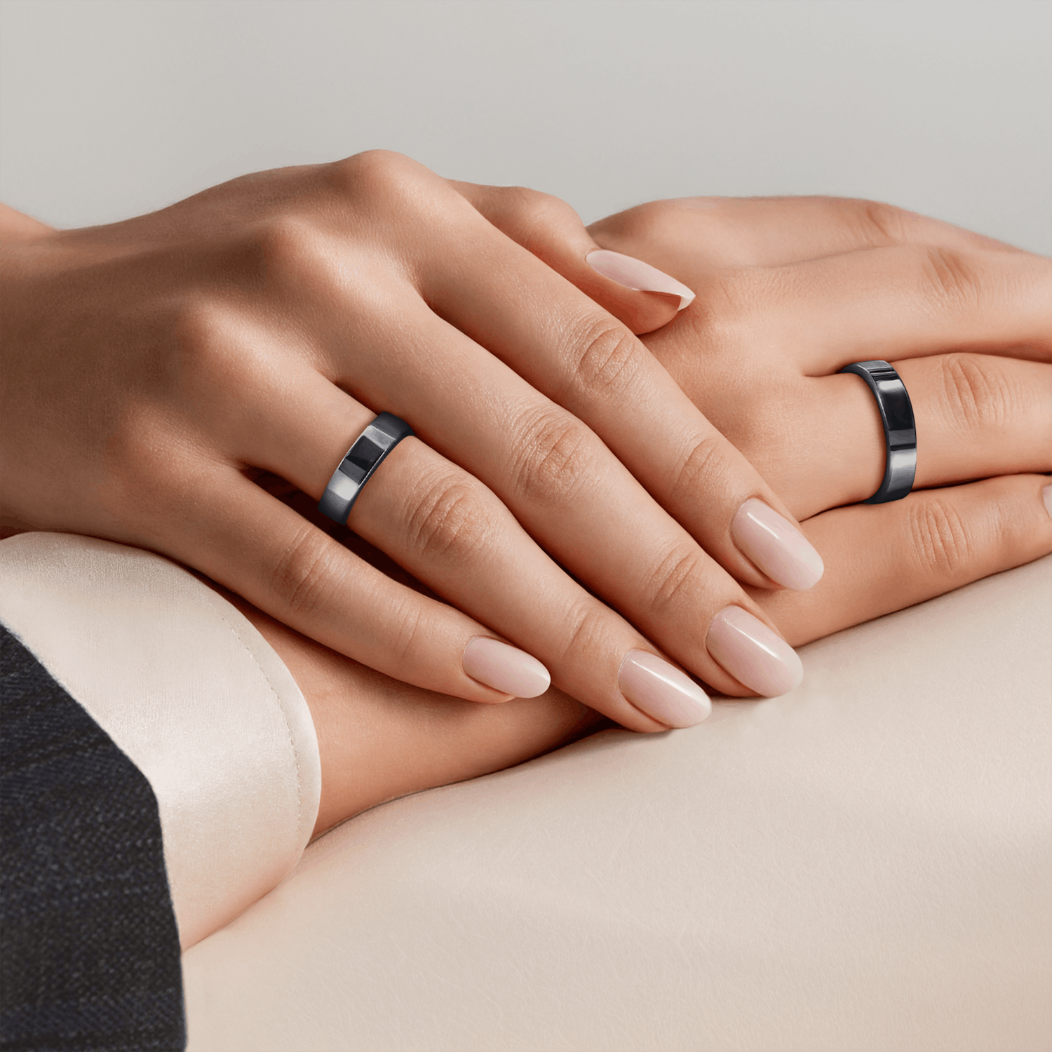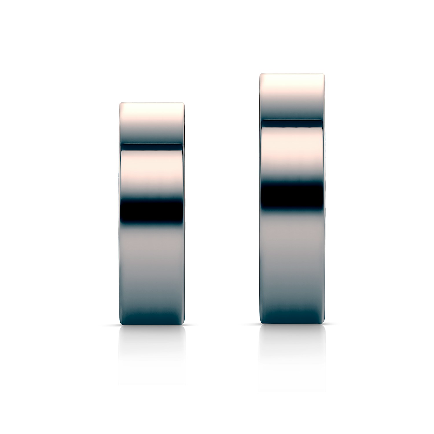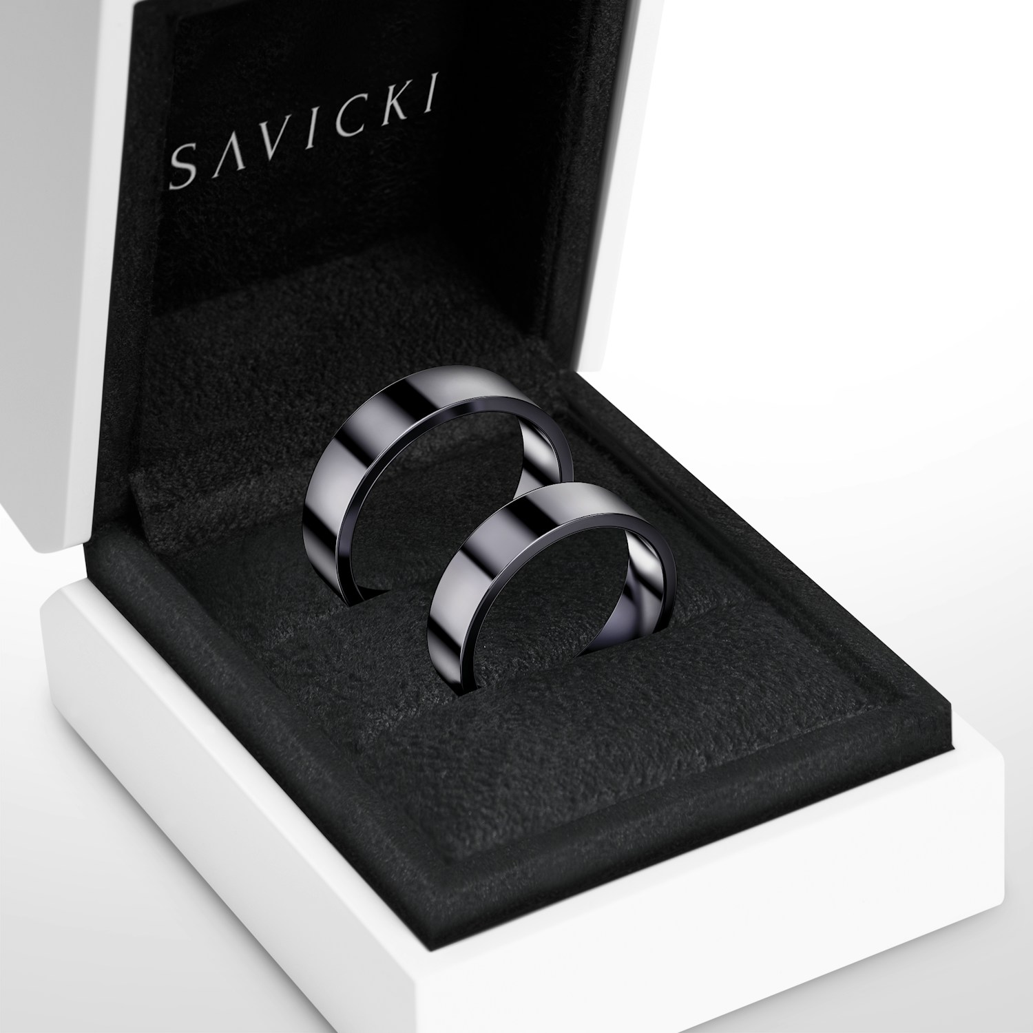 Obrączki ślubne płaskie o klasycznym wzorze, wykonane z czarnego złota (próba 0,333/0,585/0,750), o szerokości 5 mm.