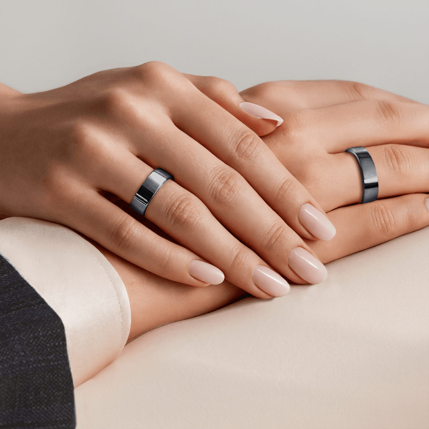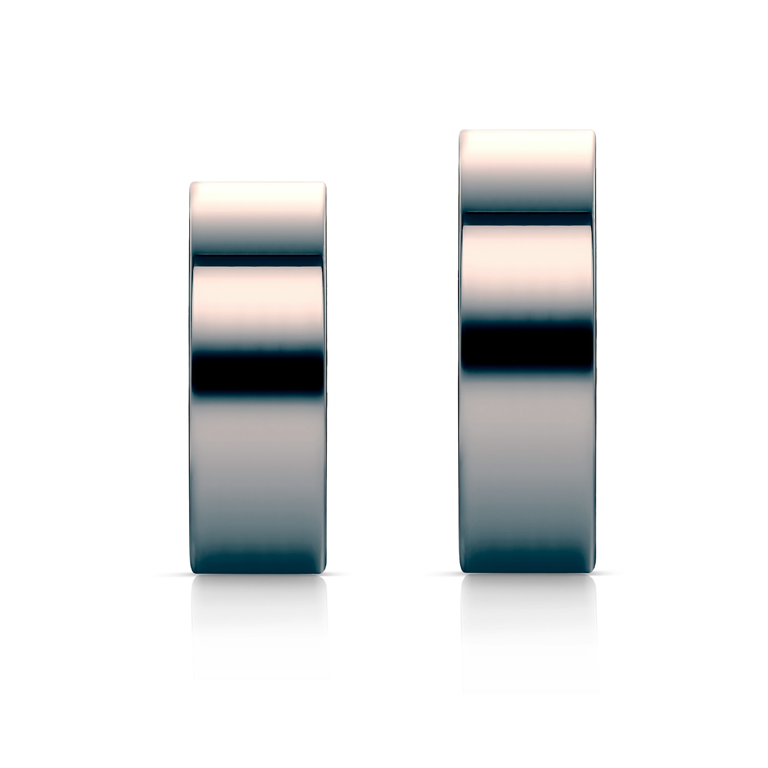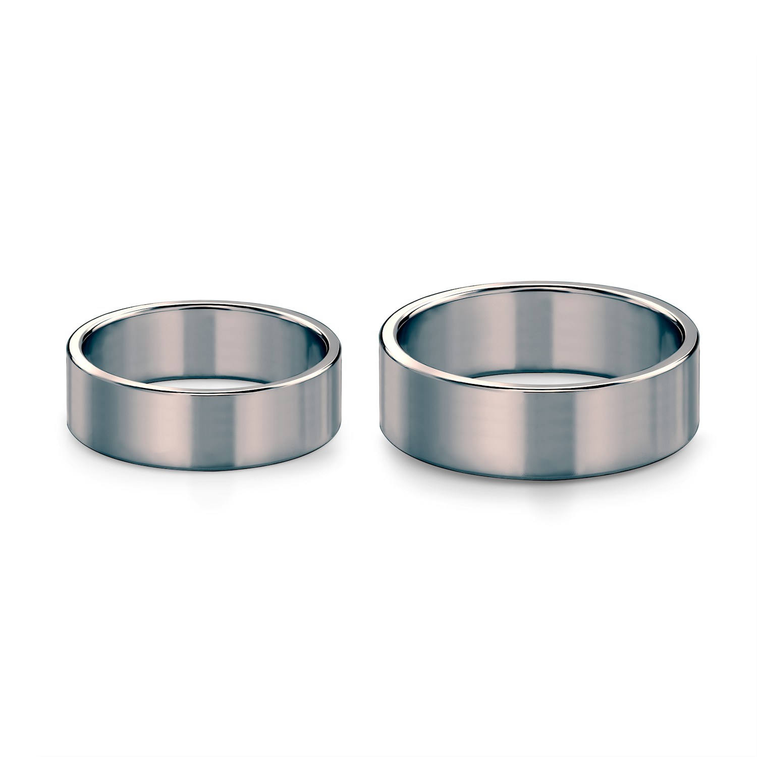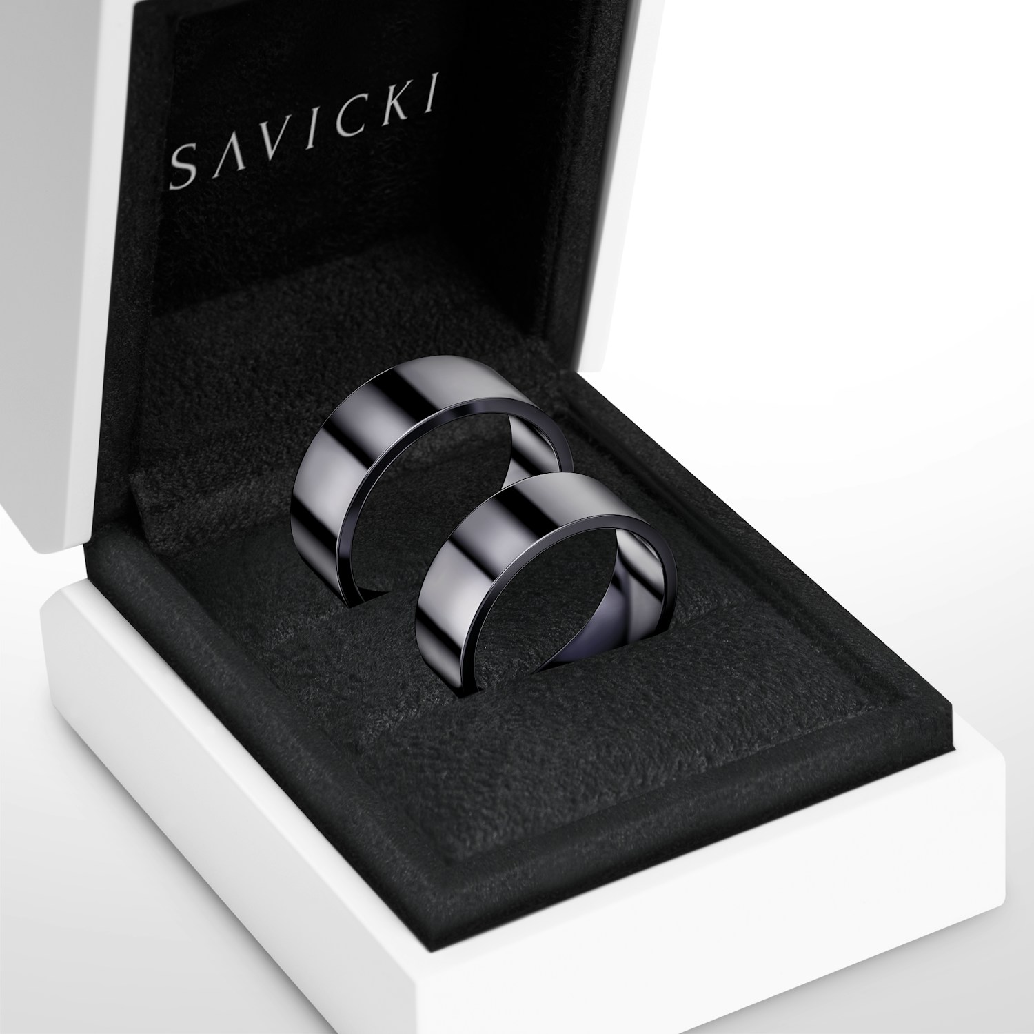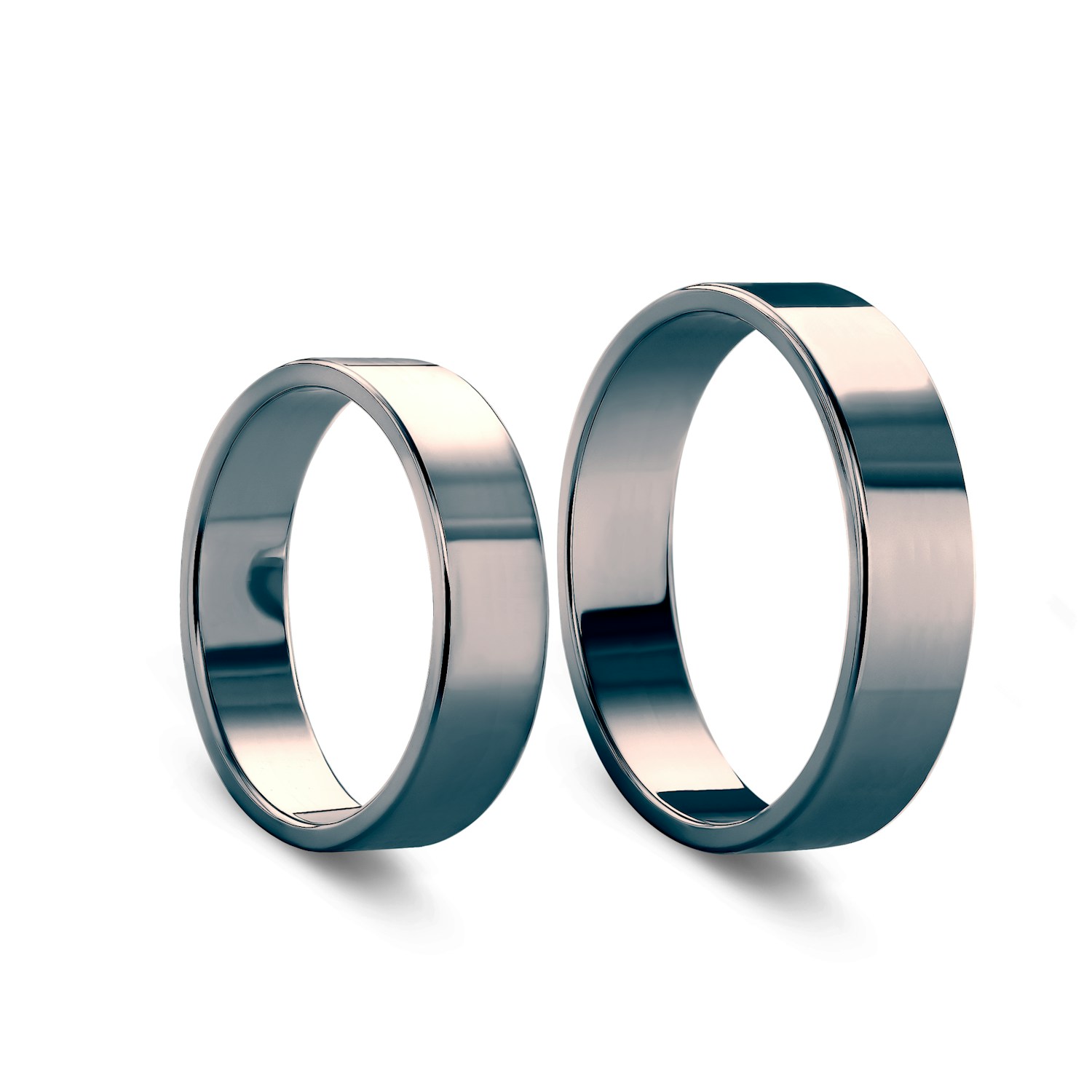 Obrączki ślubne płaskie o klasycznym wzorze, wykonane z czarnego złota (próba 0,333/0,585/0,750), o szerokości 6 mm.