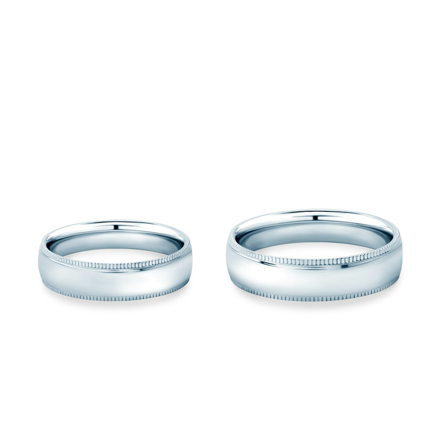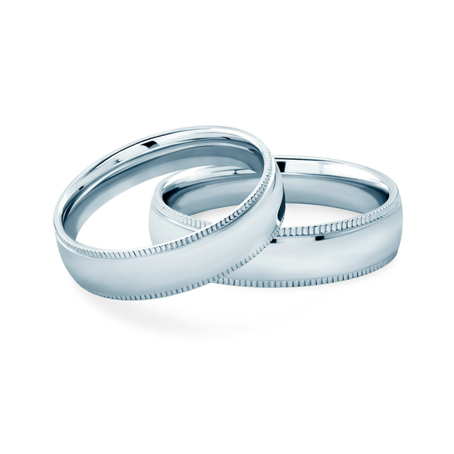Obrączki ślubne półokrągłe o klasycznym wzorze, wykonane z białego złota (próba 0,333/0,585/0,750), o szerokości 5 mm.