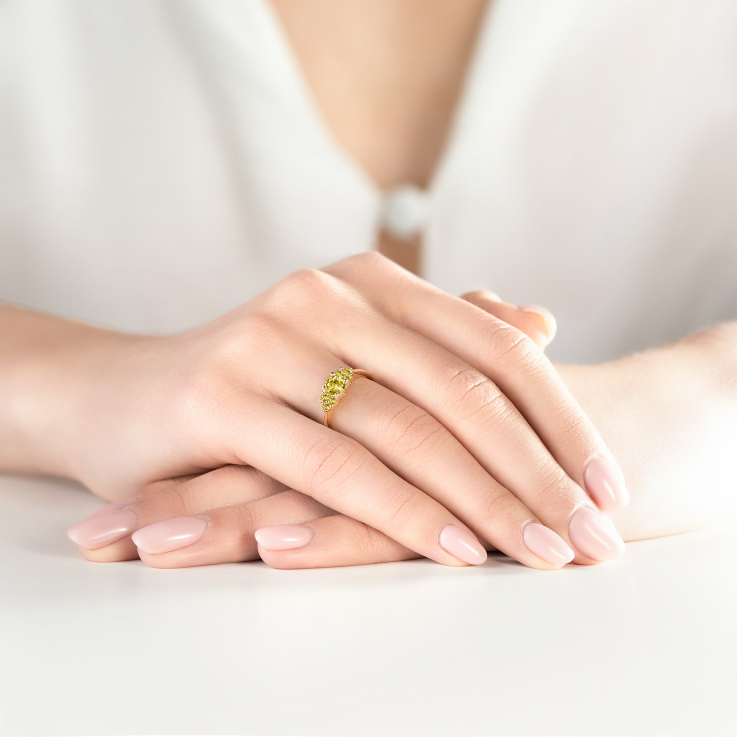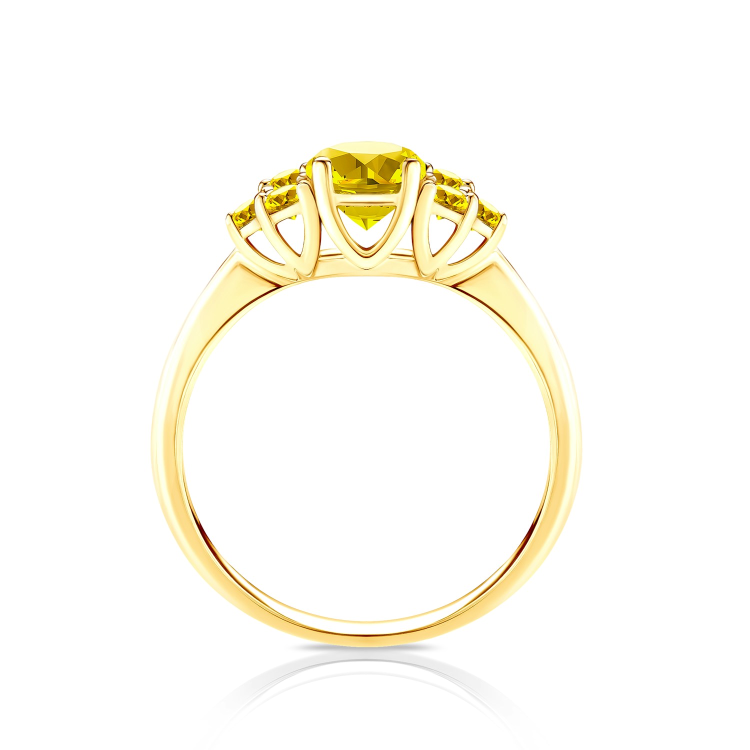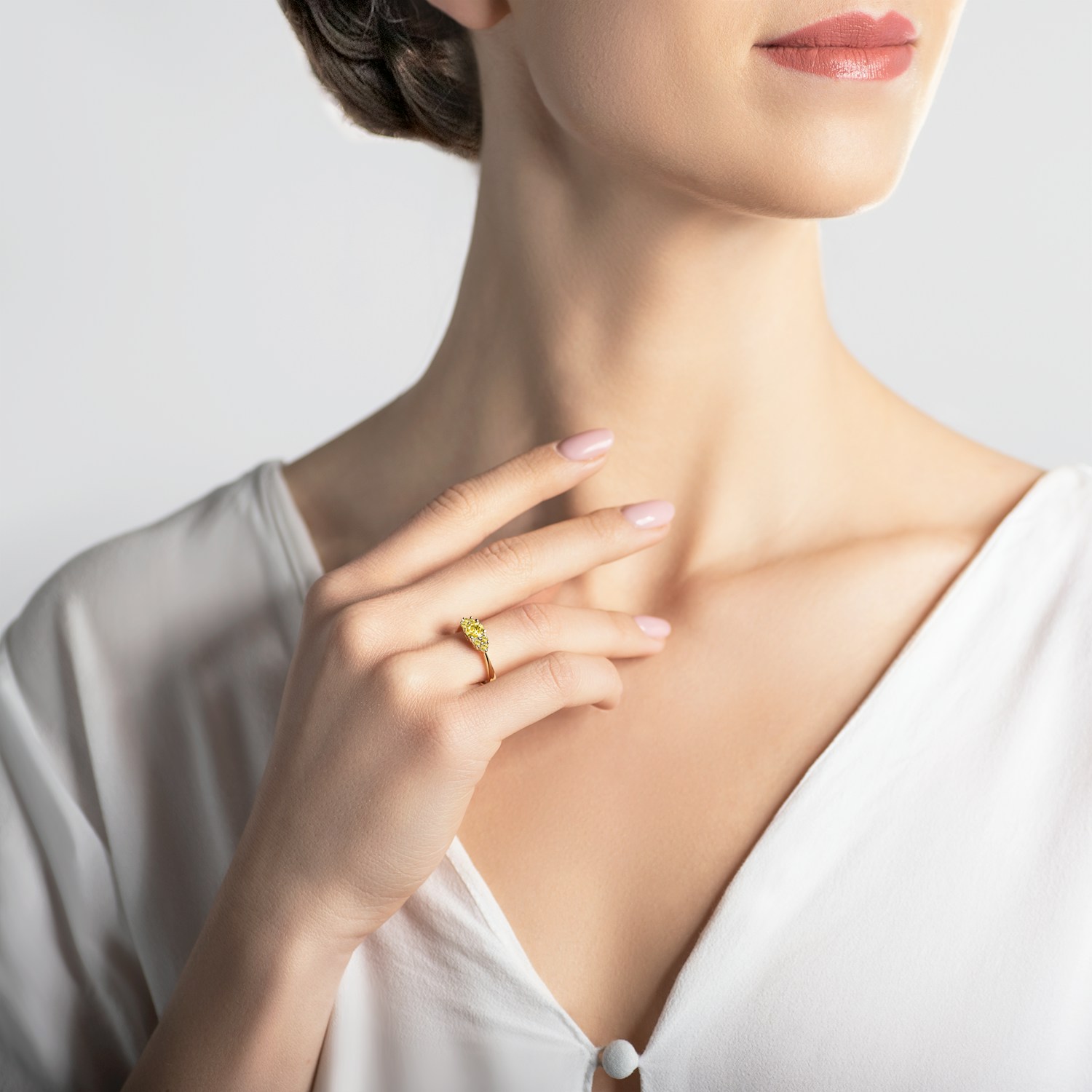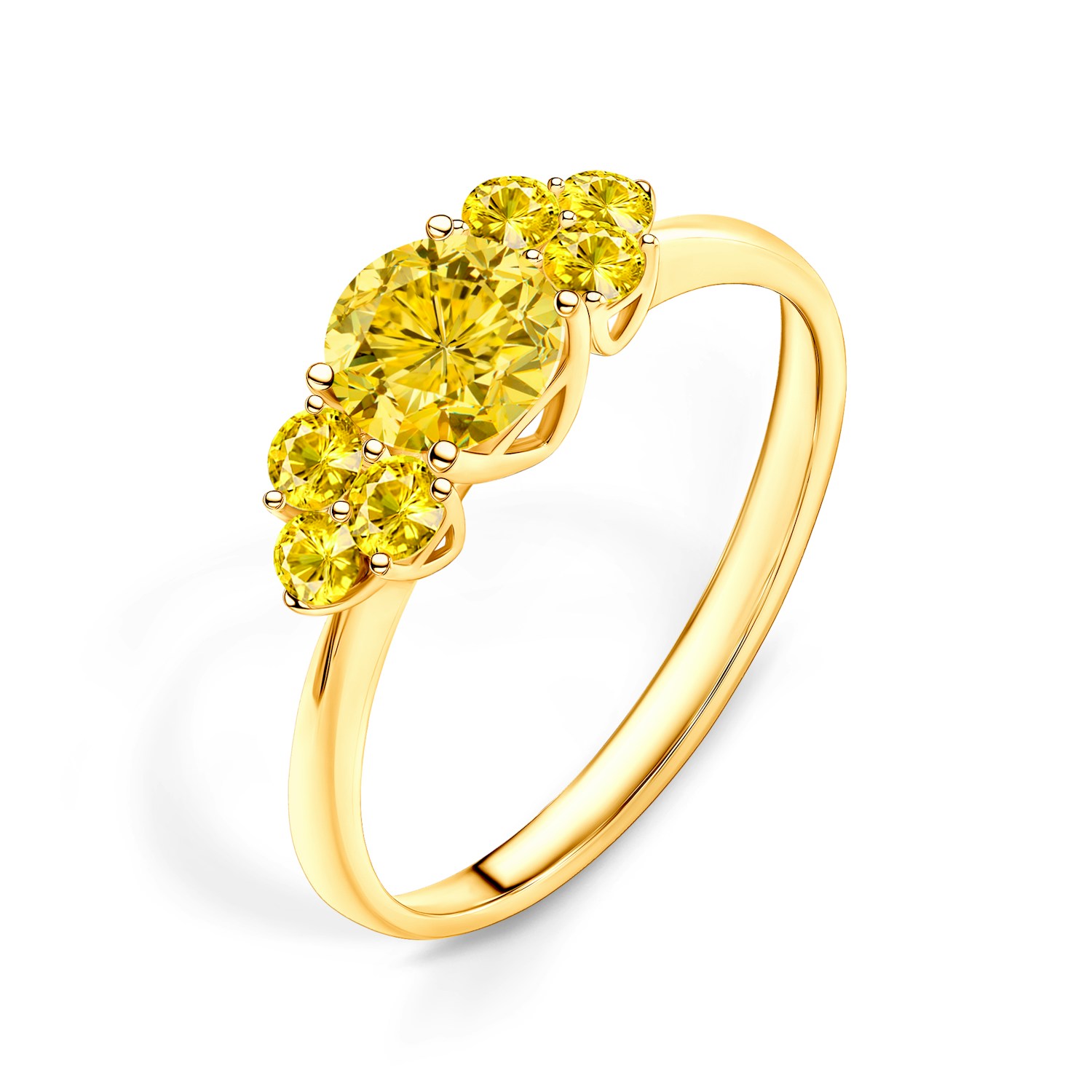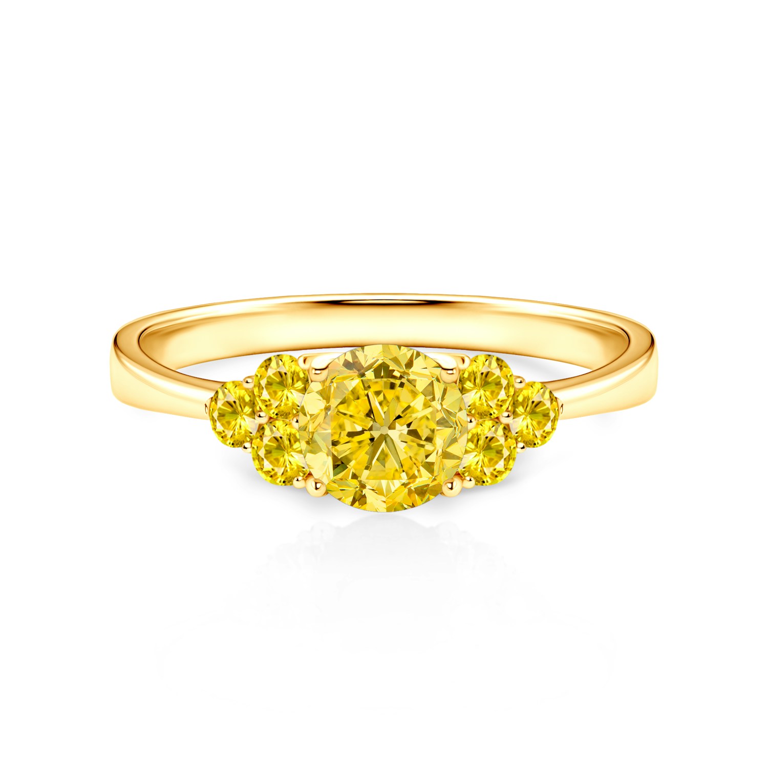 Ten olśniewający pierścionek zaręczynowy z żółtym szafirem o szlifie brylantowym i masie 0,50 ct oraz otaczającymi go sześcioma żółtymi szafirami, wykonany został z 14-karatowego żółtego złota próby 0,585.