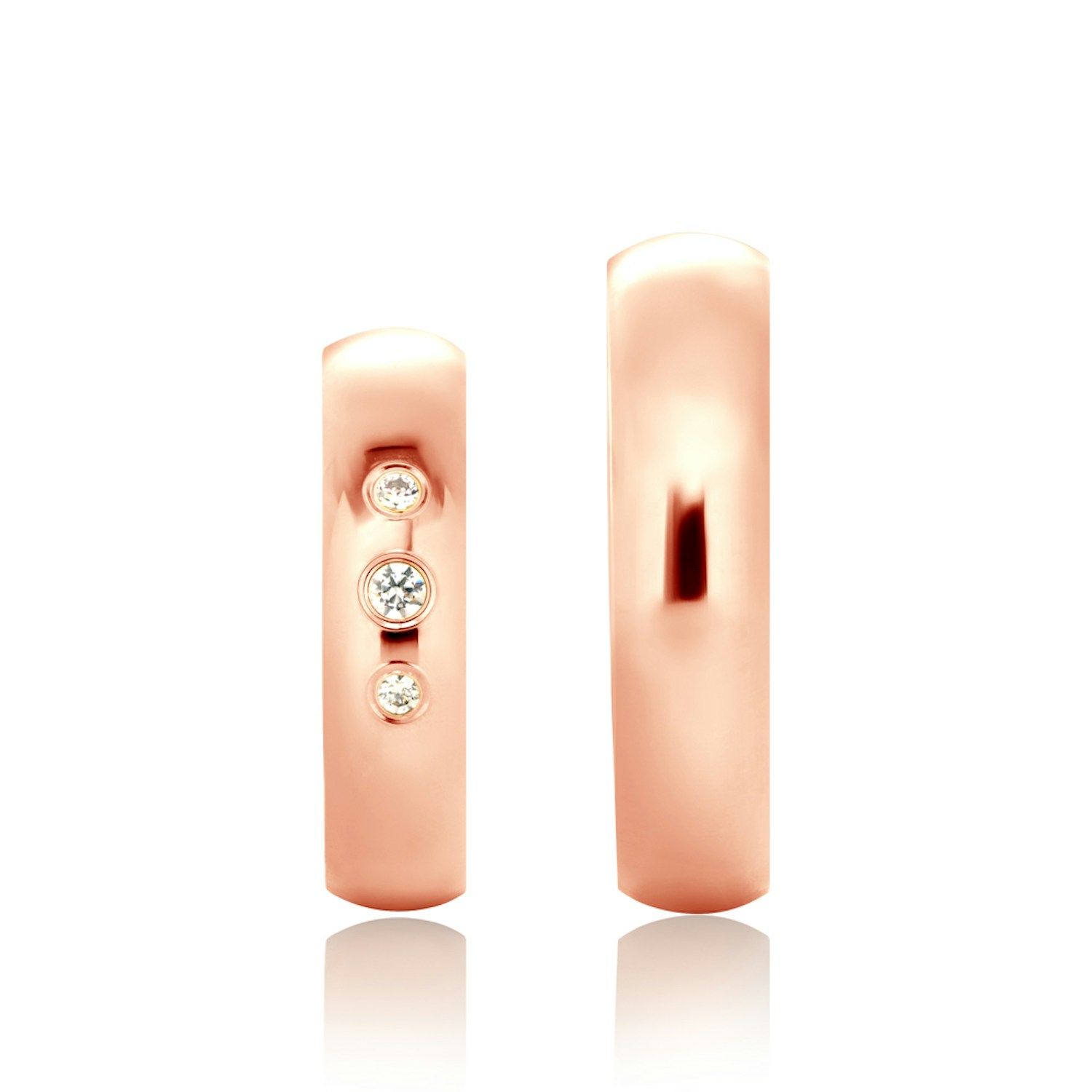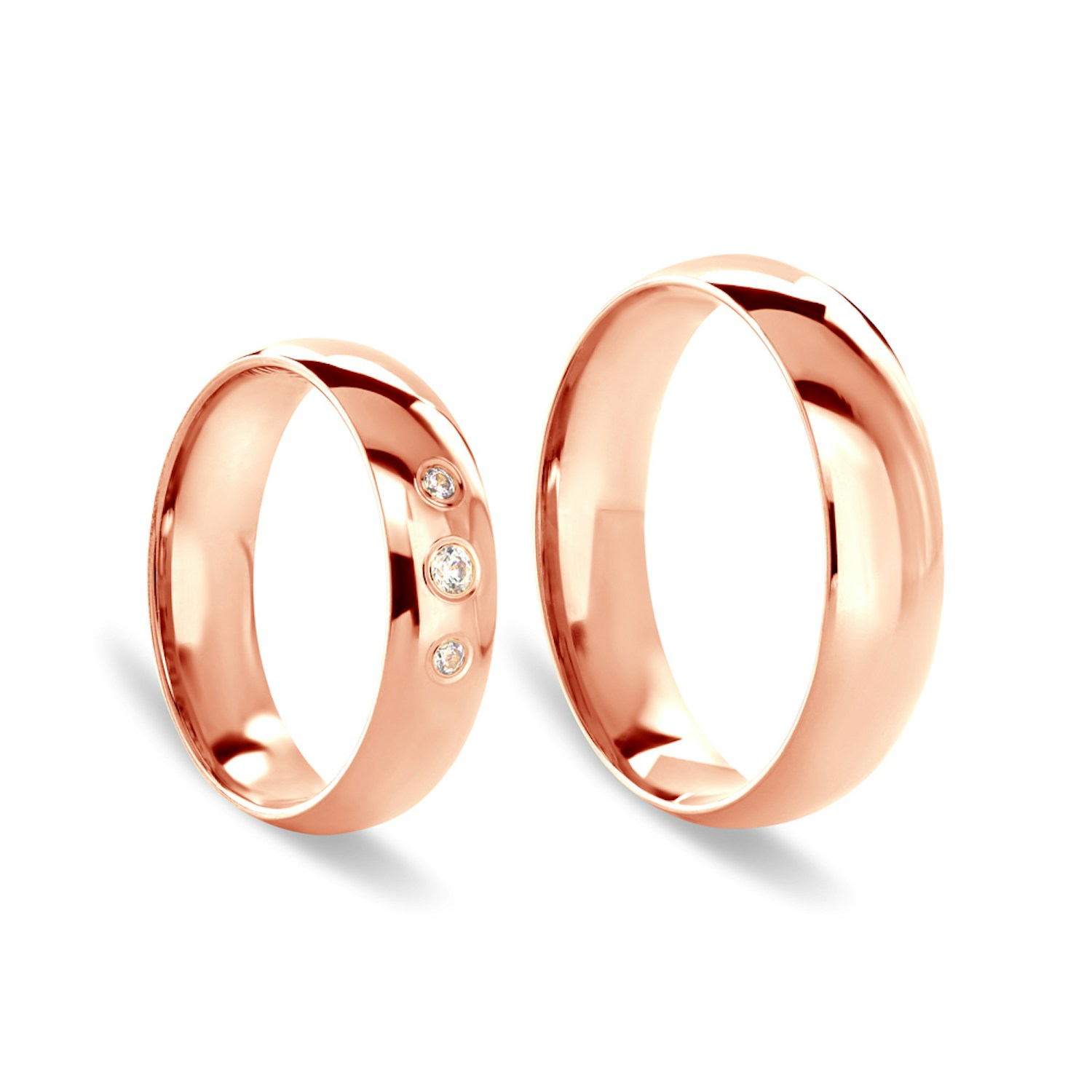 Obrączki ślubne płaskie z kamieniami o klasycznym wzorze, wykonane z różowego złota o szerokości 5 mm. Obrączka damska z diamentami o łącznej masie 0,06 ct.