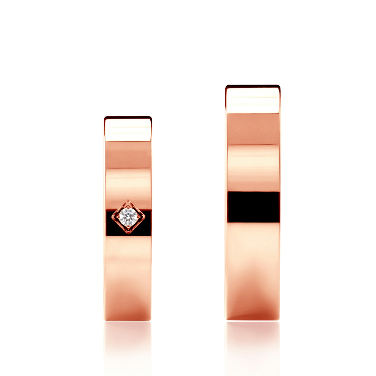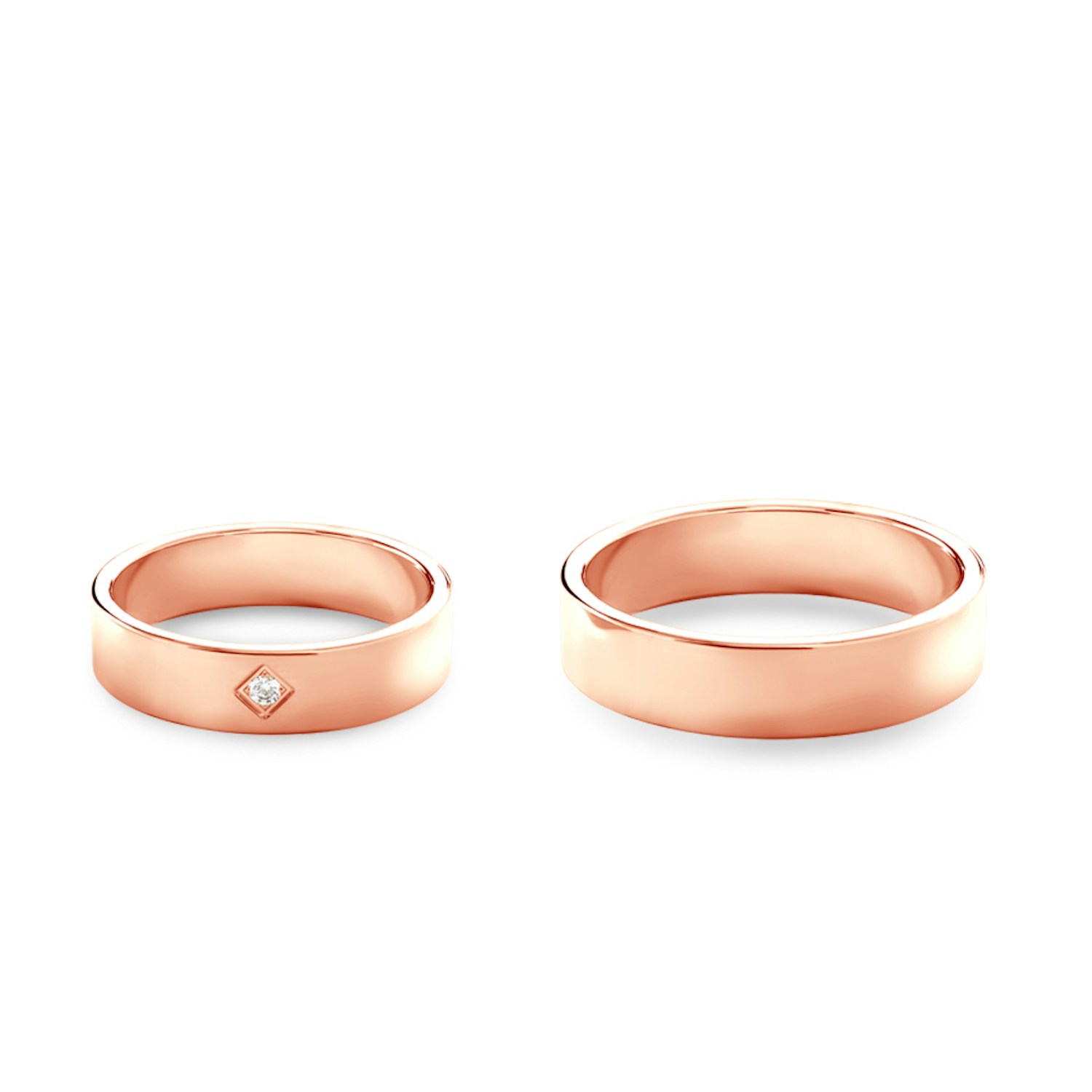 Obrączki ślubne płaskie z kamieniami o klasycznym wzorze, wykonane z różowego złota o szerokości 5 mm. Obrączka damska z diamentem o masie 0,02 ct.