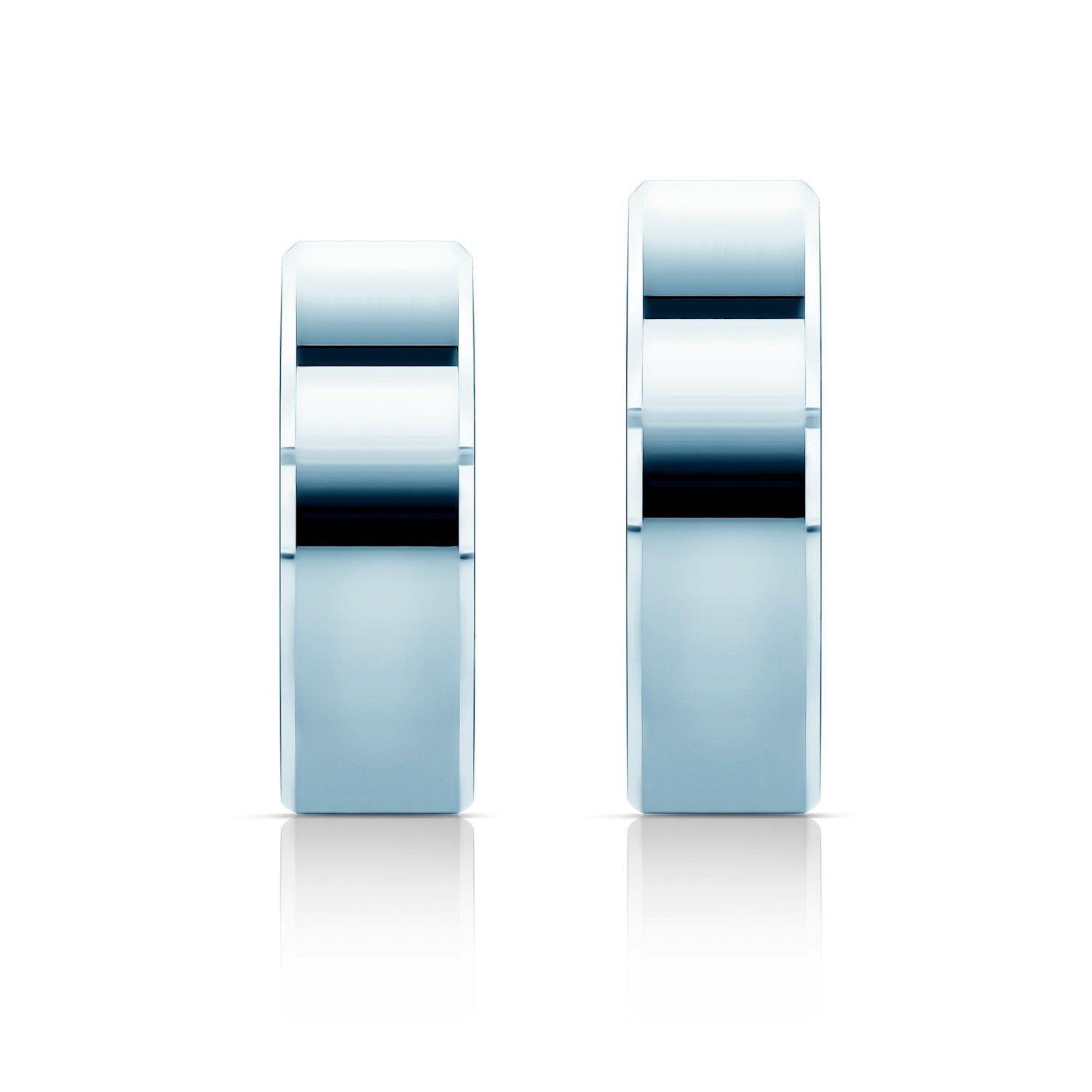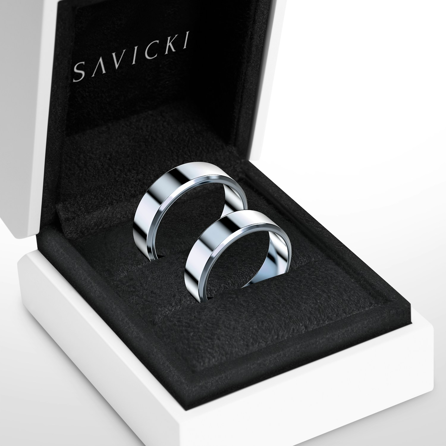 Obrączki ślubne z fazą o klasycznym wzorze, wykonane z białego złota (próba 0,333/0,585/0,750), o szerokości 6 mm.