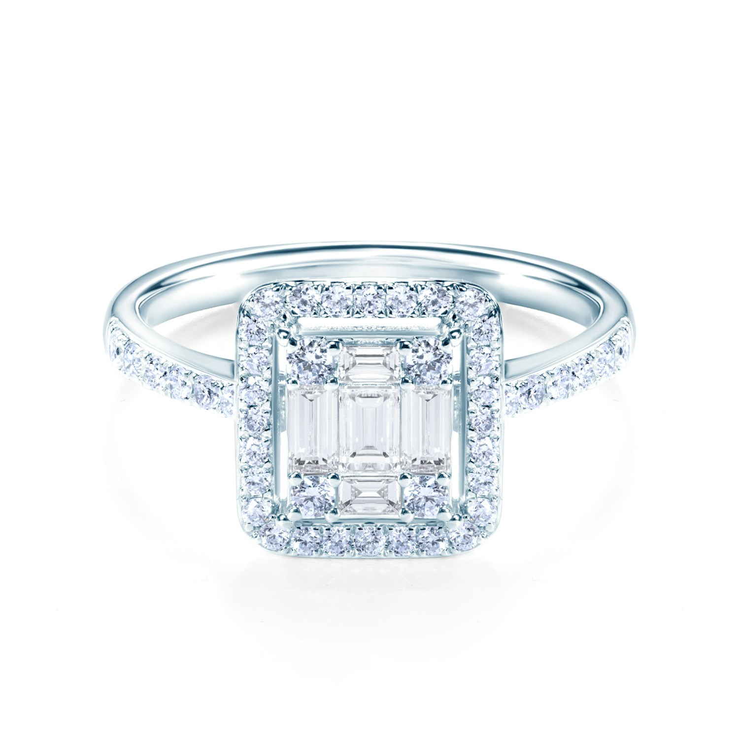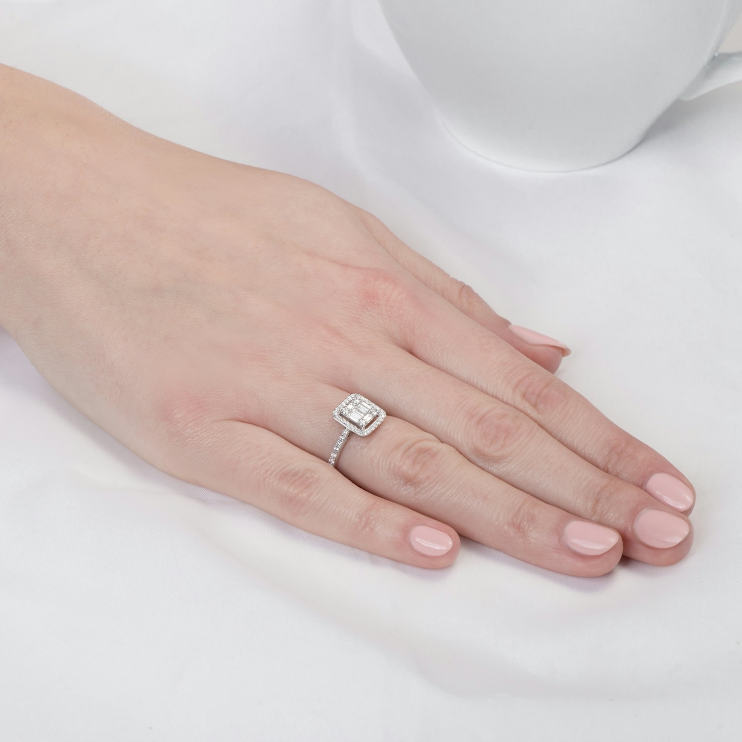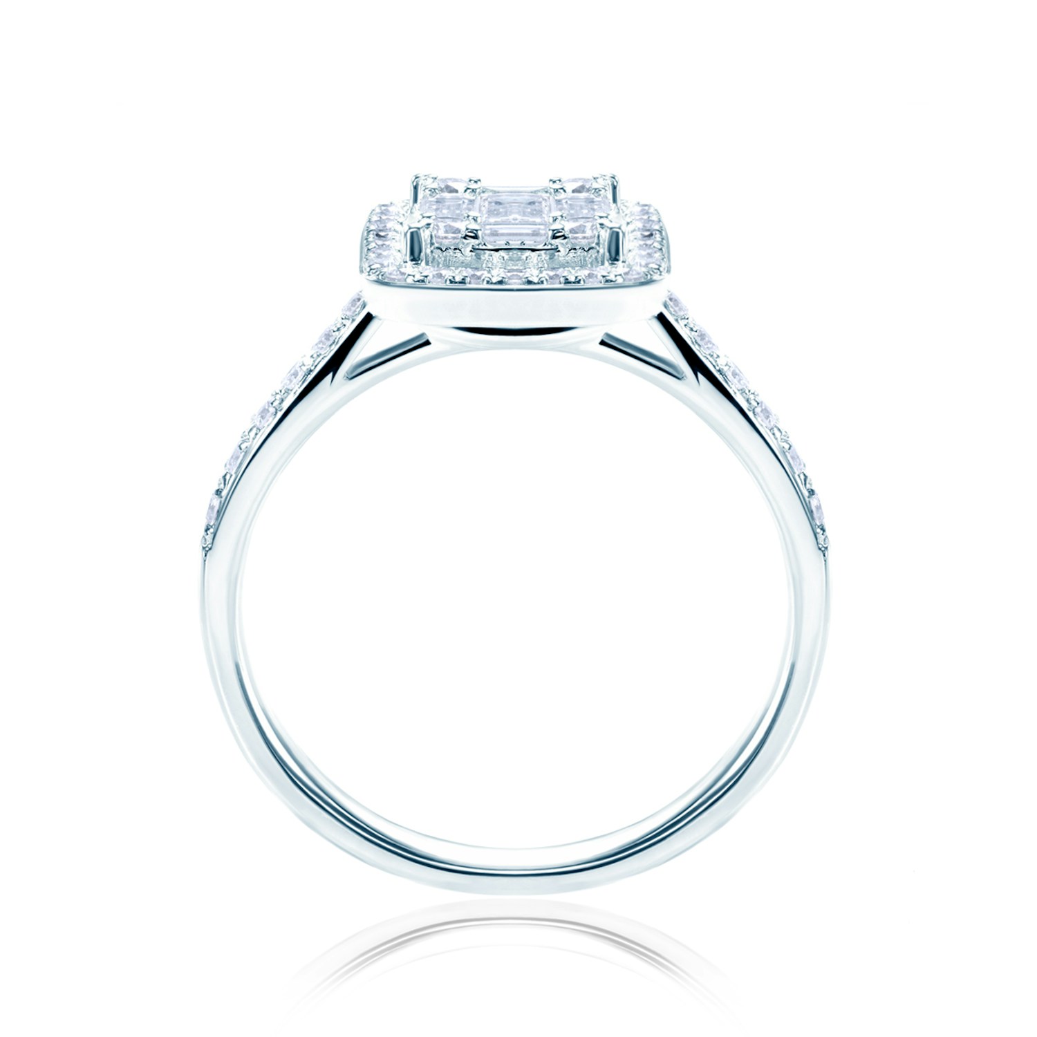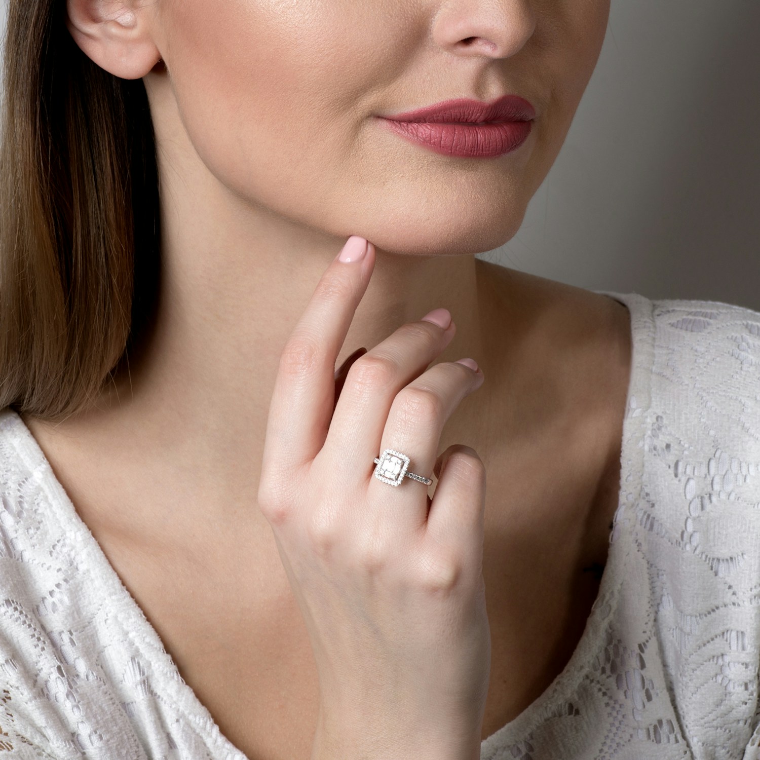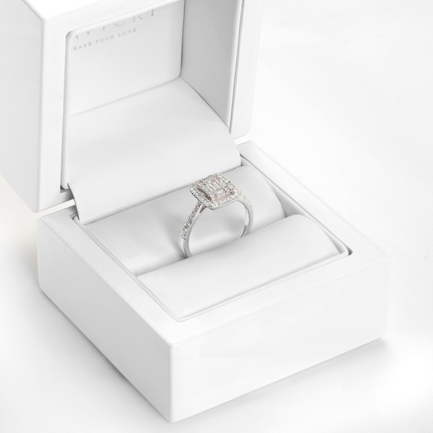 Pierścionek zaręczynowy z 49 diamentami (łączna masa 0,7 ct) perfekcyjnej czystości i kolorze SI2/H. Wykonany z 14-karatowego białego złota (próba 0,585).