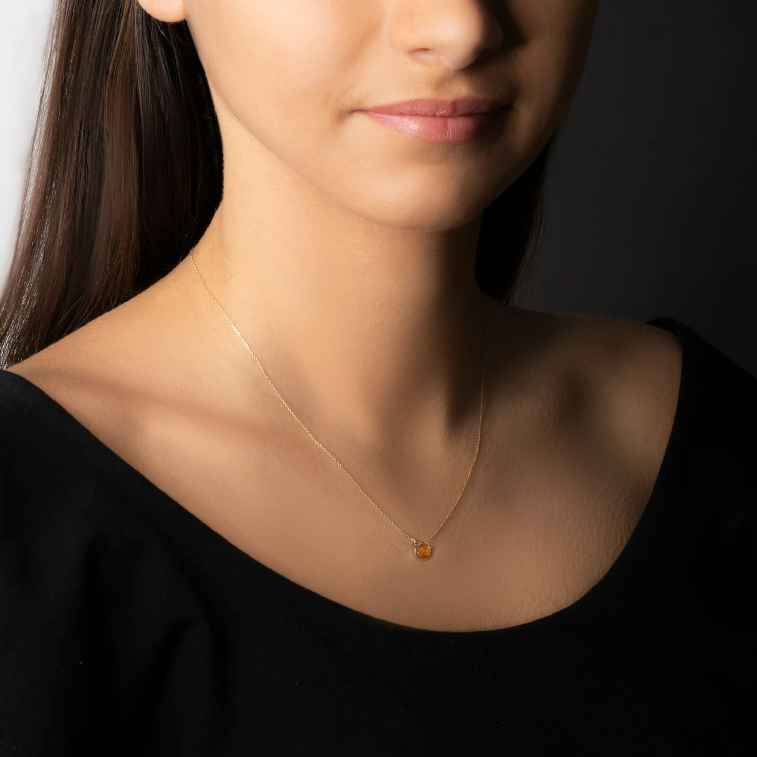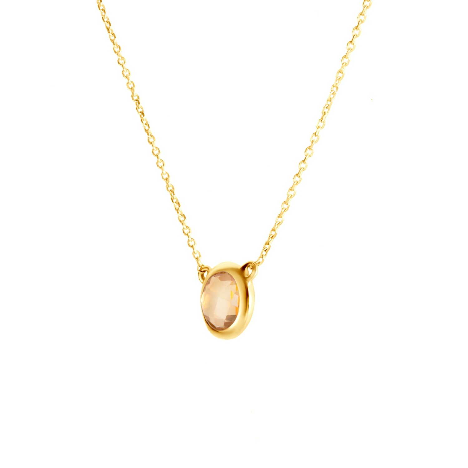 W naszyjniku został osadzony cytryn o masie 0,58 ct ze szlifem brylantowym. Naszyjnik wykonany z żółtego złota(próba 585).