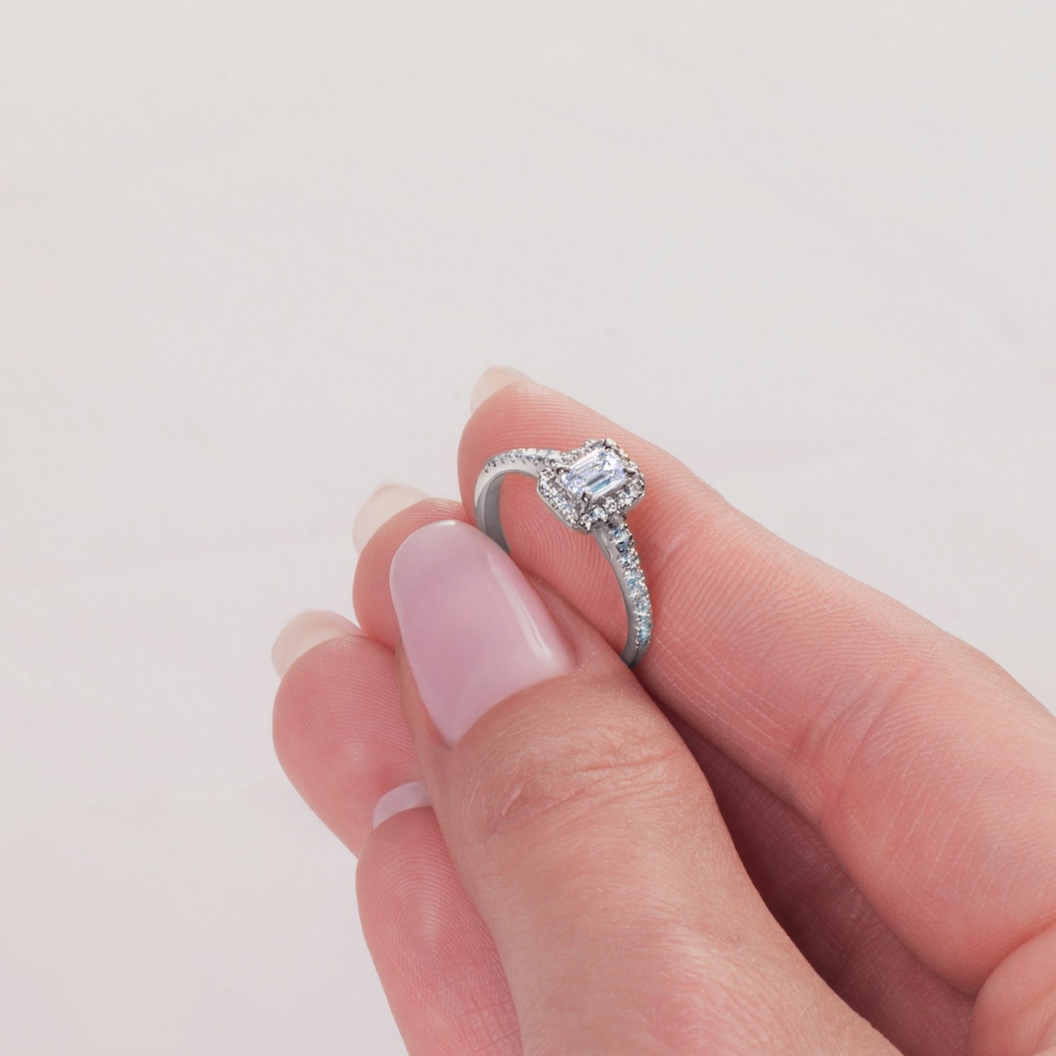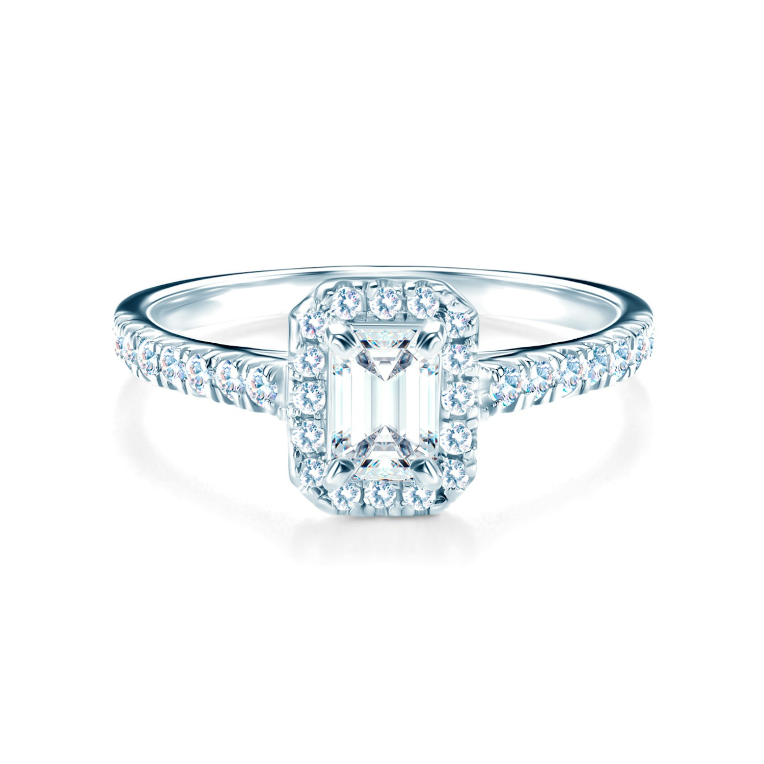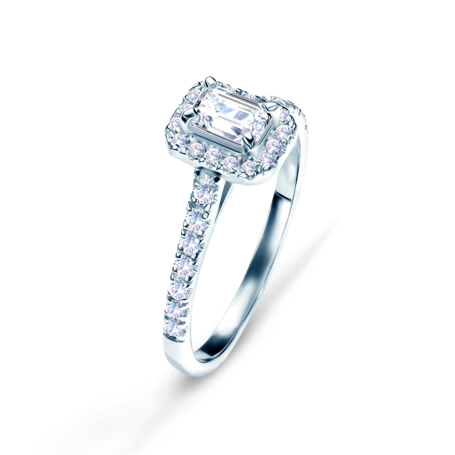 Pierścionek zaręczynowy z centralnie umieszczonym białym szafirem o masie 0,30 ct oraz perfekcyjnym szlifie szmaragdowym. Boczne diamenty posiadają łączną masę 0,20 ct, nieskazitelną czystość i kolor SI/H z doskonałym szlifem brylantowym. Wykonany z 14-karatowego białego złota (próba 585).