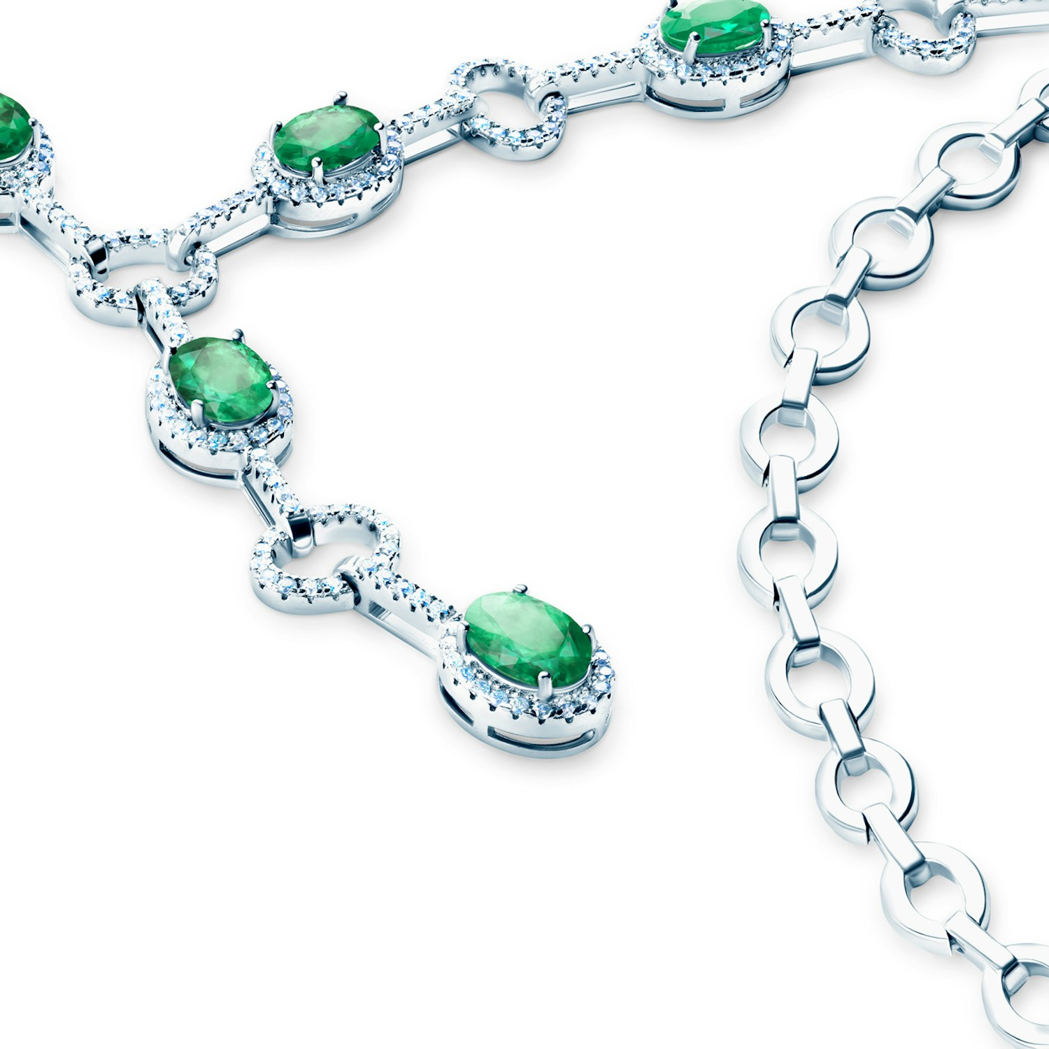 Kolia wykonana z 14-karatowego białego złota (próba 0,585). W kolii zostały osadzone szmaragdy o łącznej masie 6,08 ct oraz diamenty o łącznej masie 1,77 ct o nieskazitelnej barwie i czystości SI2/H.