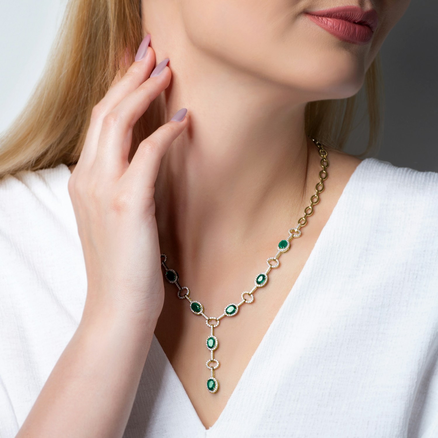 Kolia wykonana z 14-karatowego żółte złota (próba 0,585). W kolii zostały osadzone szmaragdy o łącznej masie 6,08 ct oraz diamenty o łącznej masie 1,77 ct o nieskazitelnej barwie i czystości SI2/H.
