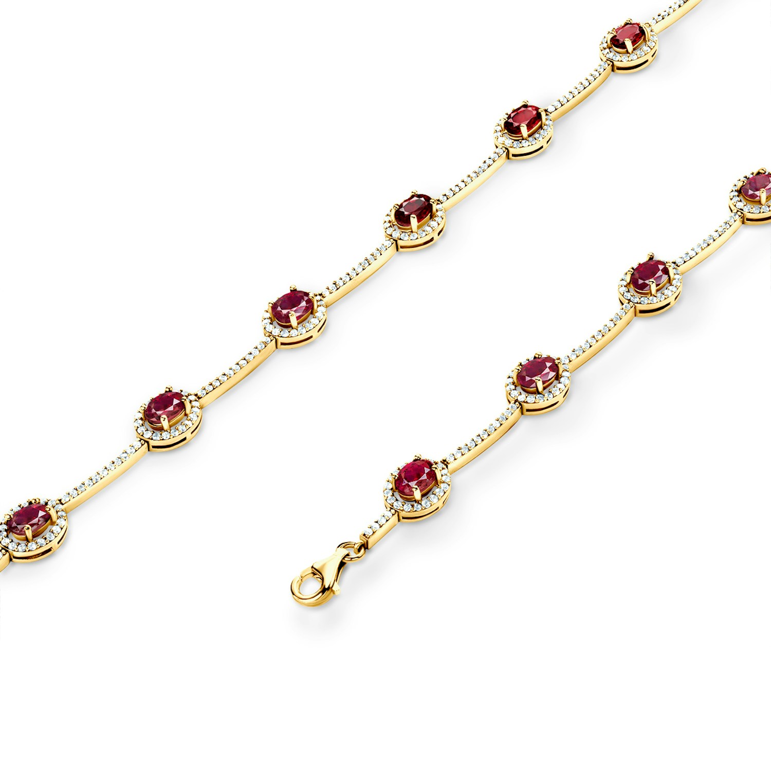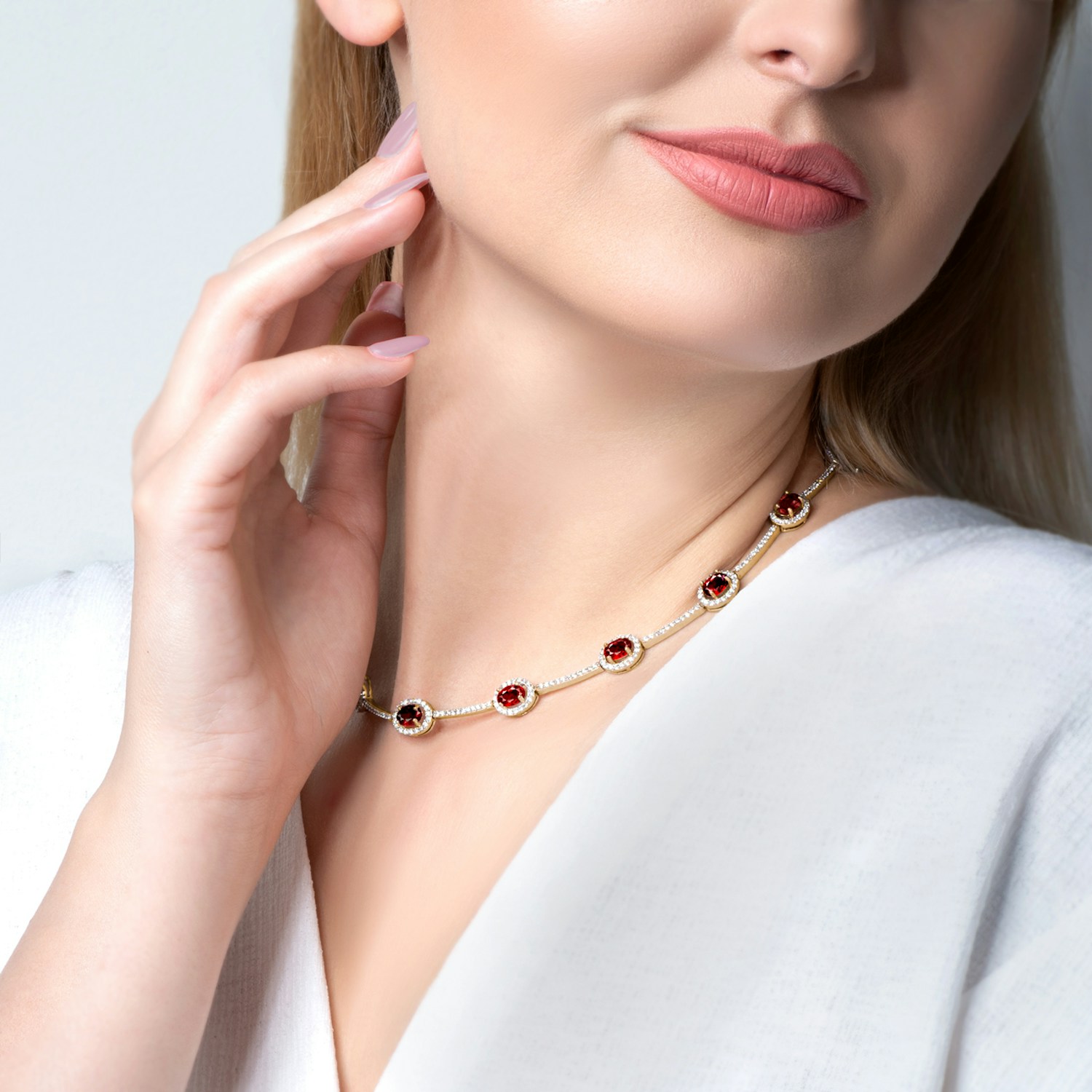 Naszyjnik wykonany z 14-karatowego żółtego złota (próba 0,585). W naszyjniku zostały osadzone rubiny o łącznej masie 11,40 ct oraz diamenty o łącznej masie 4,47 ct o nieskazitelnej barwie i czystości SI2/H.