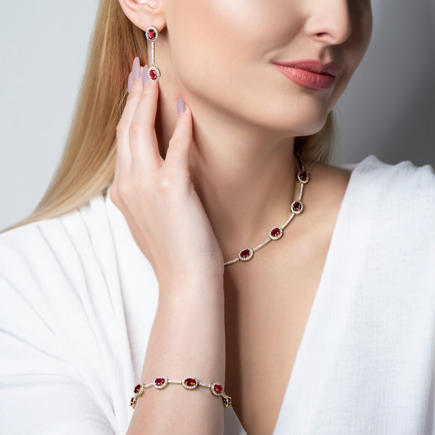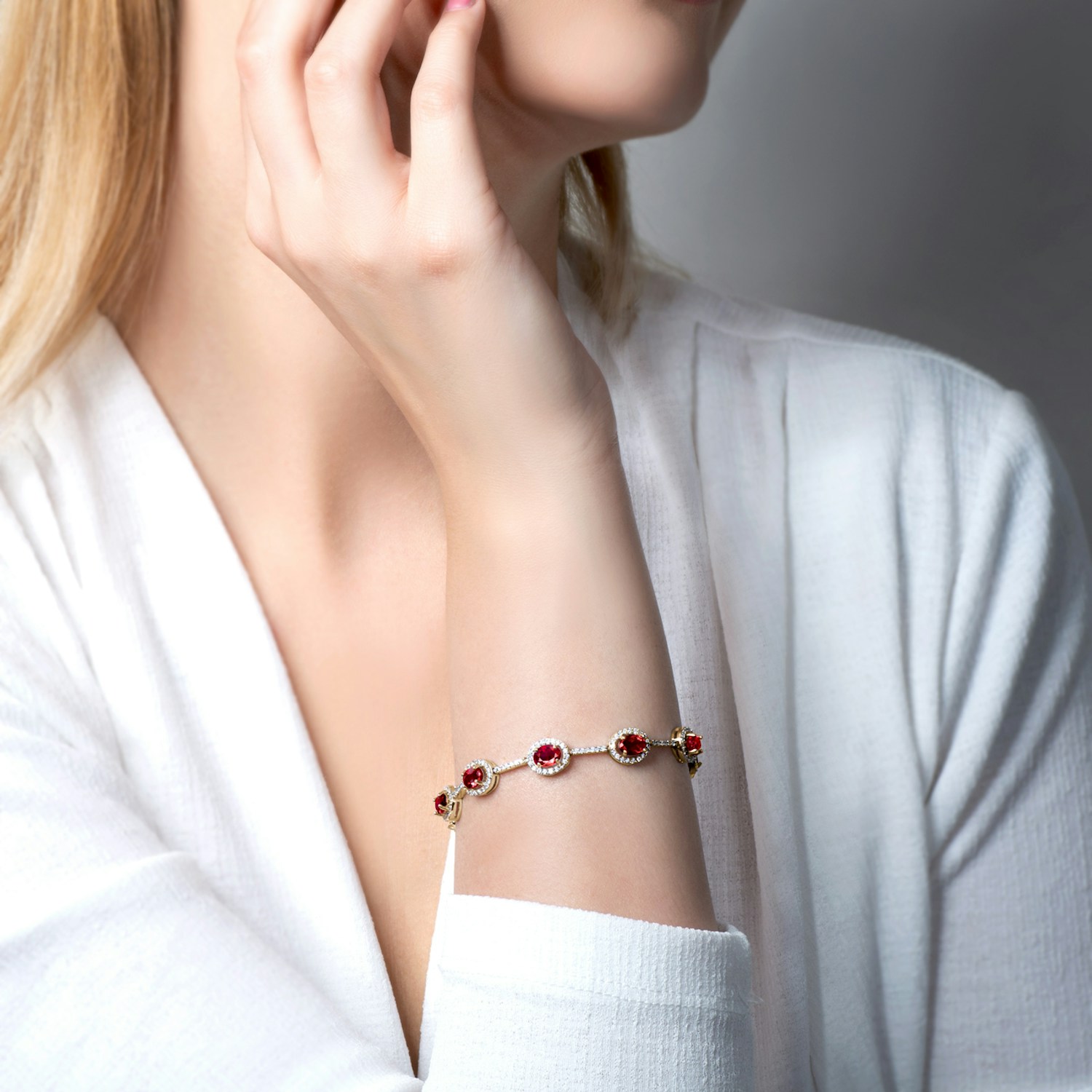 Bransoletka wykonana z 14-karatowego żółtego złota (próba 0,585). W bransoletce zostały osadzone rubiny o łącznej masie 6,84 ct oraz diamenty o łącznej masie 2,19 ct o nieskazitelnej barwie i czystości SI2/H.