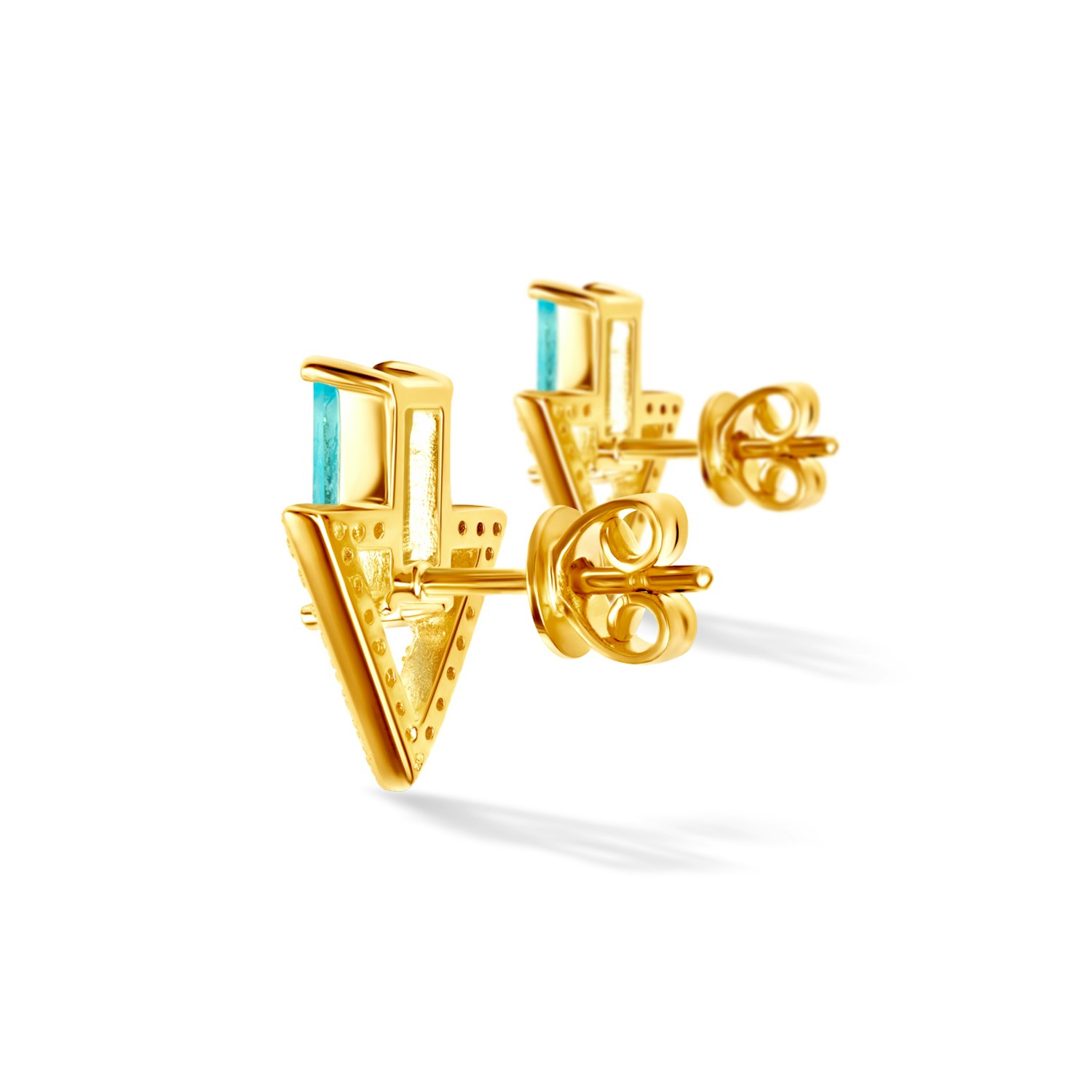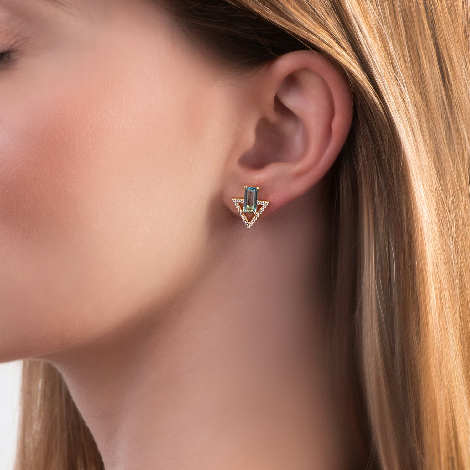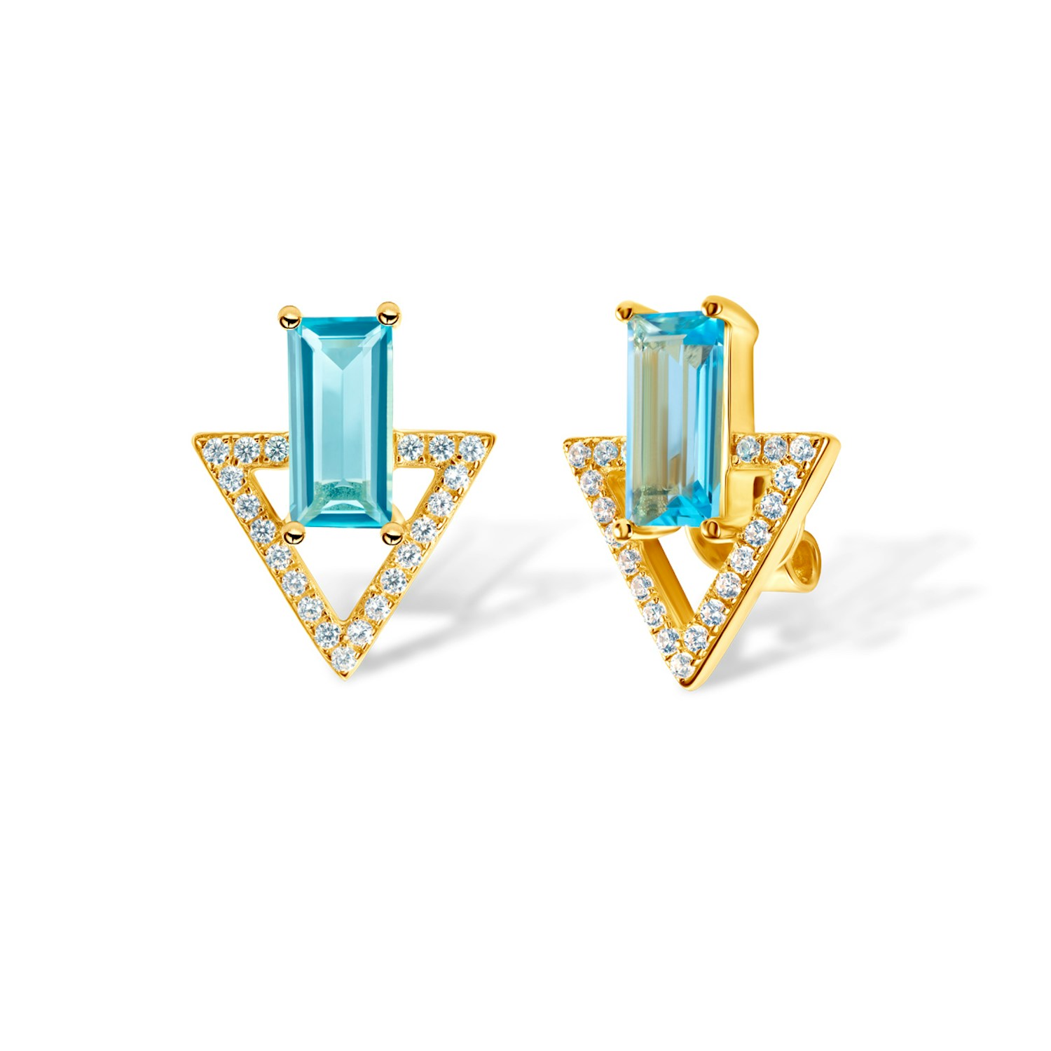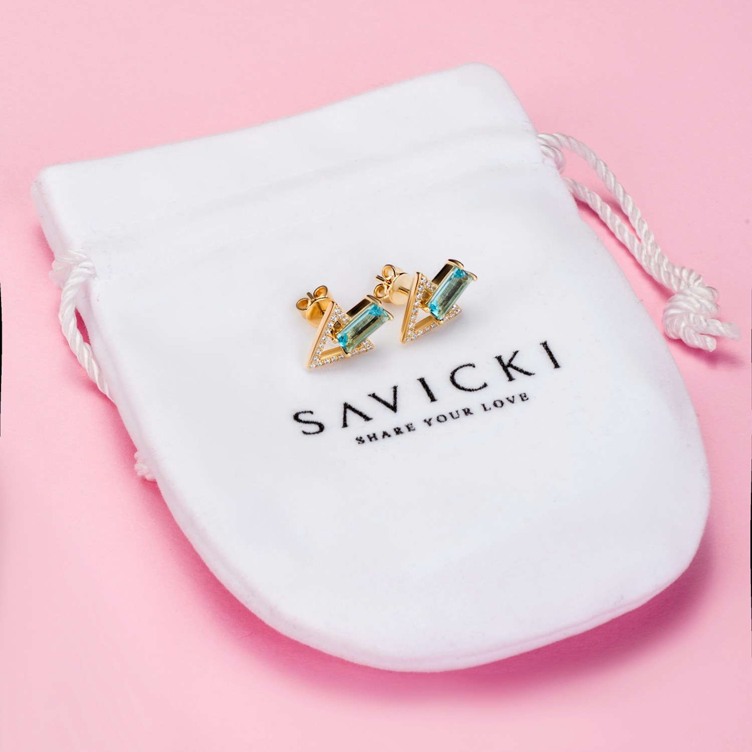 Kolczyki Savicki wykonane ze srebra (próba 925) pozłocone 22-karatowym żółtym złotem. W kolczykach osadzone zostały 2 niebieskie topazy o łącznej masie 1,24 ct i szlifie bagieta oraz 42 cyrkonie o szlifie brylantowym.