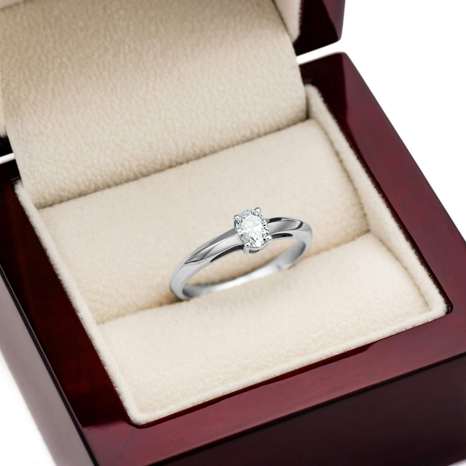 Pierścionek zaręczynowy z diamentem 0,30 ct o szlifie owalnym wysokiej czystości SI/G, wykonany z 14-karatowego białego złota (próba 0,585).