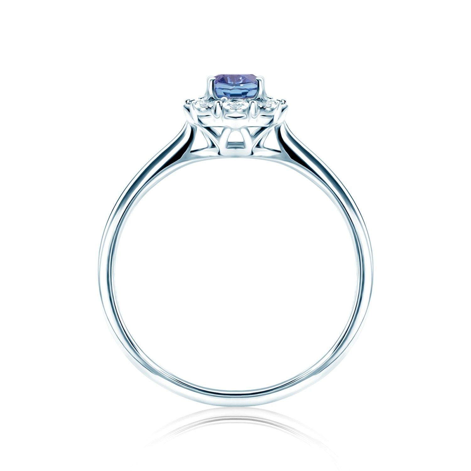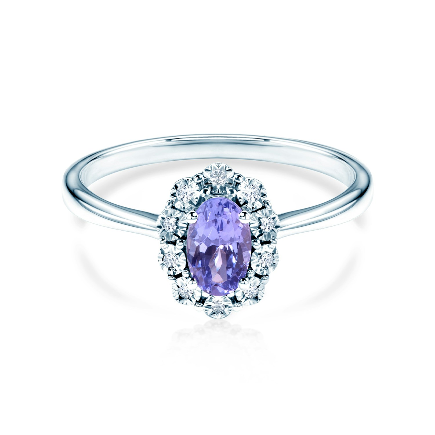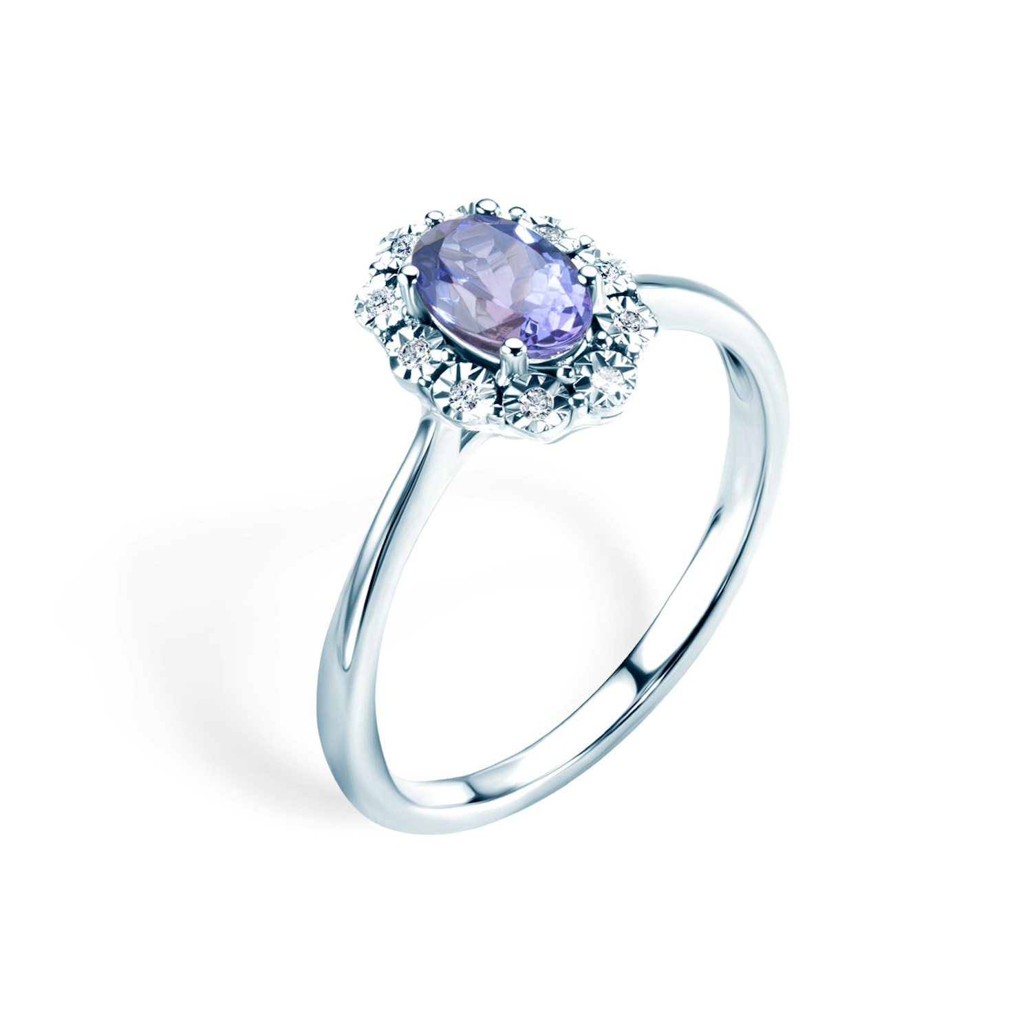 Pierścionek zaręczynowy z centralnym tanzanitem o masie 0,60 ct i szlifie owalnym oraz 10 diamentami o łącznej masie 0,04 ct, szlifie brylantowym, czystości SI2/H, wykonany z 14-karatowego białego złota (próba 585).