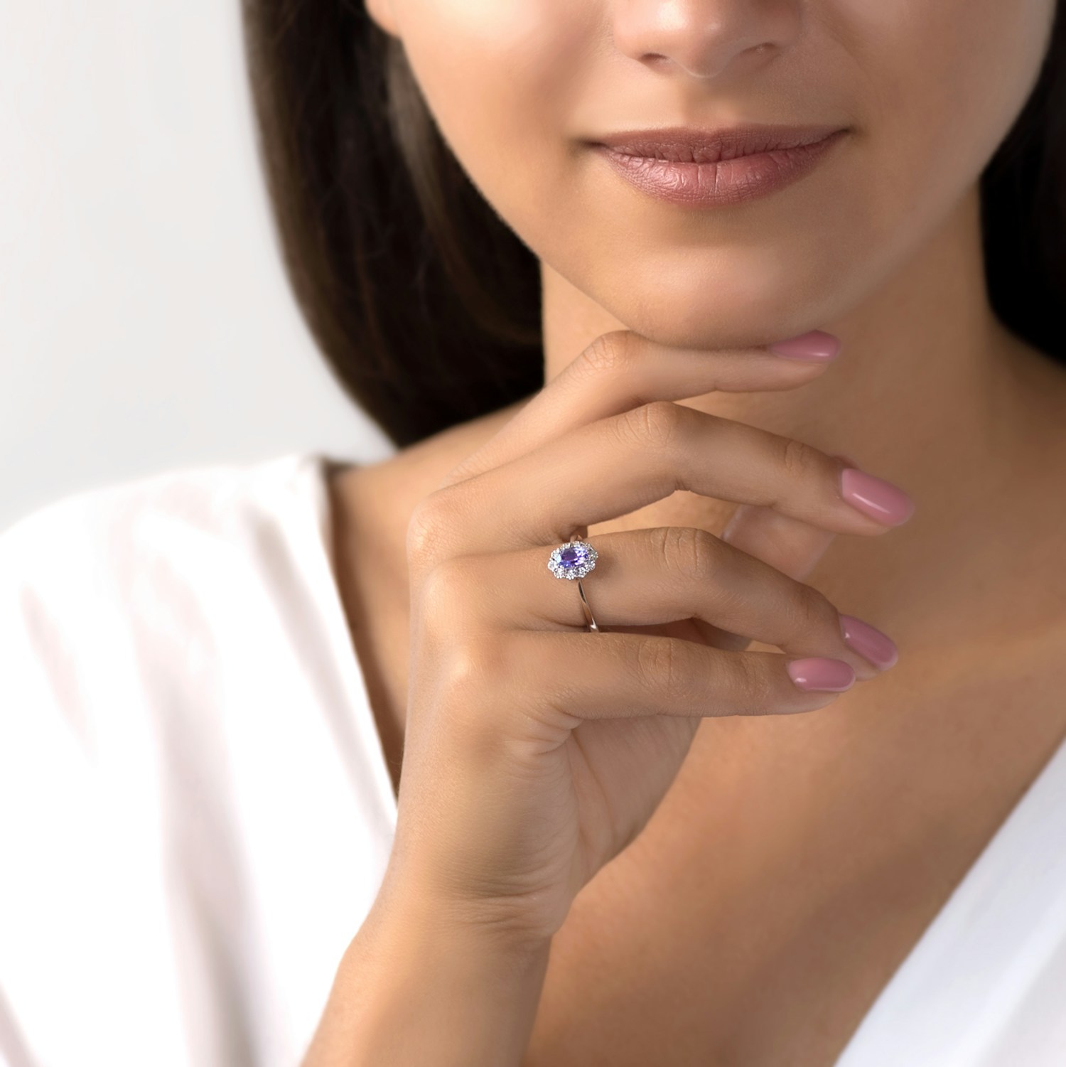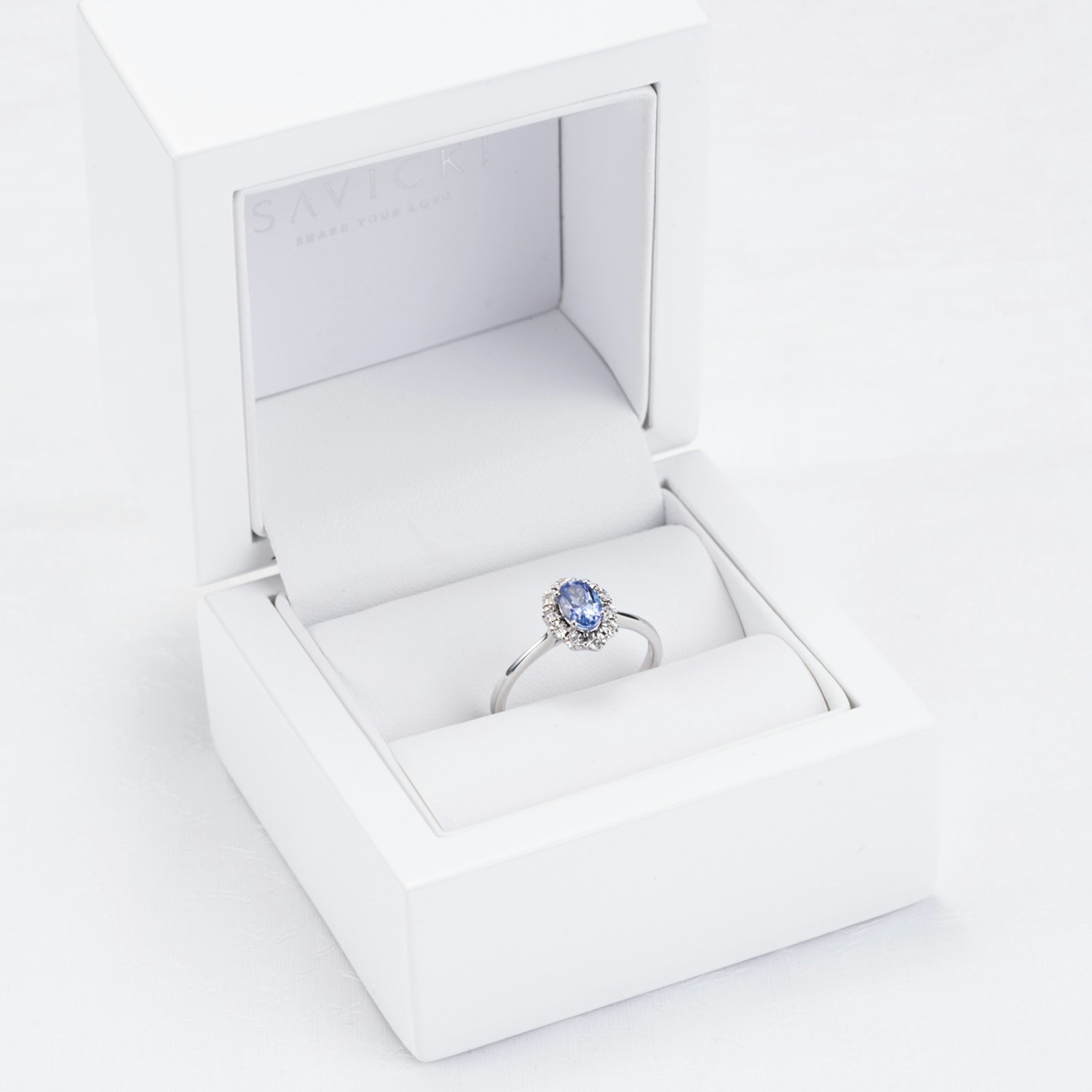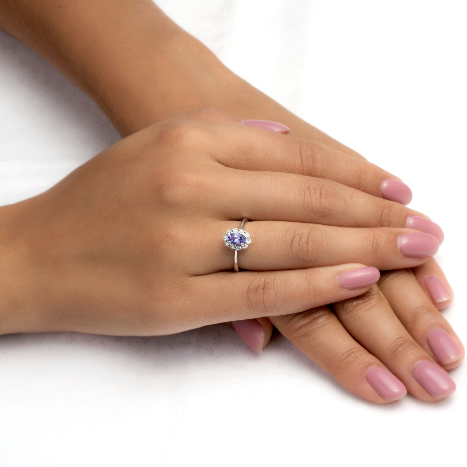 Pierścionek zaręczynowy z centralnym tanzanitem o masie 0,60 ct i szlifie owalnym oraz 10 diamentami o łącznej masie 0,04 ct, szlifie brylantowym, czystości SI2/H, wykonany z 14-karatowego białego złota (próba 585).